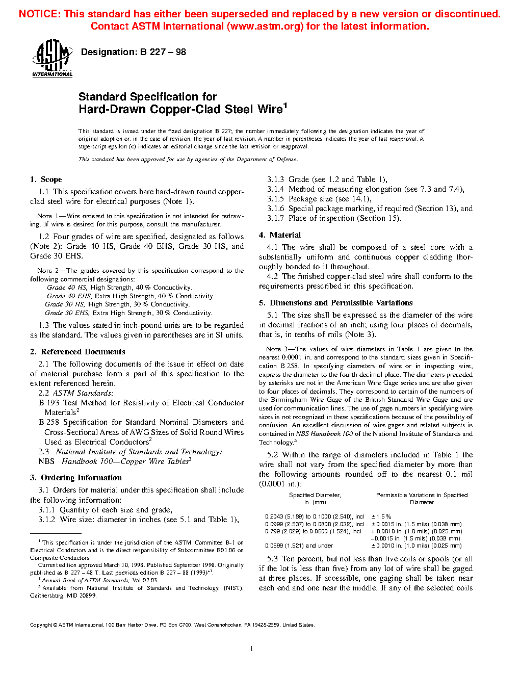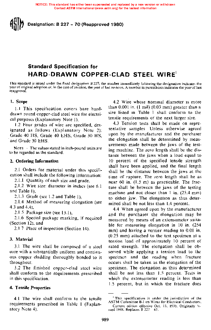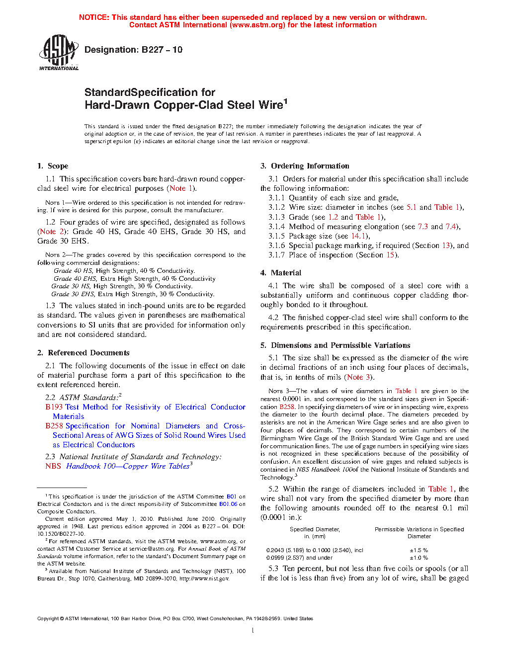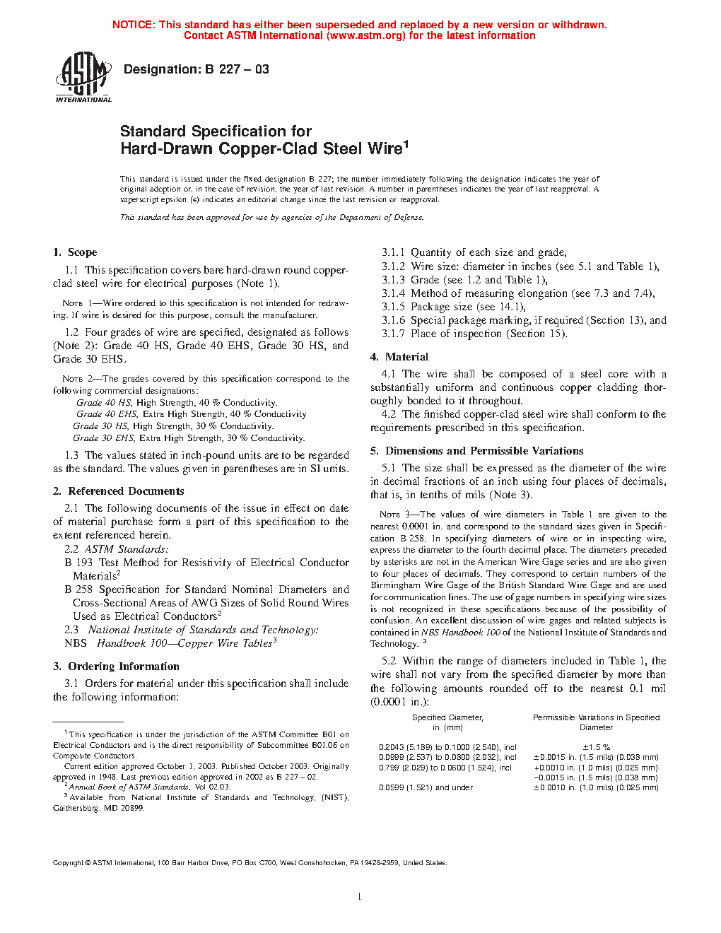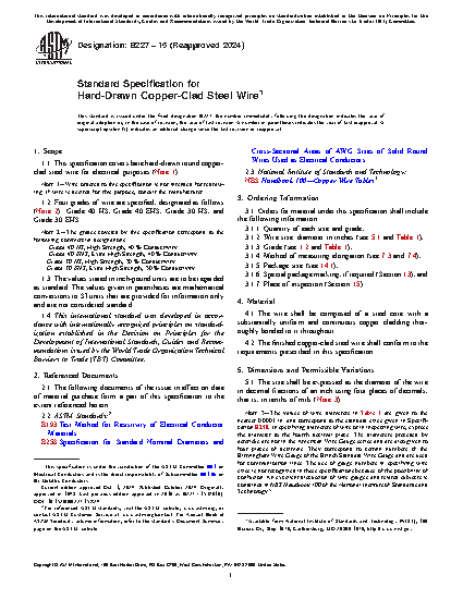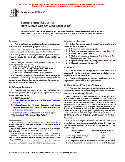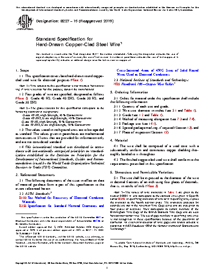 1.1 This specification covers bare hard-drawn round copper-clad steel wire for electrical purposes (Note 1).