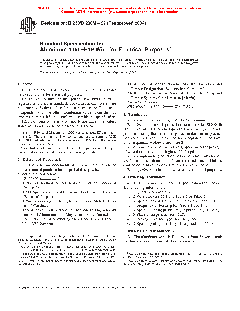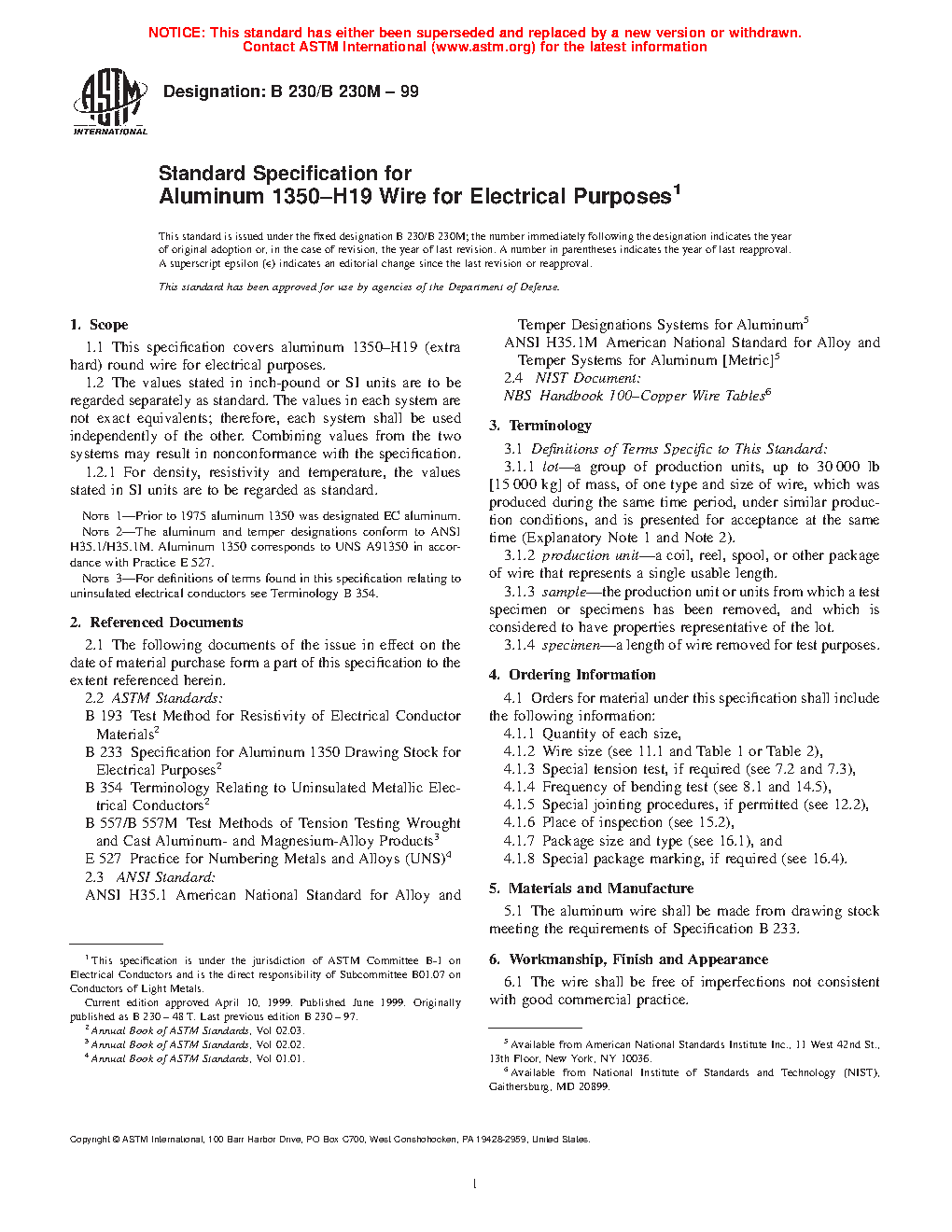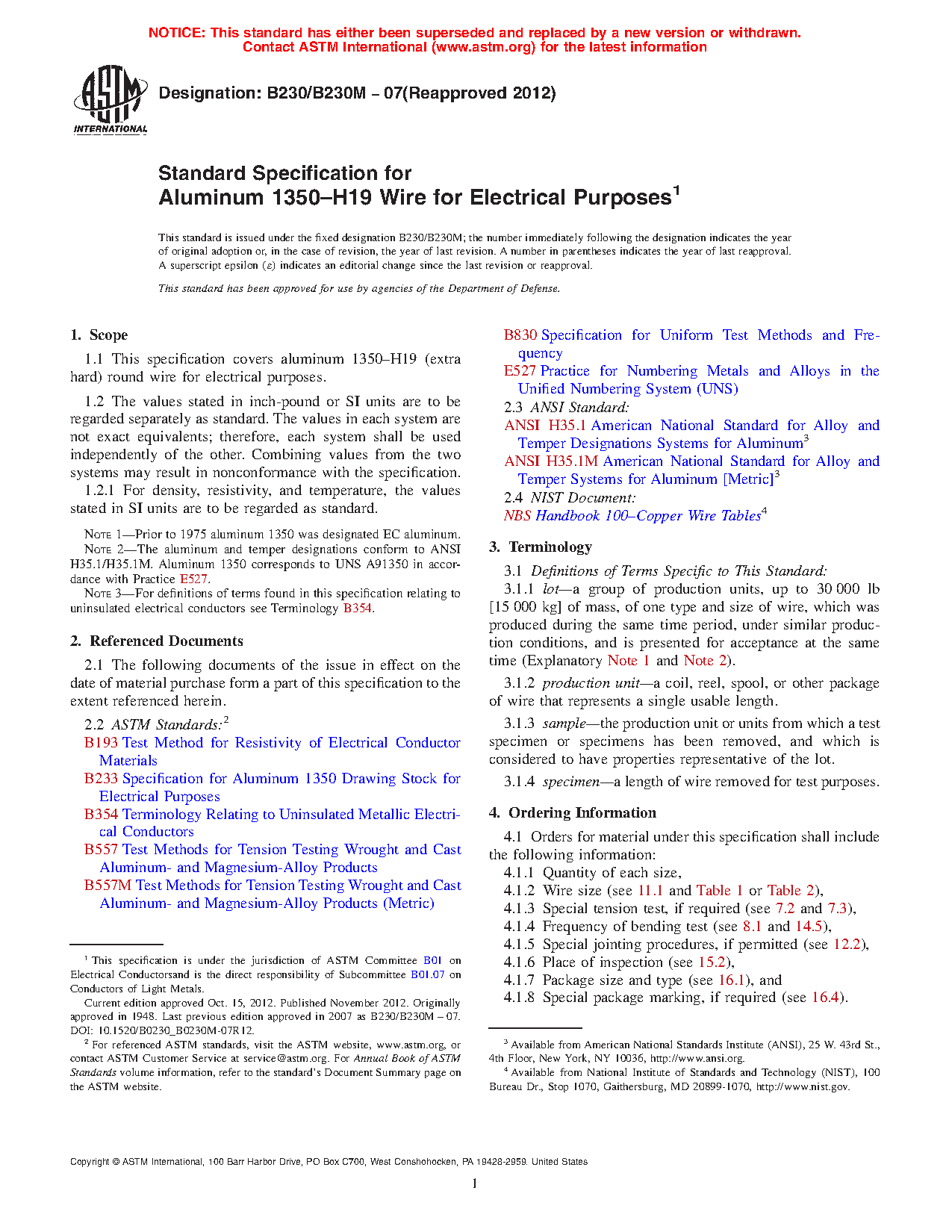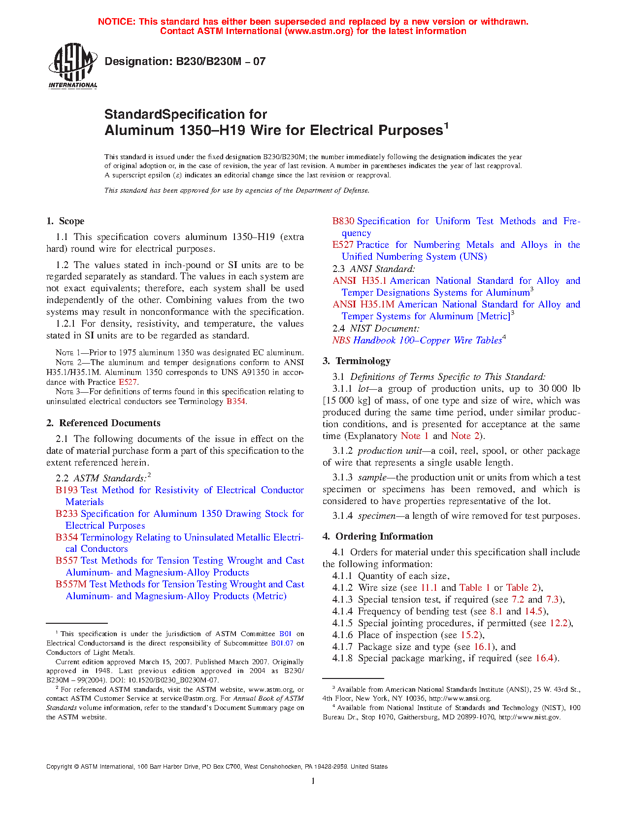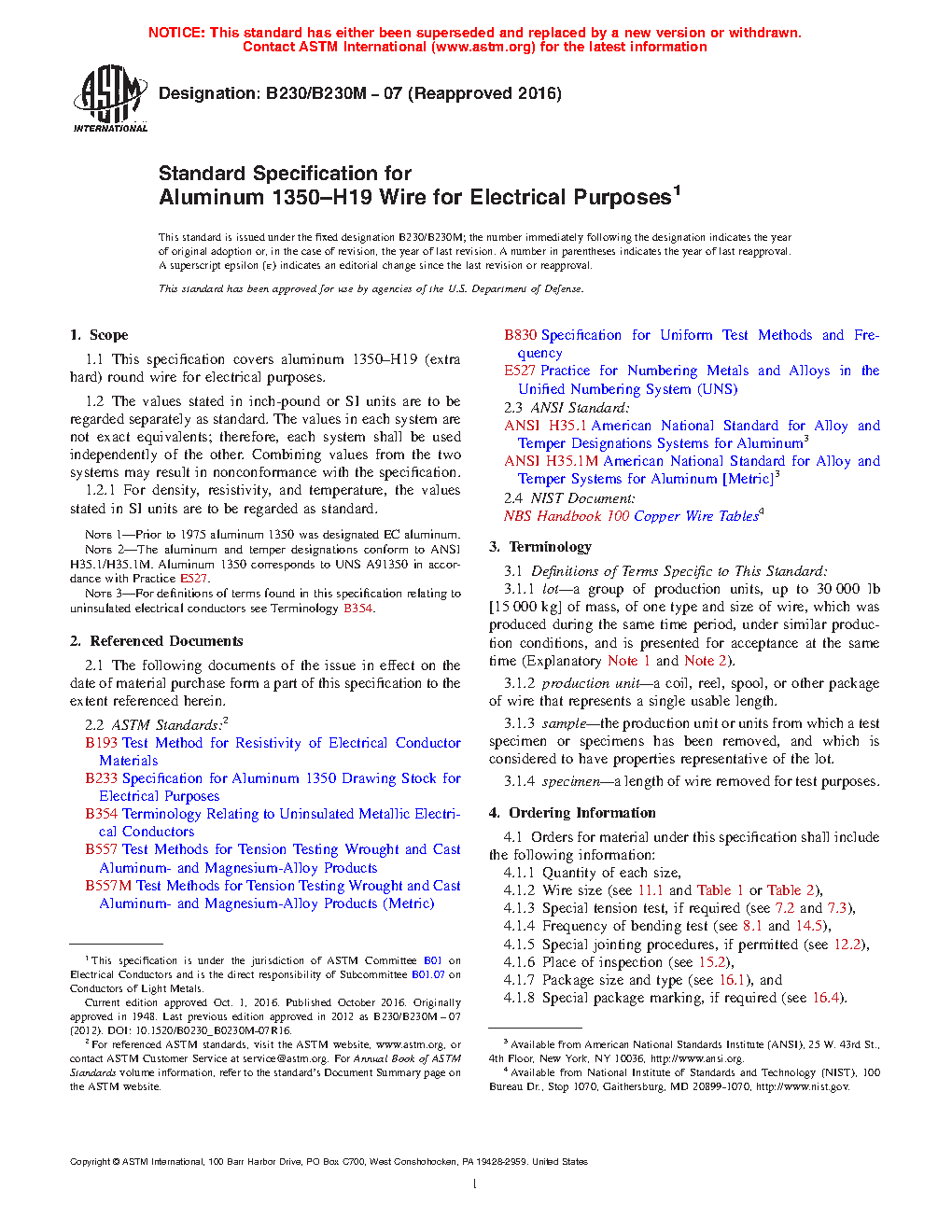 1.1 This specification covers aluminum 1350-H19 (extra hard) round wire for electrical purposes.