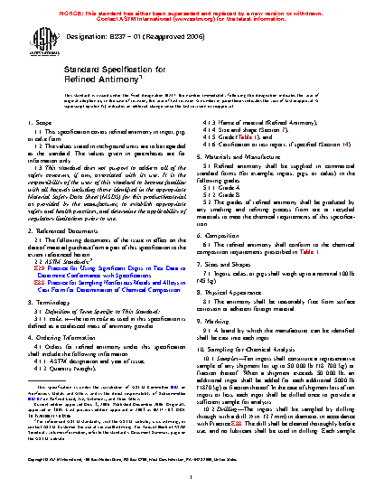 This specification covers refined antimony in ingot, pig, or cake form. Refined antimony shall be supplied in commercial standard forms in Grade A and Grade B. The grades of refined antimony shall be produced by any smelting and refining process from ore or recycled materials to meet the chemical requirements of this specification. The refined antimony shall conform to the required chemical composition of arsenic, sulfur, lead, and others. The antimony shall be reasonably free from surface corrosion or adherent foreign material.