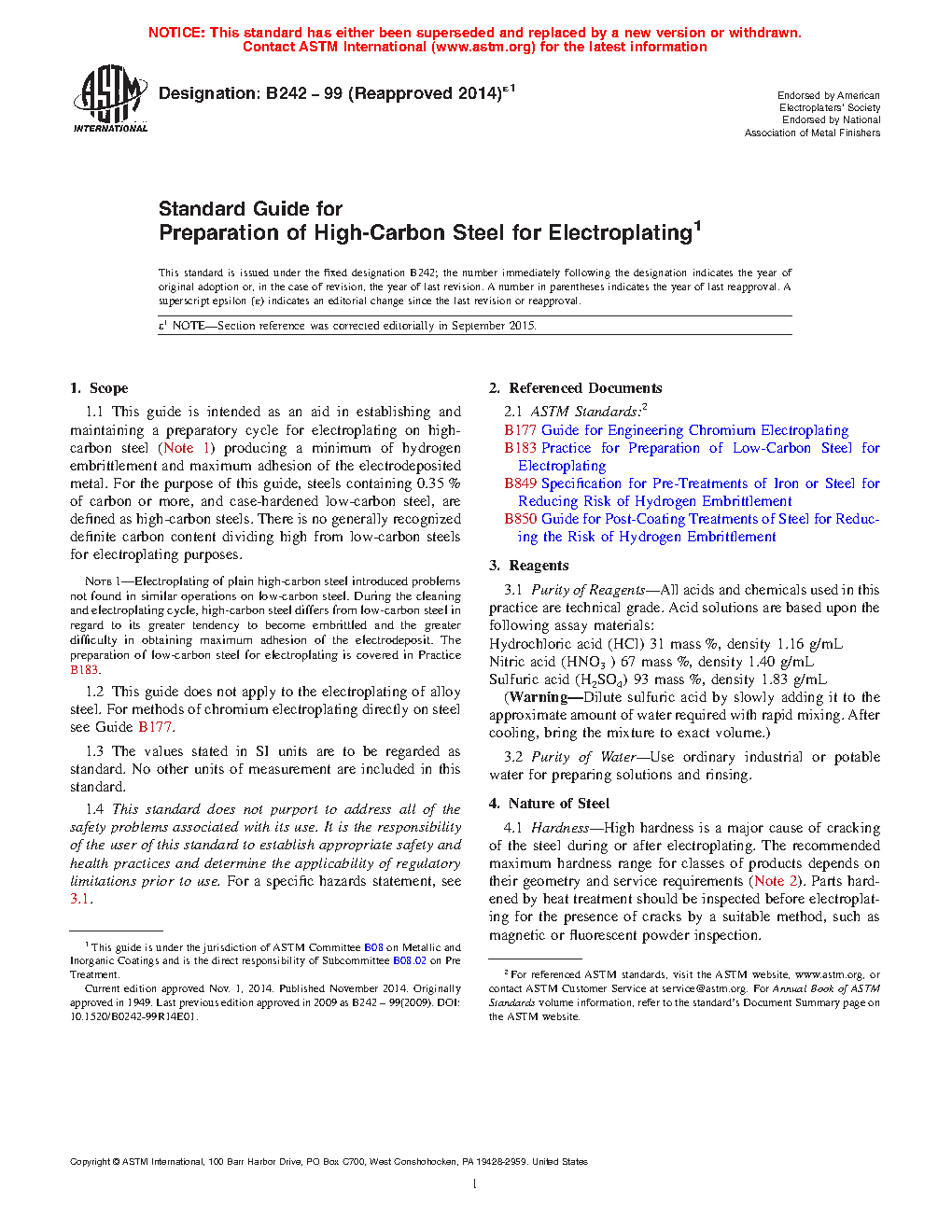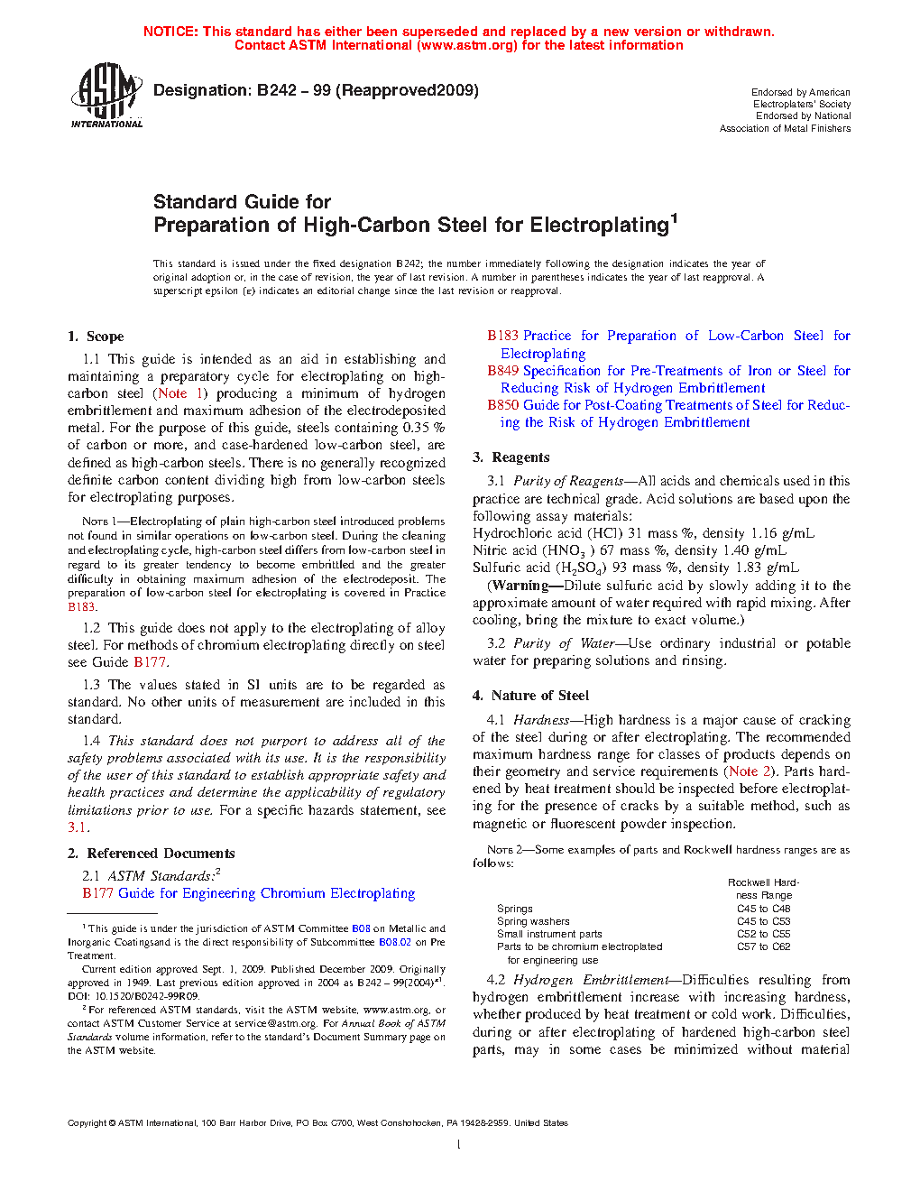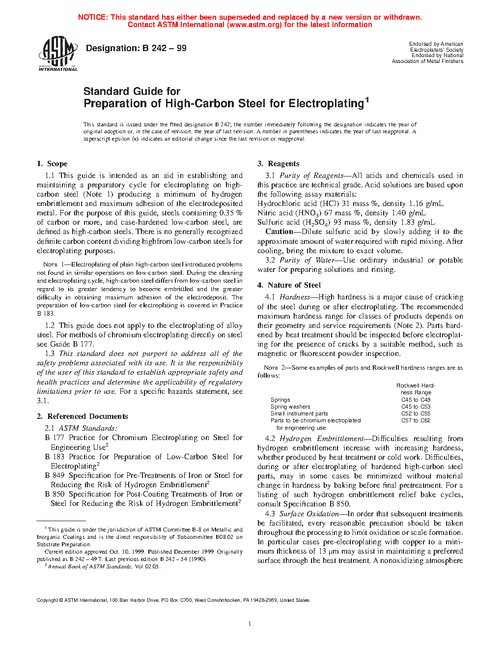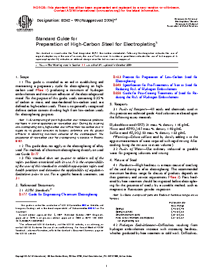 Note 1-Electroplating of plain high-carbon steel introduced problems not found in similar operations on low-carbon steel. During the cleaning and electroplating cycle, high-carbon steel differs from low-carbon steel in regard to its greater tendency to become embrittled and the greater difficulty in obtaining maximum adhesion of the electrodeposit. The preparation of low-carbon steel for electroplating is covered in Practice B183.1.2 This practice does not apply to the electroplating of alloy steel. For methods of chromium electroplating directly on steel see Practice B177.