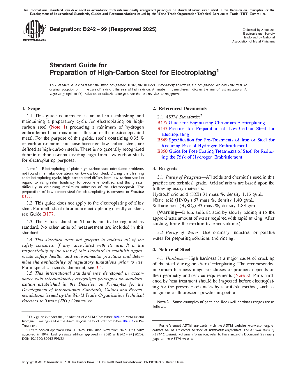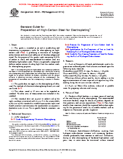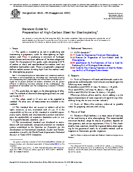 1.1 This practice is intended as an aid in establishing and maintaining a preparatory cycle for electroplating on high-carbon steel (Note 1) producing a minimum of hydrogen embrittlement and maximum adhesion of the electrodeposited metal. For the purpose of this practice, steels containing 0.35% of carbon or more, and case-hardened low-carbon steel, are defined as high-carbon steels. There is no generally recognized definite carbon content dividing high- from low-carbon steels for electroplating purposes.