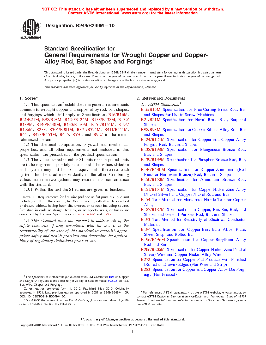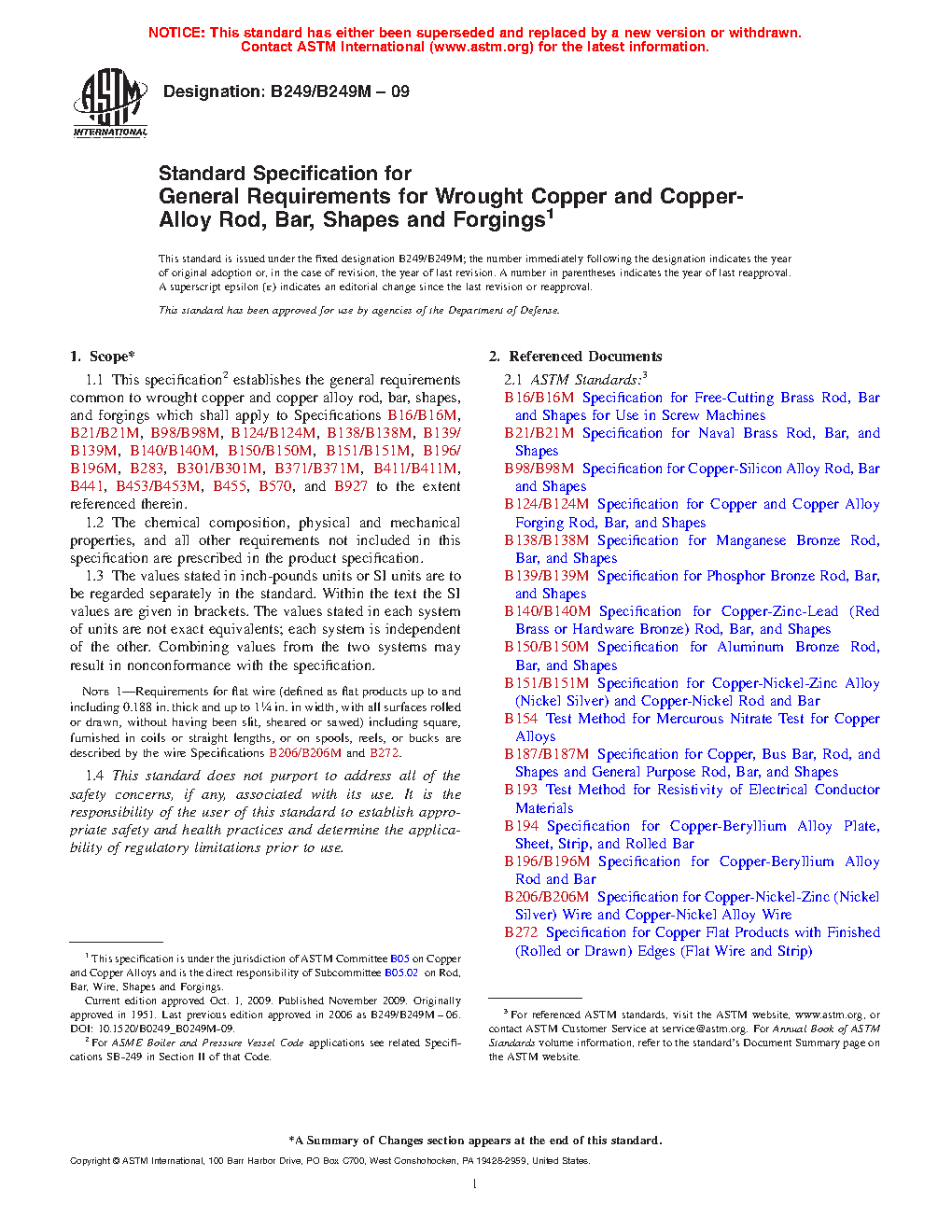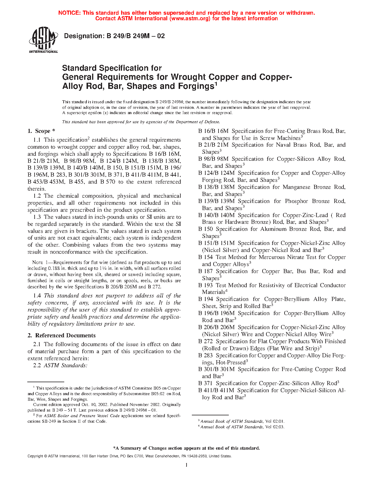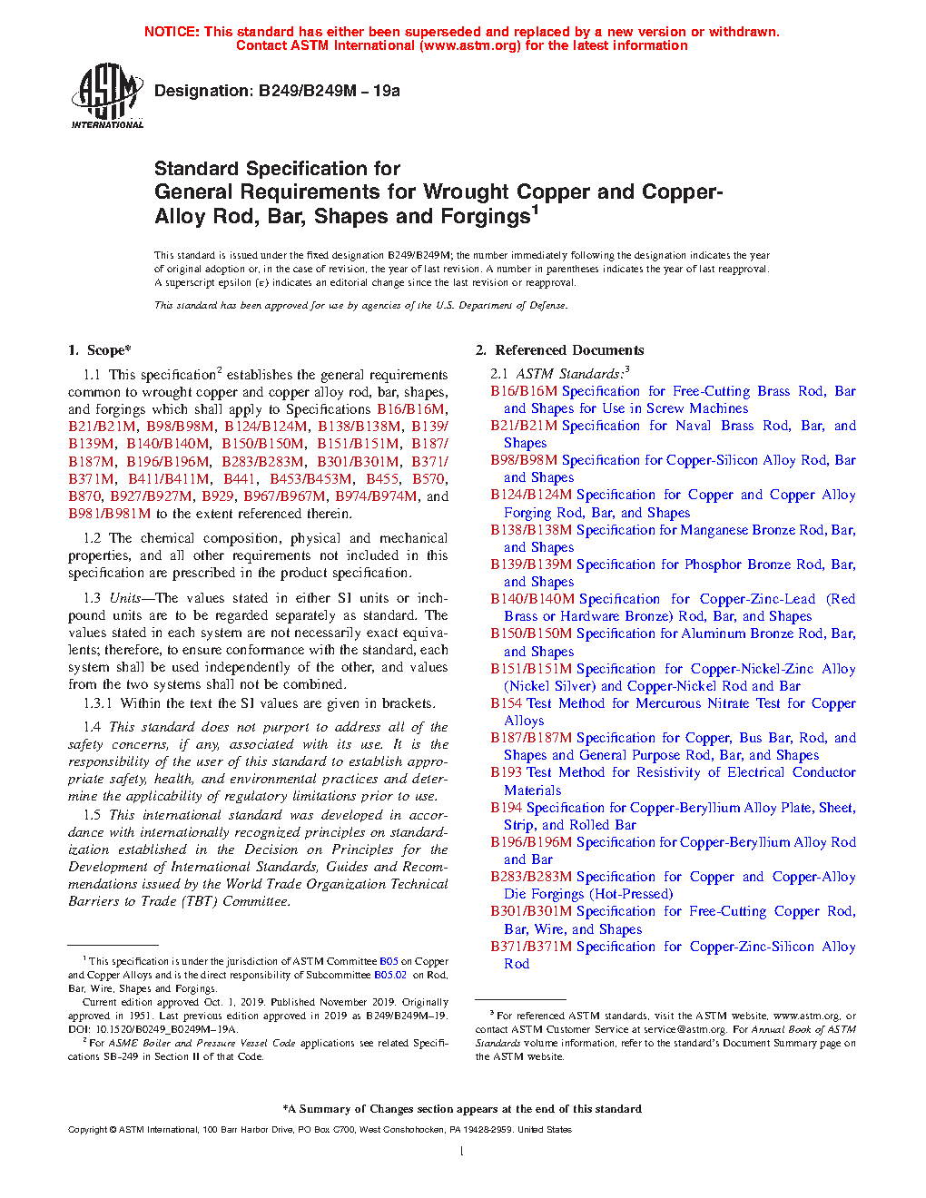 1.1 This specification establishes the general requirements common to wrought copper and copper alloy rod, bar, shapes, and forgings which shall apply to Specifications B16/B16M, B21/B21M, B98/B98M, B124/B124M, B138/B138M, B139/B139M, B140/B140M, B150/B150M, B151/B151M, B196/B196M, B283, B301/B301M, B371/B371M, B411/B411M, B441, B453/B453M, B455, B570, and B927 to the extent referenced therein.