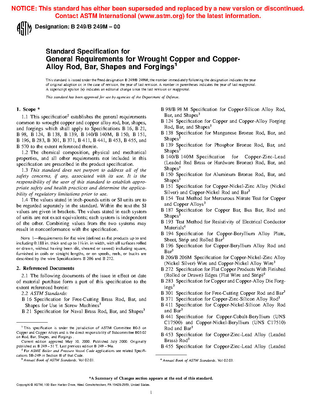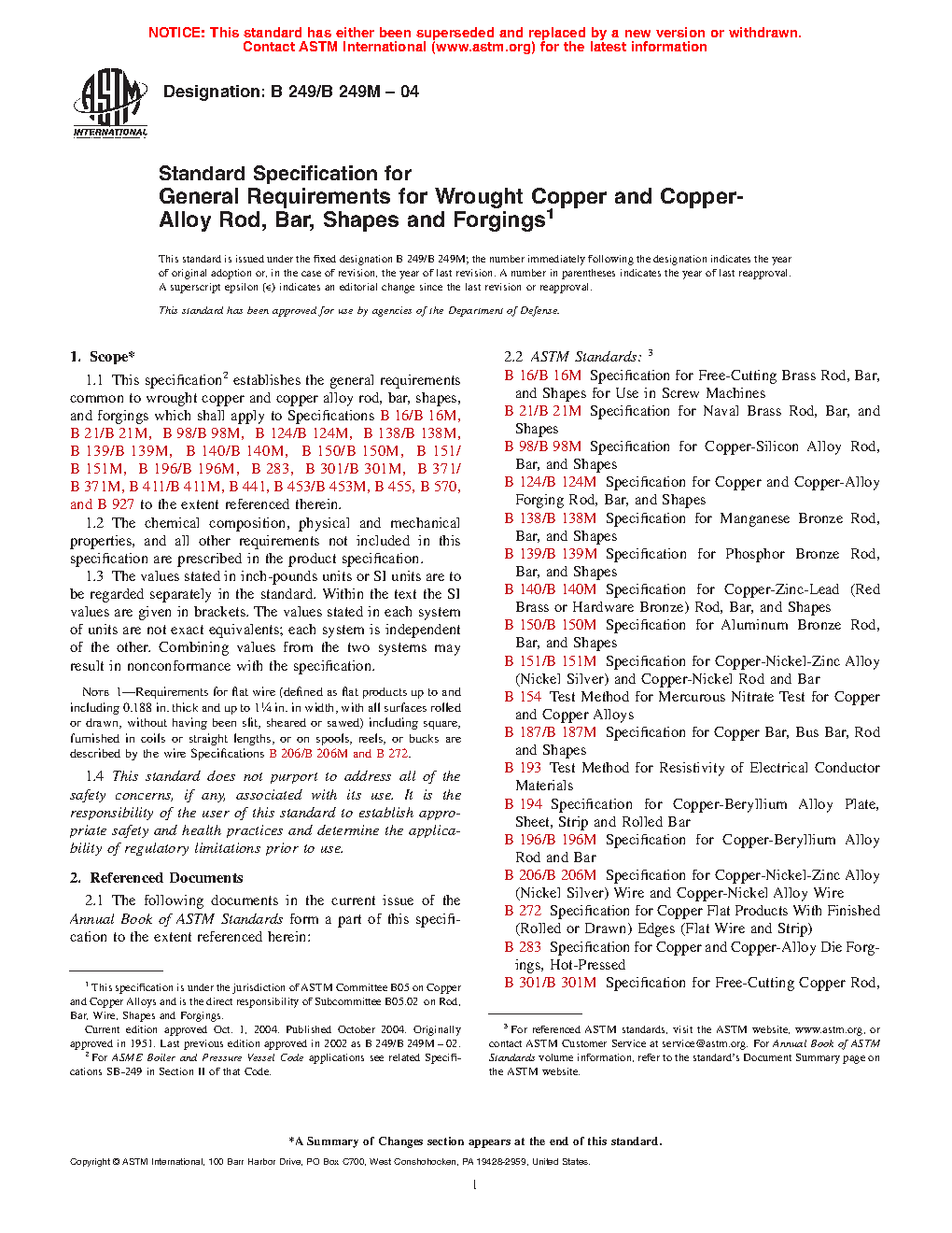 1.1 This specification2 establishes the general requirements common to wrought copper and copper alloy rod, bar, shapes, and forgings which shall apply to Specifications B16/B16M, B21/B21M, B98/B98M, B124/B124M, B138/B138M, B139/B139M, B140/B140M, B150/B150M, B151/B151M, B187/B187M, B196/B196M, B283/B283M, B301/B301M, B371/B371M, B411/B411M, B441, B453/B453M, B455, B570, B870, B927/B927M, B929, B967/B967M, and B974/B974M to the extent referenced therein.
