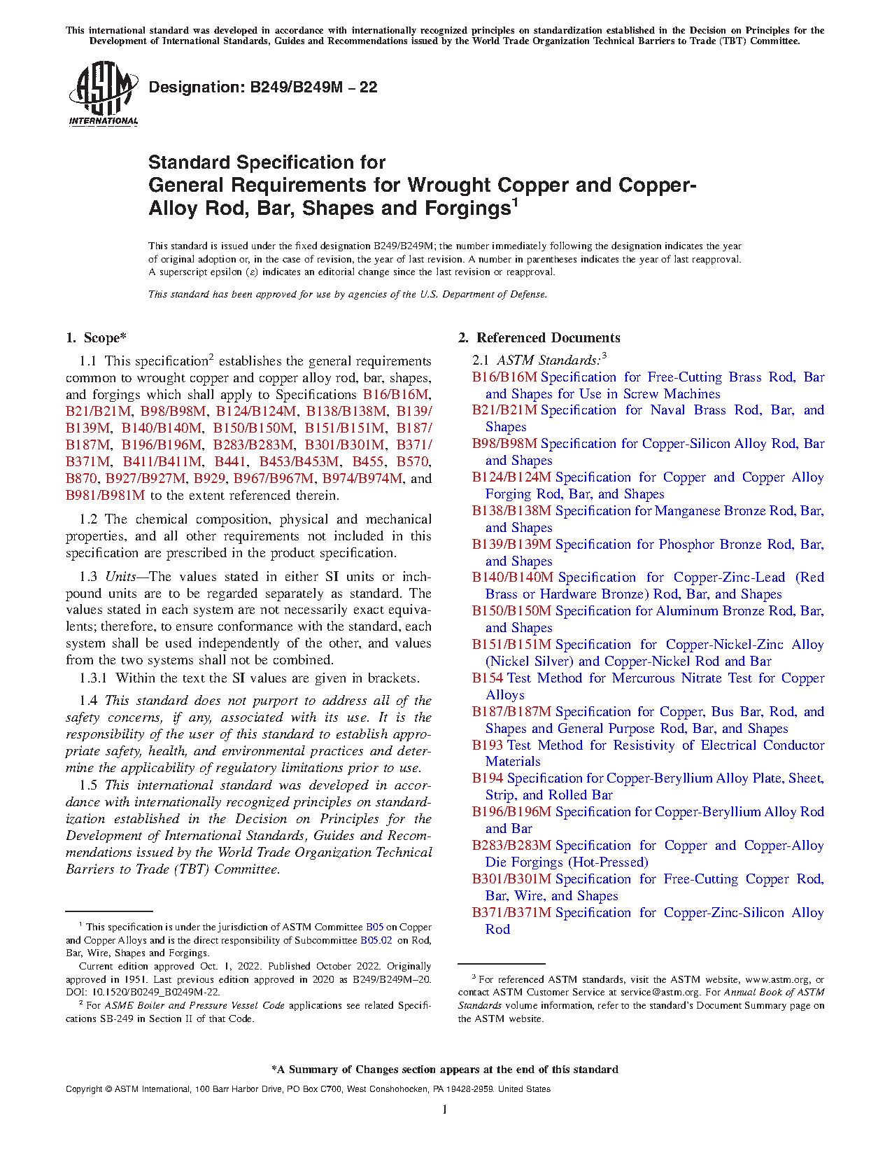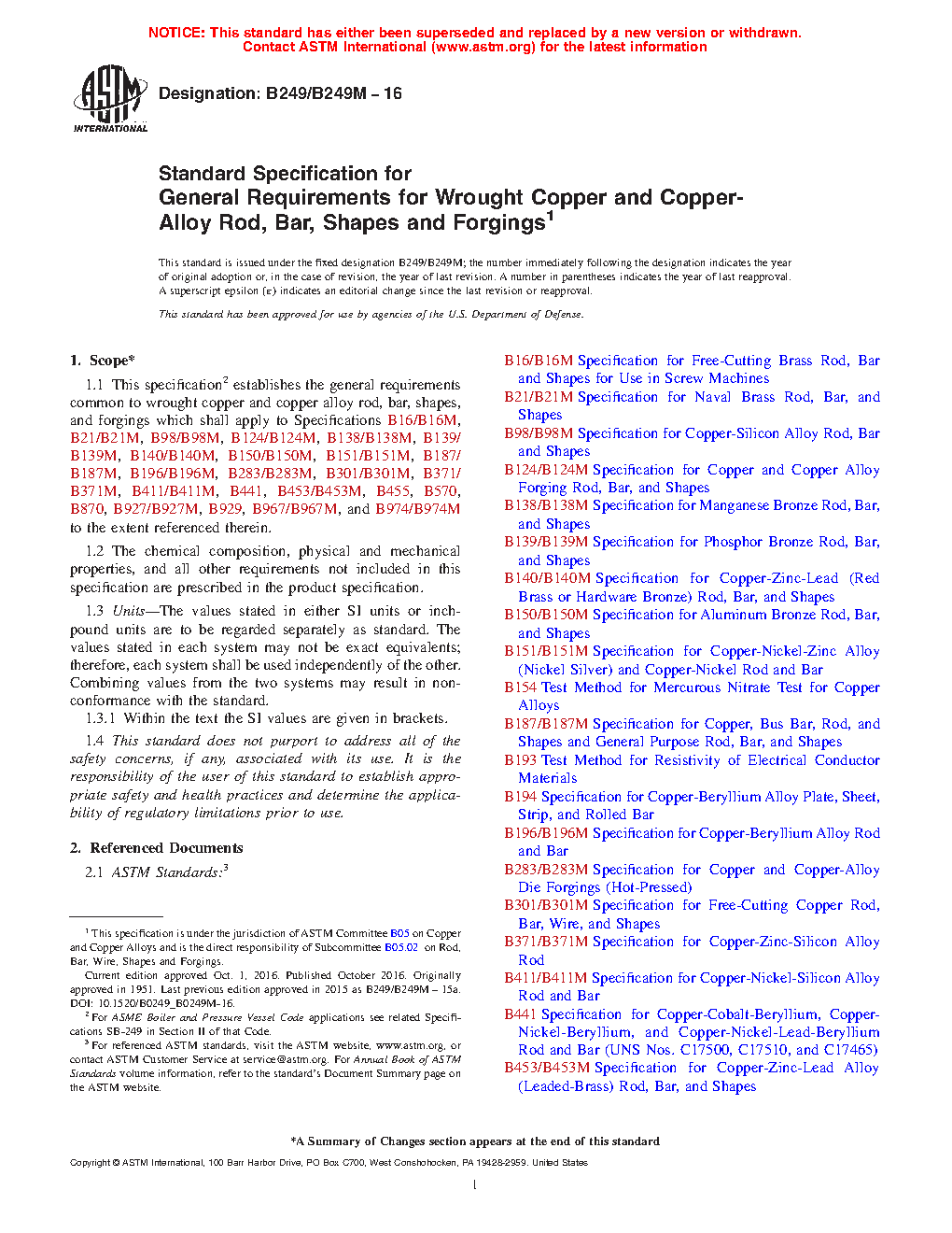1.1 This specification2 establishes the general requirements common to wrought copper and copper alloy rod, bar, shapes, and forgings which shall apply to Specifications B16/B16M, B21/B21M, B98/B98M, B124/B124M, B138/B138M, B139/B139M, B140/B140M, B150/B150M, B151/B151M, B187/B187M, B196/B196M, B283/B283M, B301/B301M, B371/B371M, B411/B411M, B441, B453/B453M, B455, B570, B870, B927/B927M, B929, B967/B967M, and B974/B974M to the extent referenced therein.