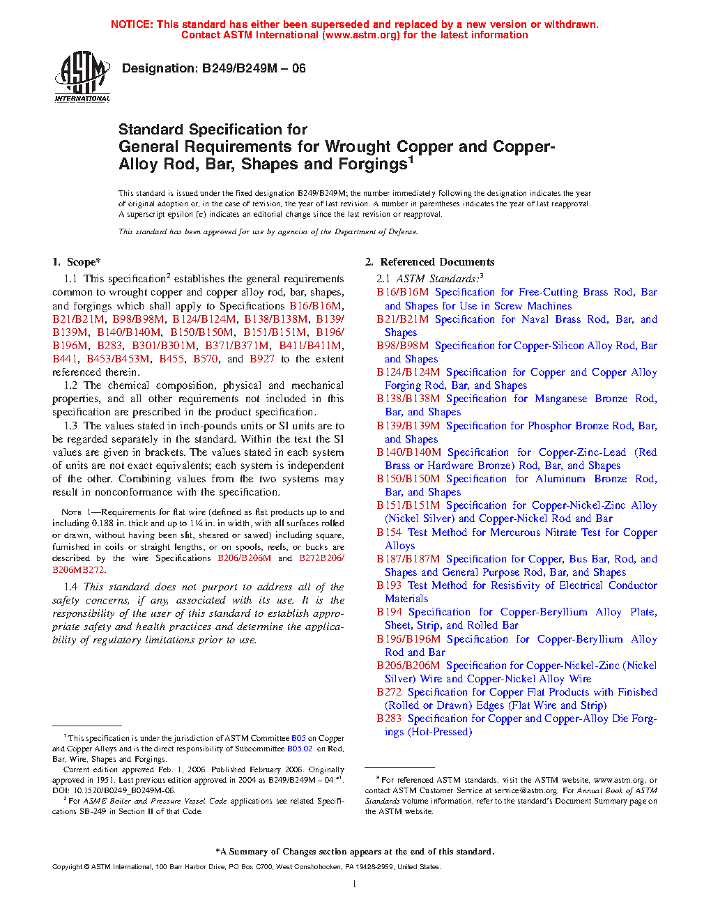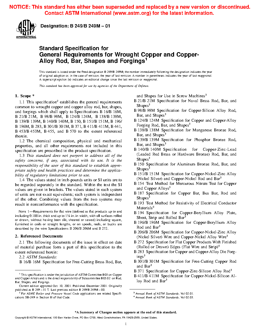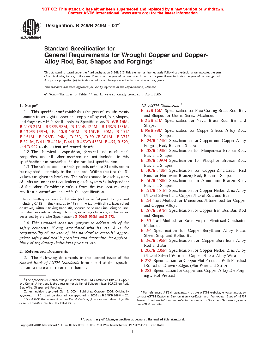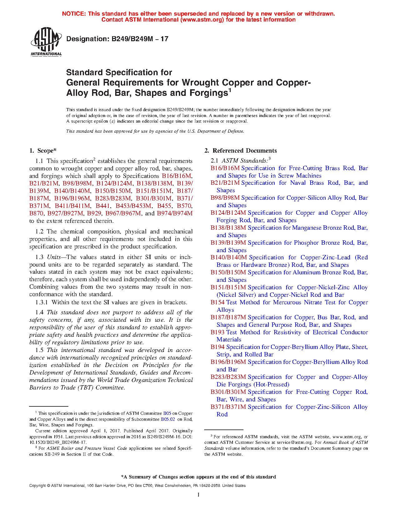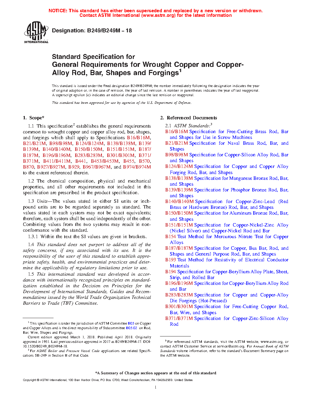 1.1 This specification2 establishes the general requirements common to wrought copper and copper alloy rod, bar, shapes, and forgings which shall apply to Specifications B16/B16M, B21/B21M, B98/B98M, B124/B124M, B138/B138M, B139/B139M, B140/B140M, B150/B150M, B151/B151M, B187/B187M, B196/B196M, B283/B283M, B301/B301M, B371/B371M, B411/B411M, B441, B453/B453M, B455, B570, B870, B927/B927M, B929, B967/B967M, B974/B974M, and B981/B981M to the extent referenced therein.