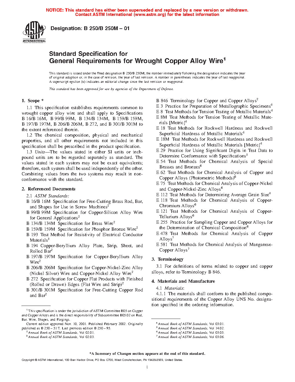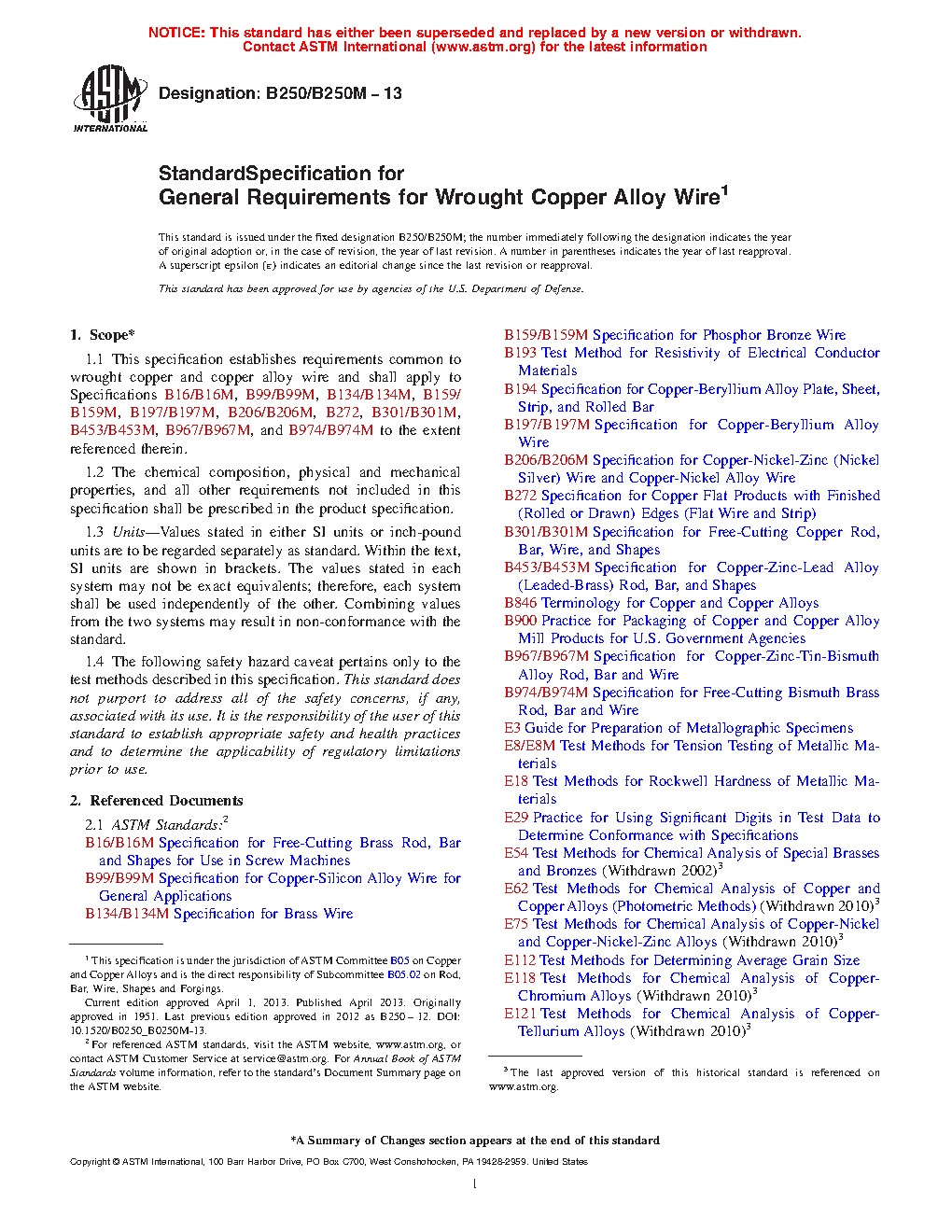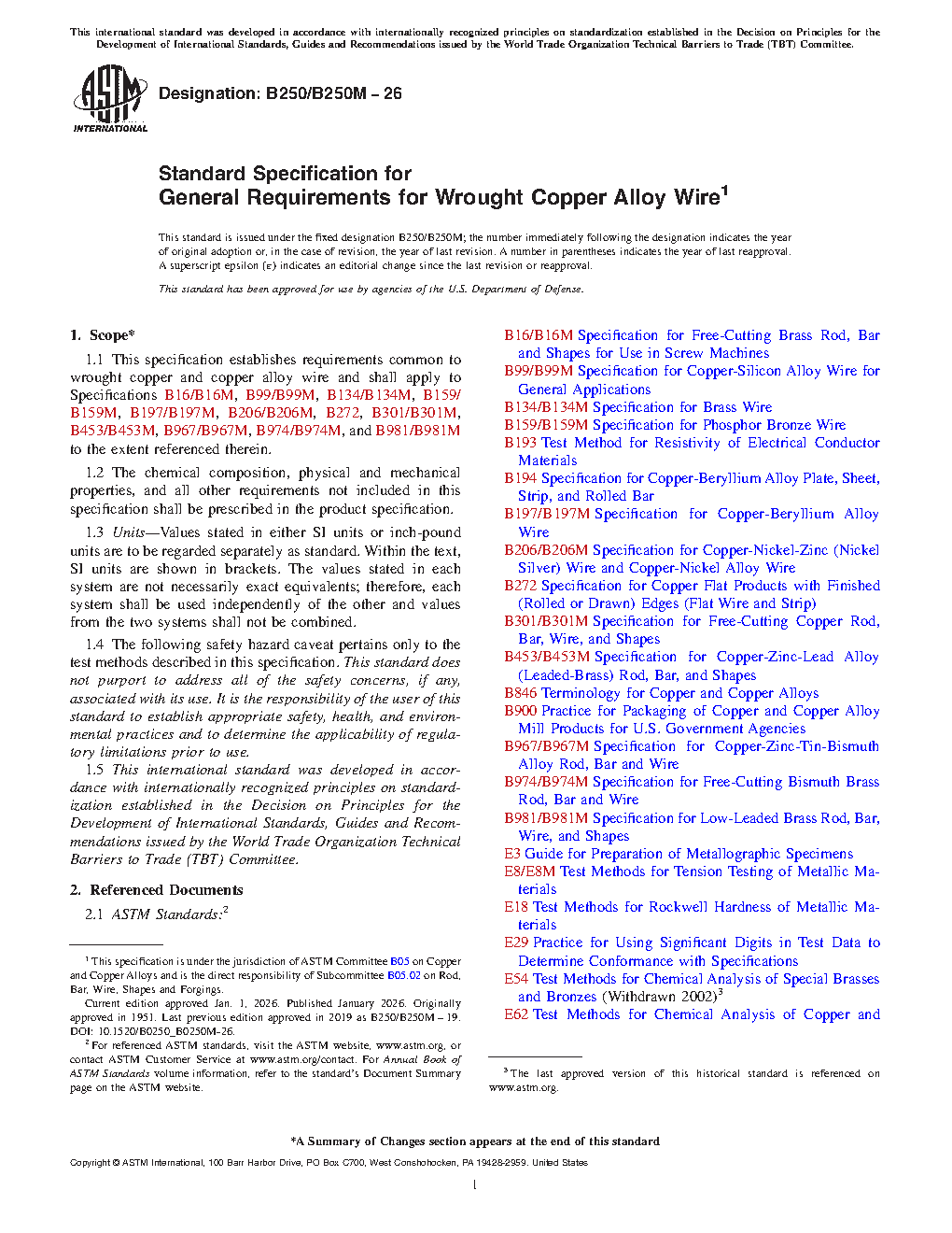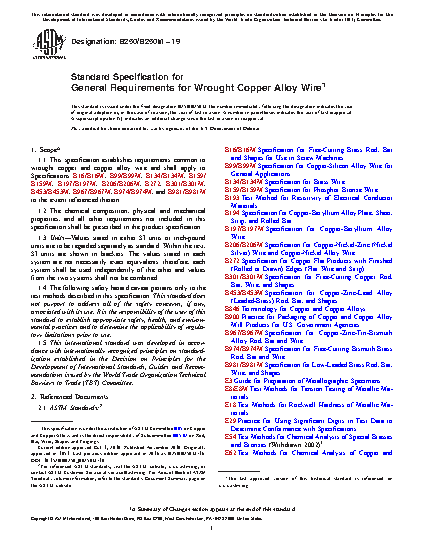 1.1 This specification establishes requirements common to wrought copper and copper alloy wire and shall apply to Specifications B16/B16M, B99/B99M, B134/B134M, B159/B159M, B197/B197M, B206/B206M, B272, B301/B301M, B453/B453M, B967/B967M, B974/B974M, and B981/B981M to the extent referenced therein.