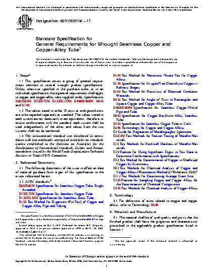 This specification covers a group of general requirements for wrought seamless copper and copper alloy tube. The material shall be produced by either hot or cold working operations, or both, and shall be finished, unless otherwise specified, by such cold working and annealing or heat treatment as necessary to meet the properties specified. Dimensional requirements such as wall thickness are specified. The sampling requirements including lot size, portion size, and selection of sample pieces are given. Requirements for chemical analysis, and tension, microscopical examination, Rockwell hardness, grain size, expansion (pin), mercurous nitrate, and electrical resistivity tests are detailed. The material shall conform to the prescribed chemical composition, hardness, electrical resistivity, tensile strength, yield strength, elongation, and grain size.