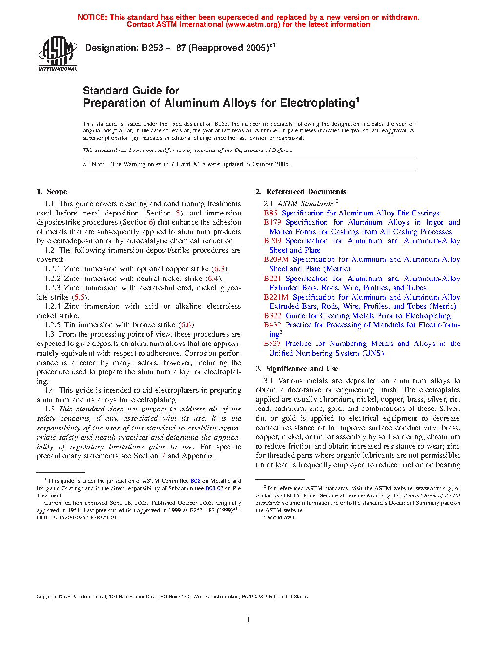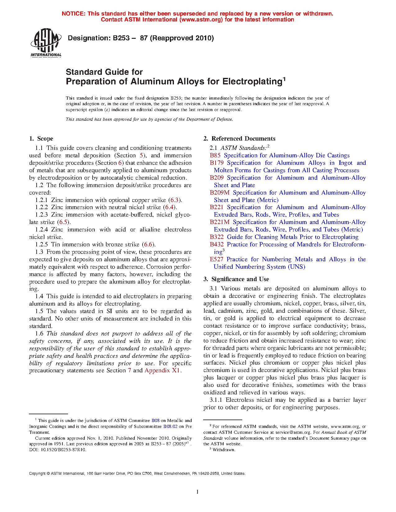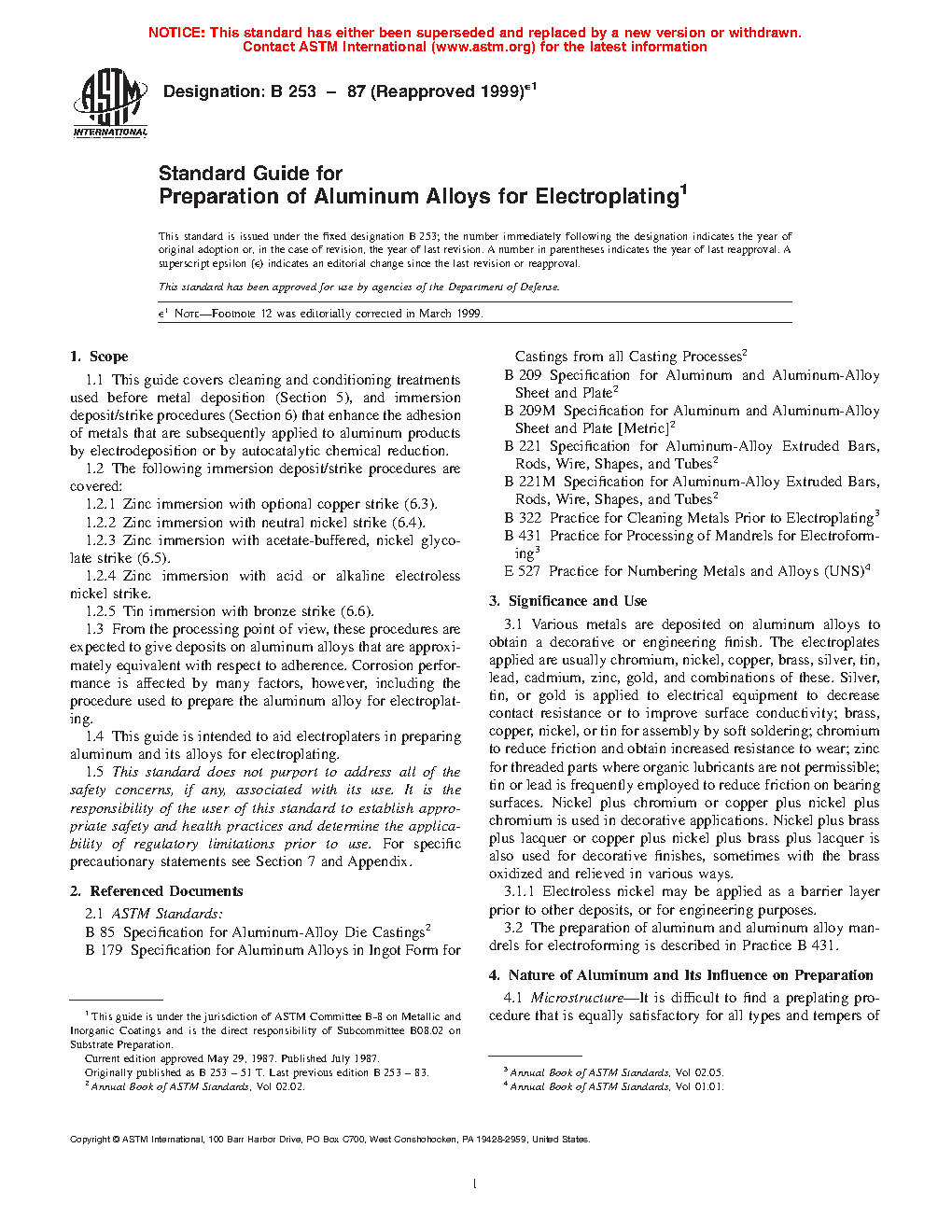 1.3 From the processing point of view, these procedures are expected to give deposits on aluminum alloys that are approximately equivalent with respect to adherence. Corrosion performance is affected by many factors, however, including the procedure used to prepare the aluminum alloy for electroplating.