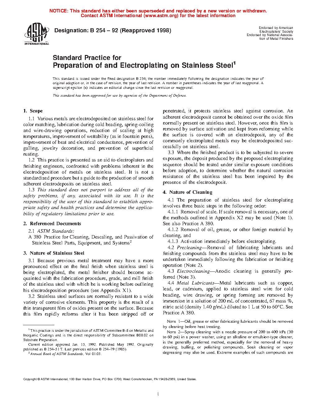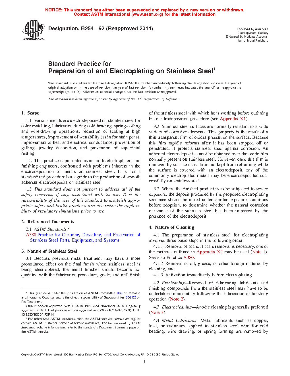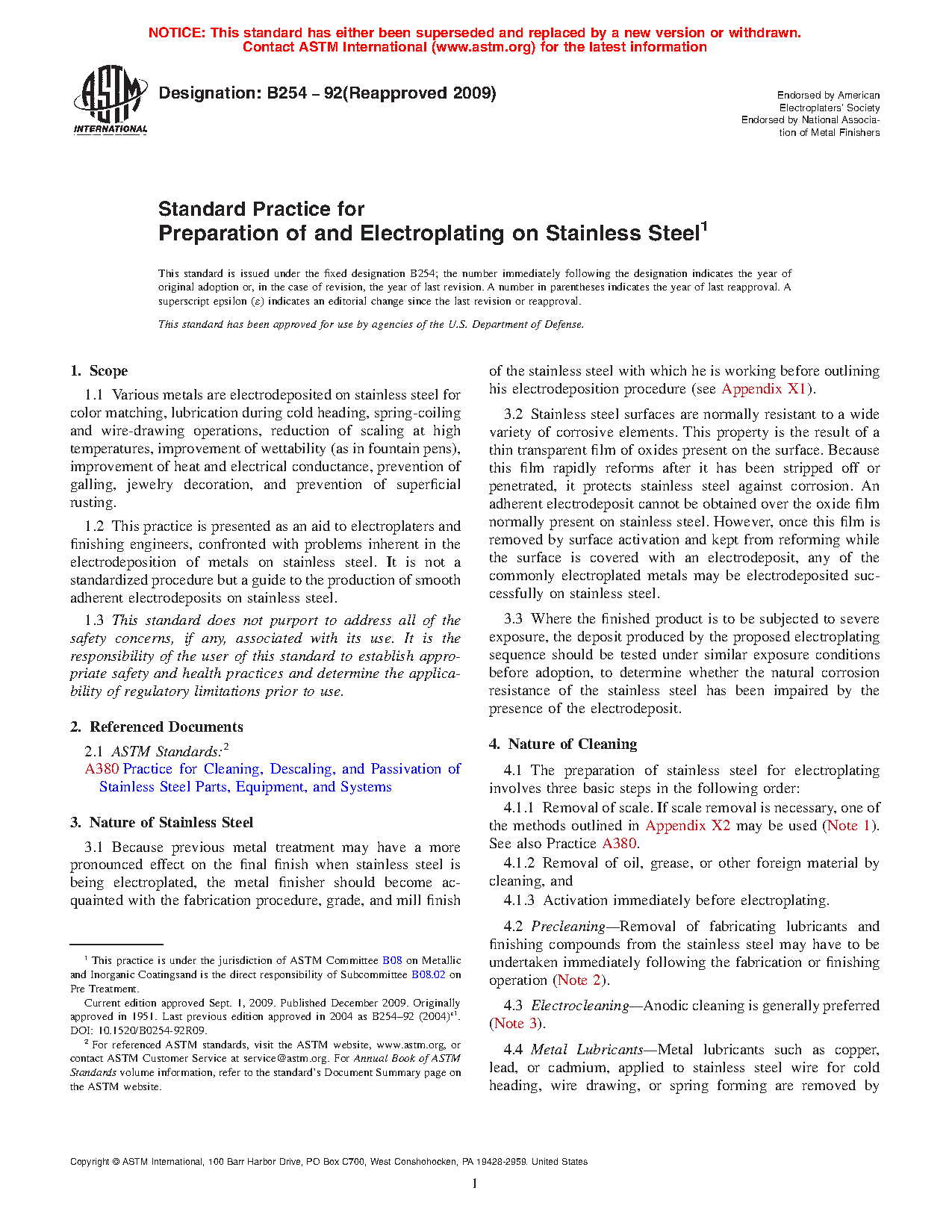 1.1 Various metals are electrodeposited on stainless steel for color matching, lubrication during cold heading, spring-coiling and wire-drawing operations, reduction of scaling at high temperatures, improvement of wettability (as in fountain pens), improvement of heat and electrical conductance, prevention of galling, jewelry decoration, and prevention of superficial rusting.