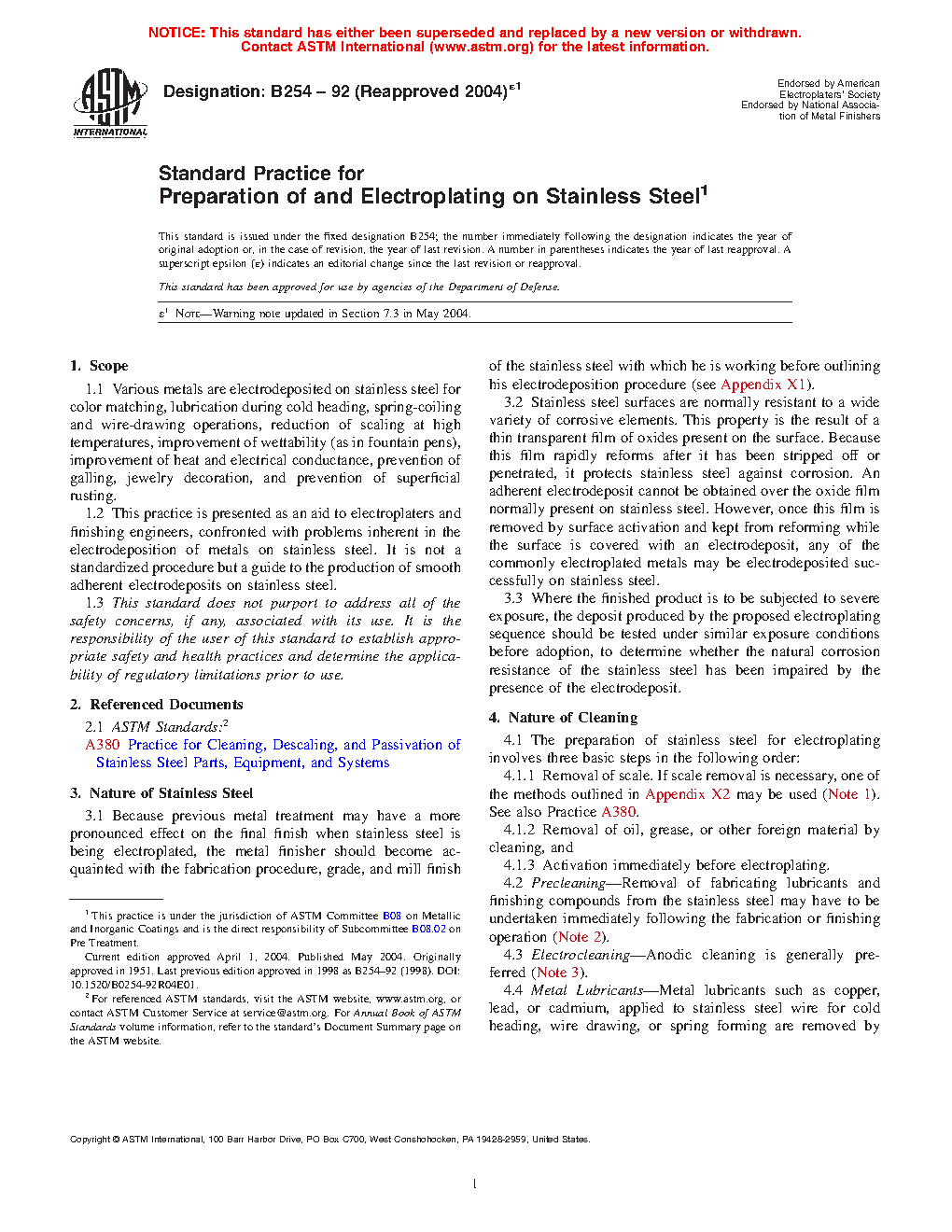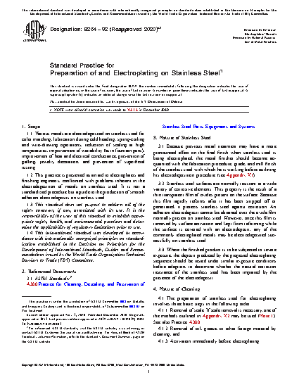 1.2 This practice is presented as an aid to electroplaters and finishing engineers, confronted with problems inherent in the electrodeposition of metals on stainless steel. It is not a standardized procedure but a guide to the production of smooth adherent electrodeposits on stainless steel.
