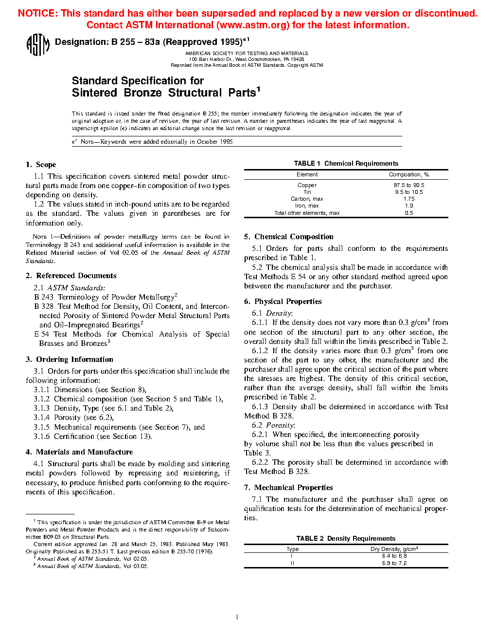 1.1 This specification covers sintered metal powder structural parts made from one copper-tin composition of two types depending on density.
