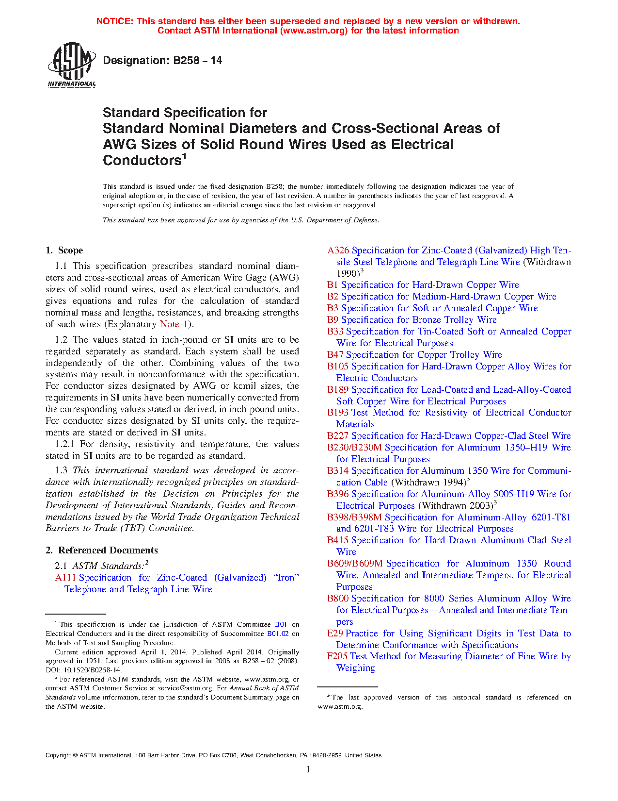 1.1 This specification prescribes standard nominal diameters and cross-sectional areas of American Wire Gage (AWG) sizes of solid round wires, used as electrical conductors, and gives equations and rules for the calculation of standard nominal mass and lengths, resistances, and breaking strengths of such wires (Explanatory Note 1).