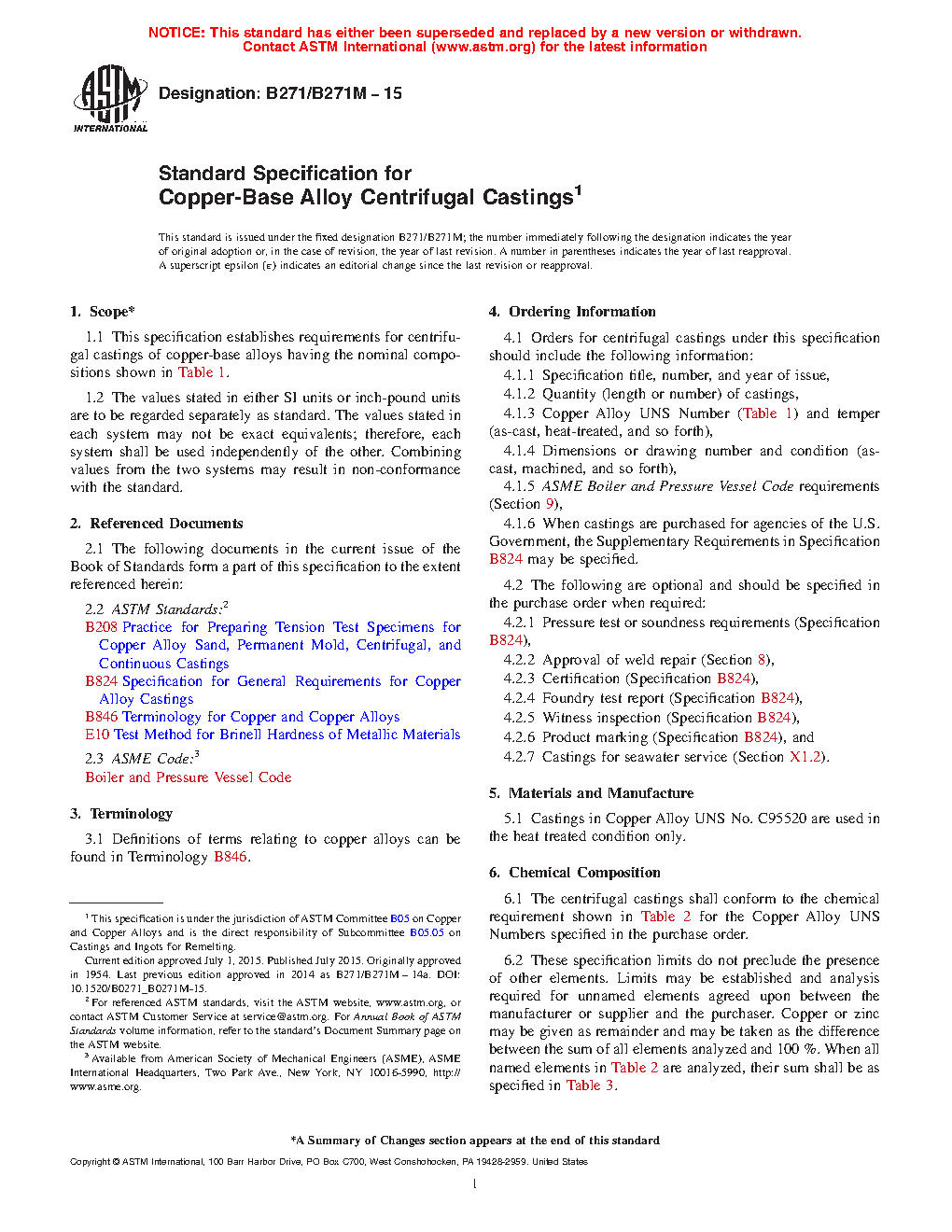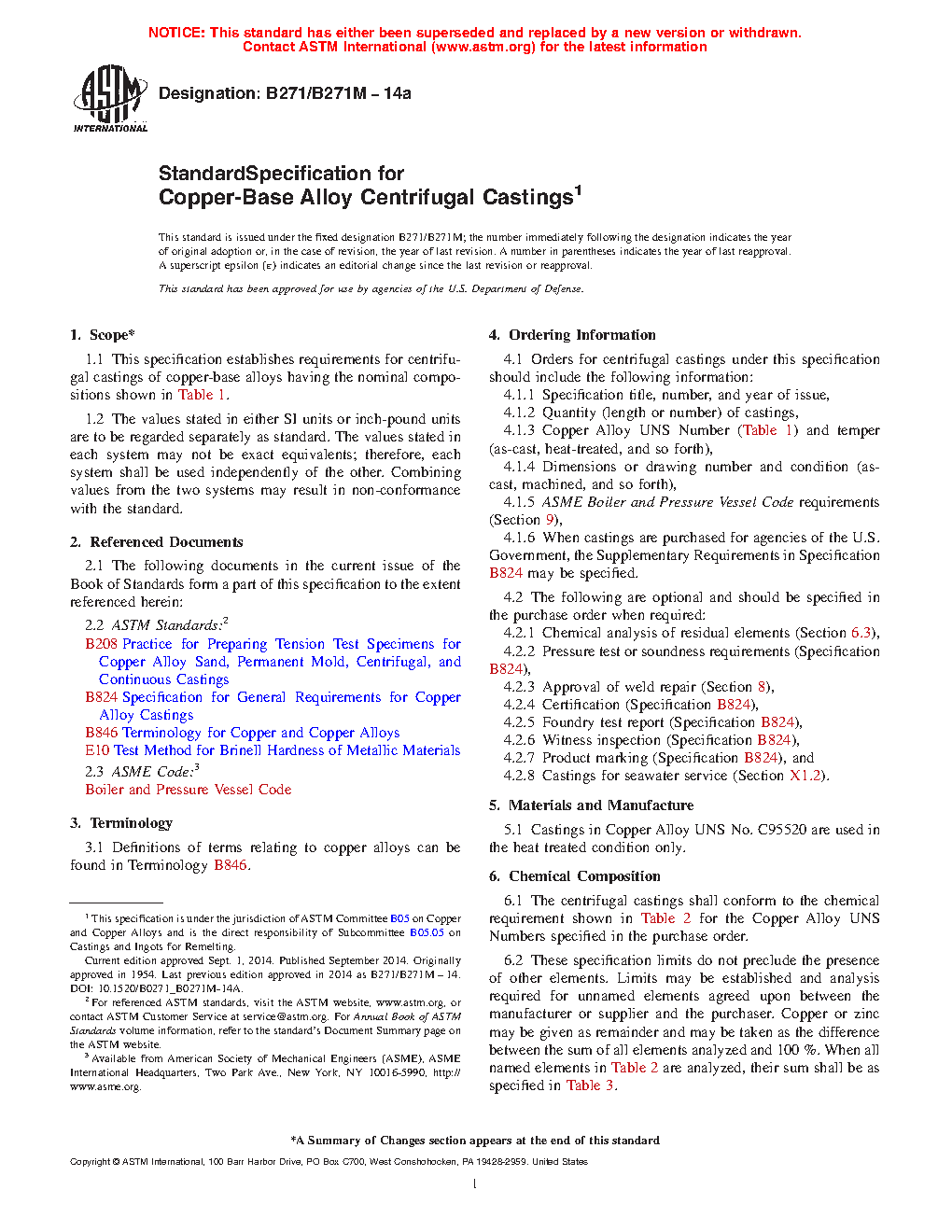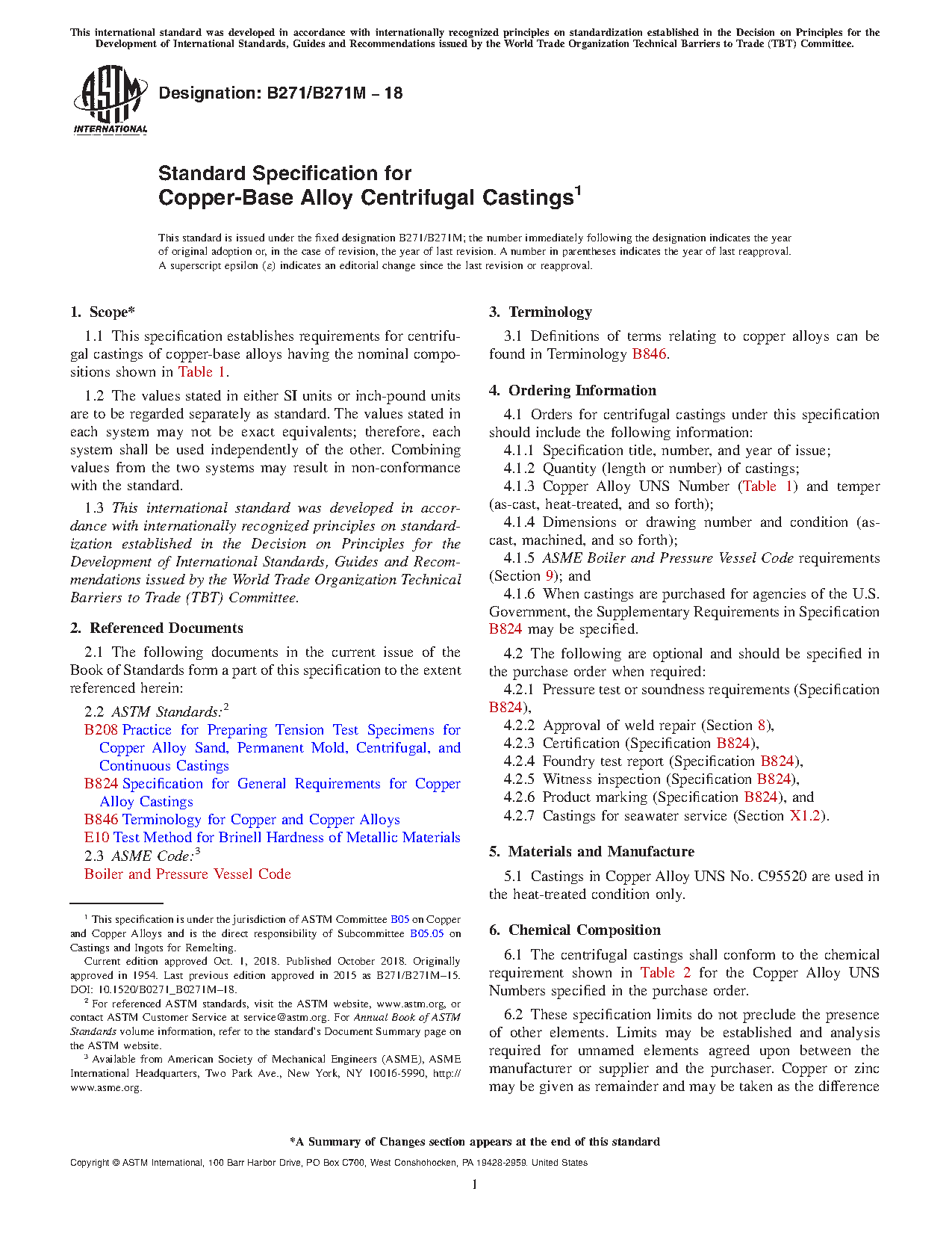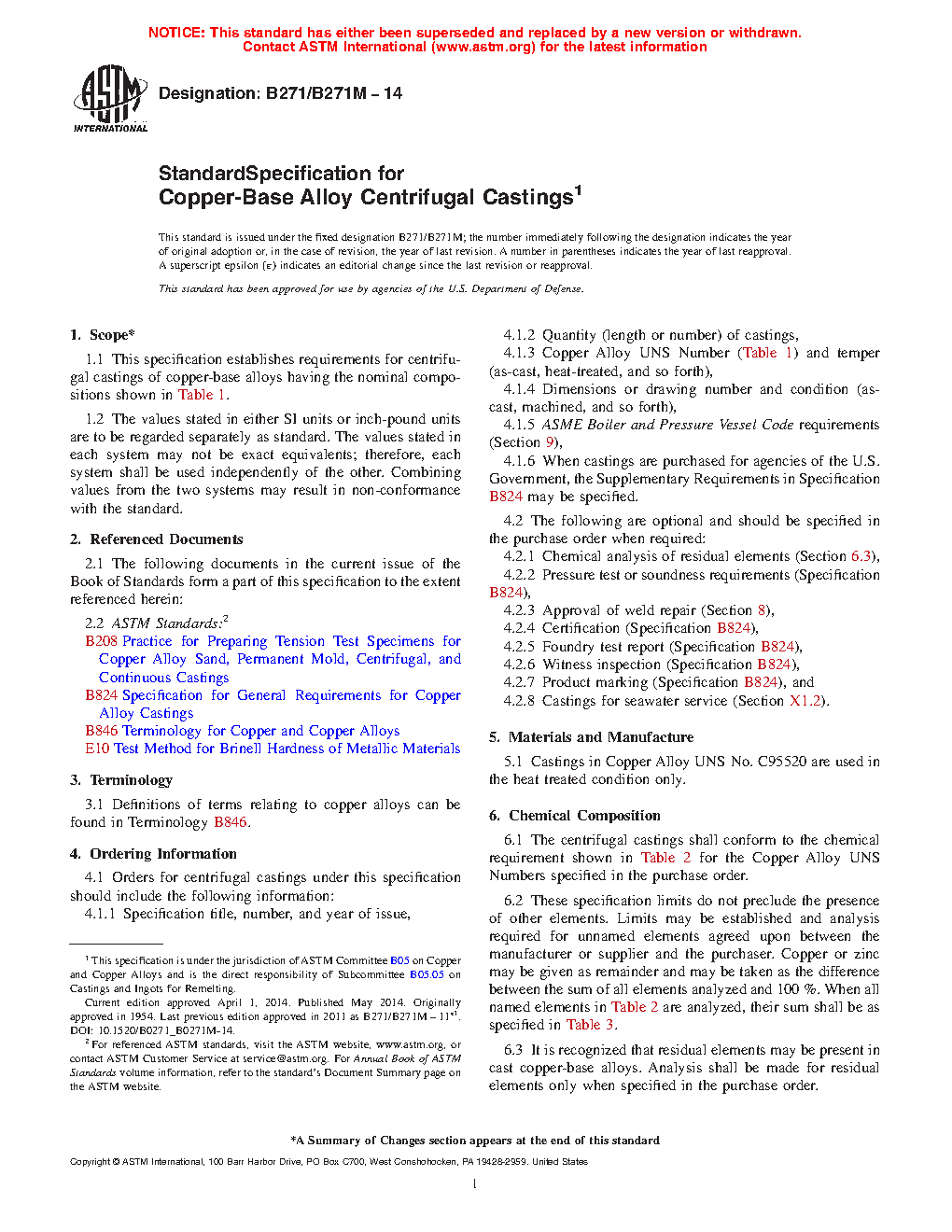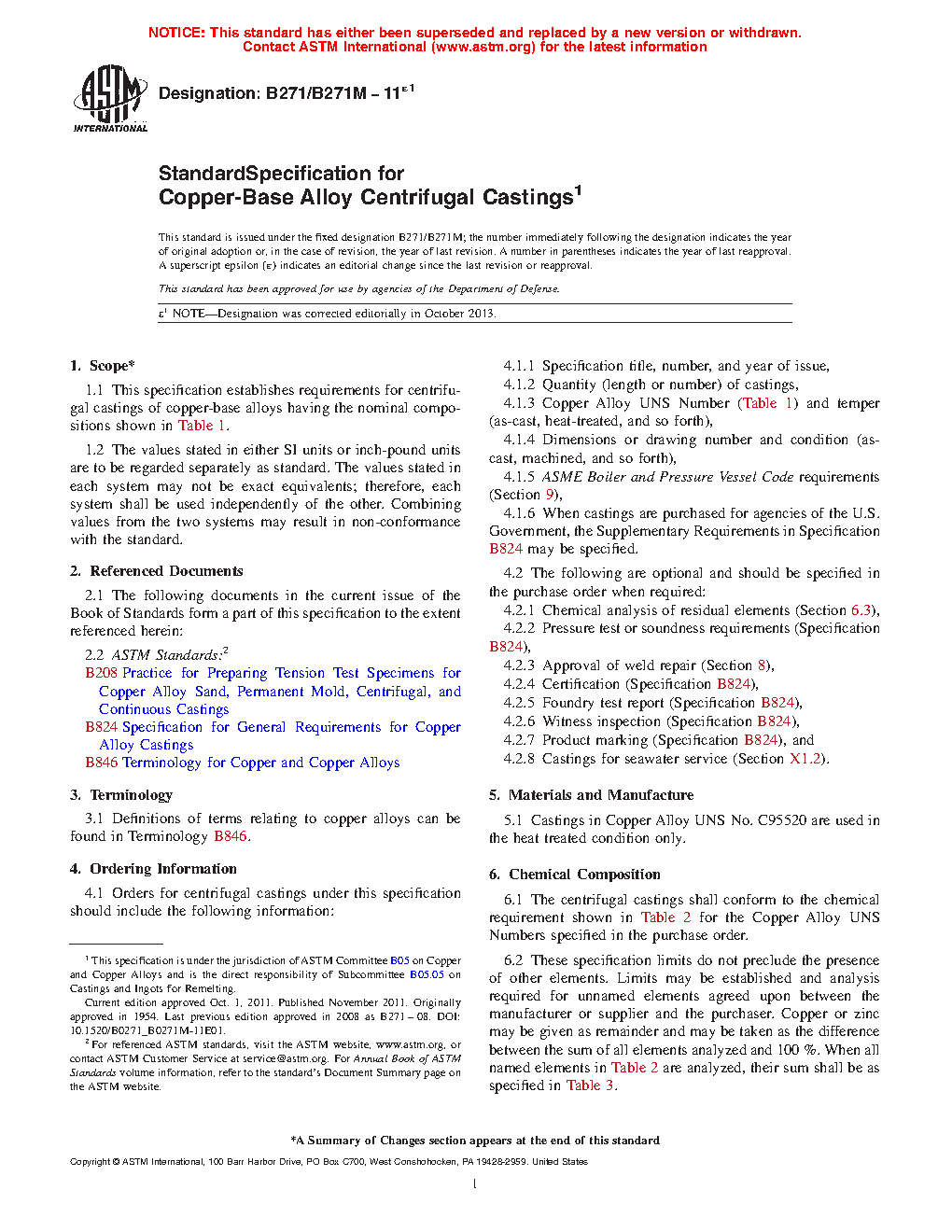 This specification establishes the requirements for copper-based brass or bronze centrifugal castings. Mechanical properties are determined from test bar castings and should meet the requirements listed herein. Brinell hardness readings should be taken on the grip end of tension test bars. All castings should not be repaired by welding without customer approval. UNS C95520 copper alloy castings are used in the heat treated condition only.