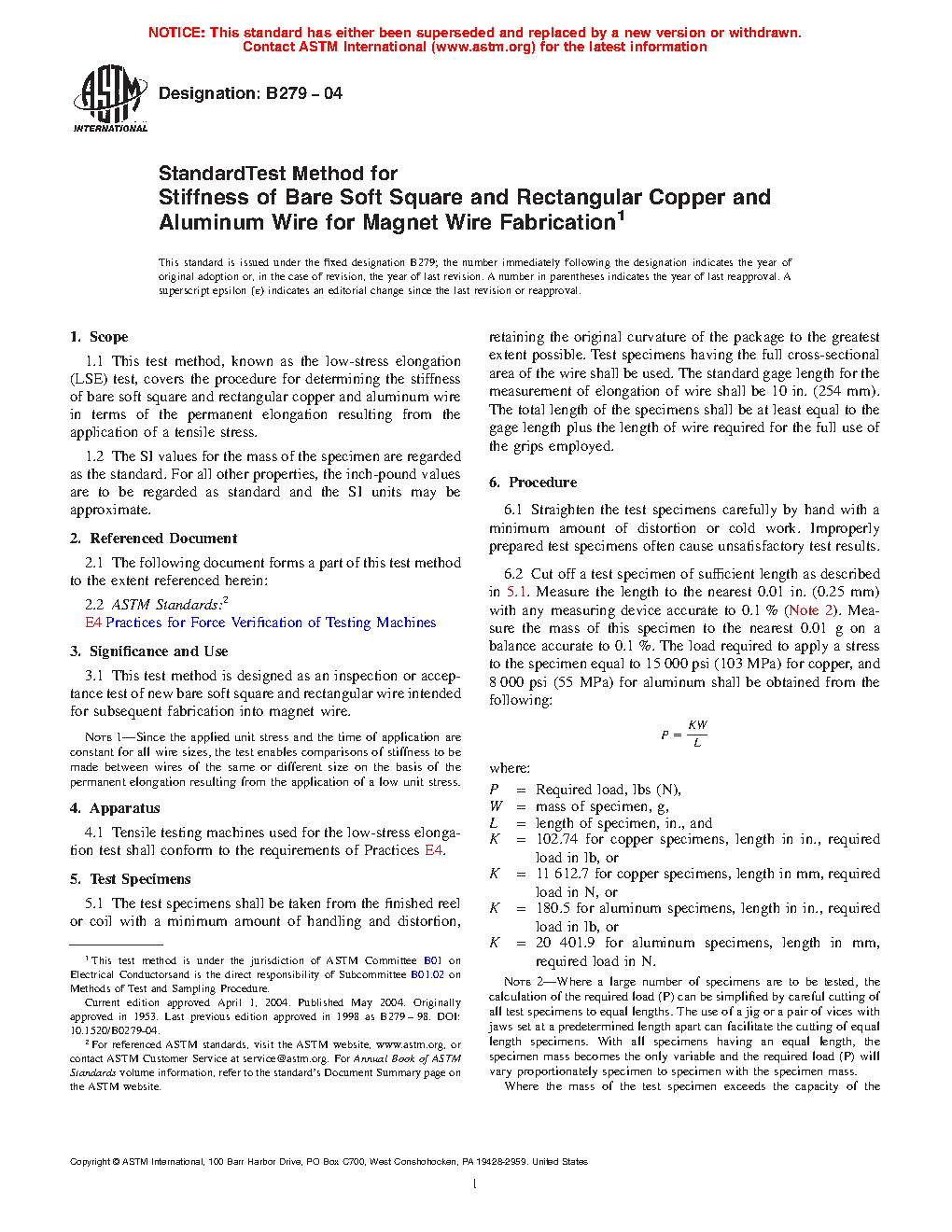 1.1 This test method, known as the low-stress elongation (LSE) test, covers the procedure for determining the stiffness of bare soft square and rectangular copper and aluminum wire in terms of the permanent elongation resulting from the application of a stress of tensile.