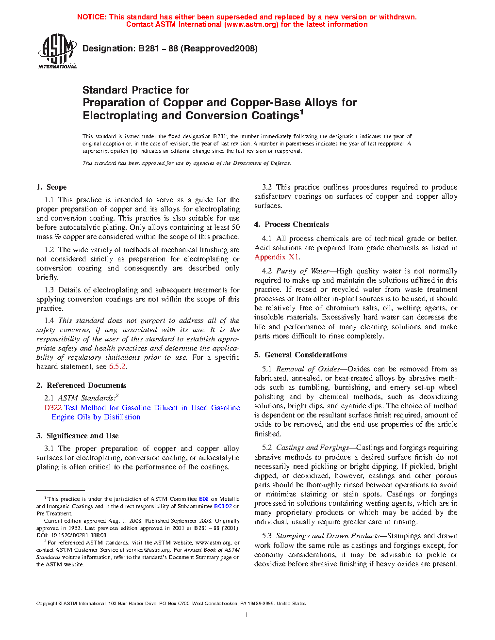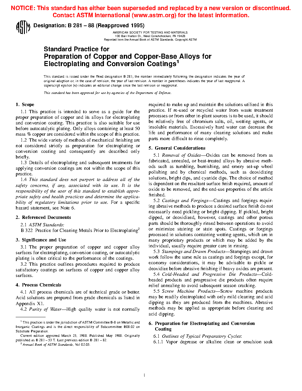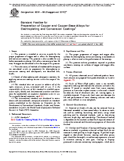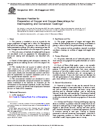 1.1 This practice is intended to serve as a guide for the proper preparation of copper and its alloys for electroplating and conversion coating. This practice is also suitable for use before autocatalytic plating. Only alloys containing at least 50 mass % copper are considered within the scope of this practice.