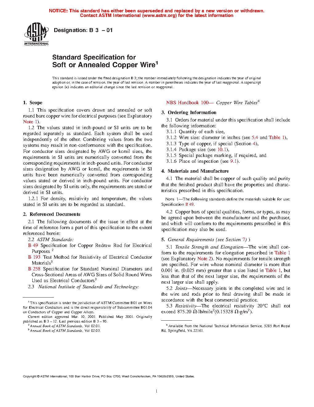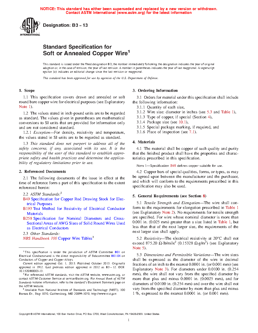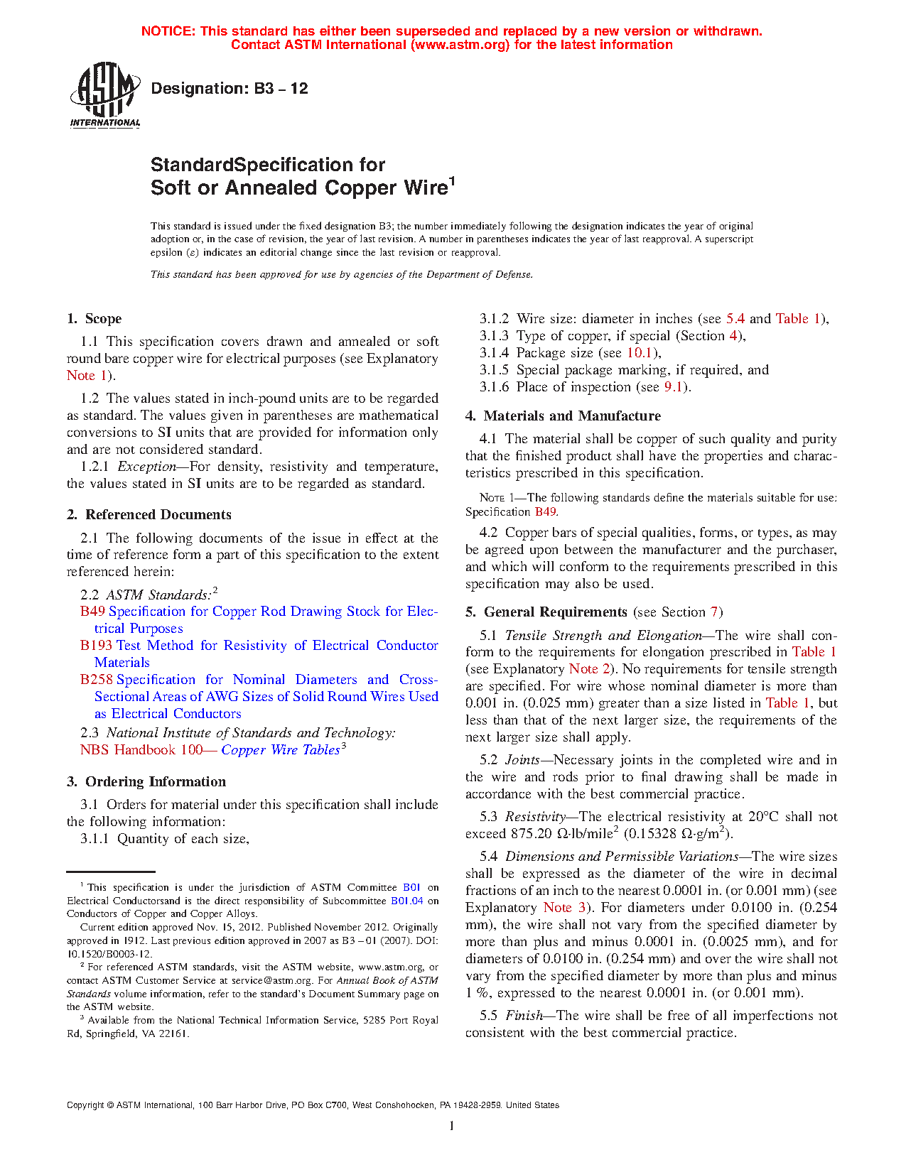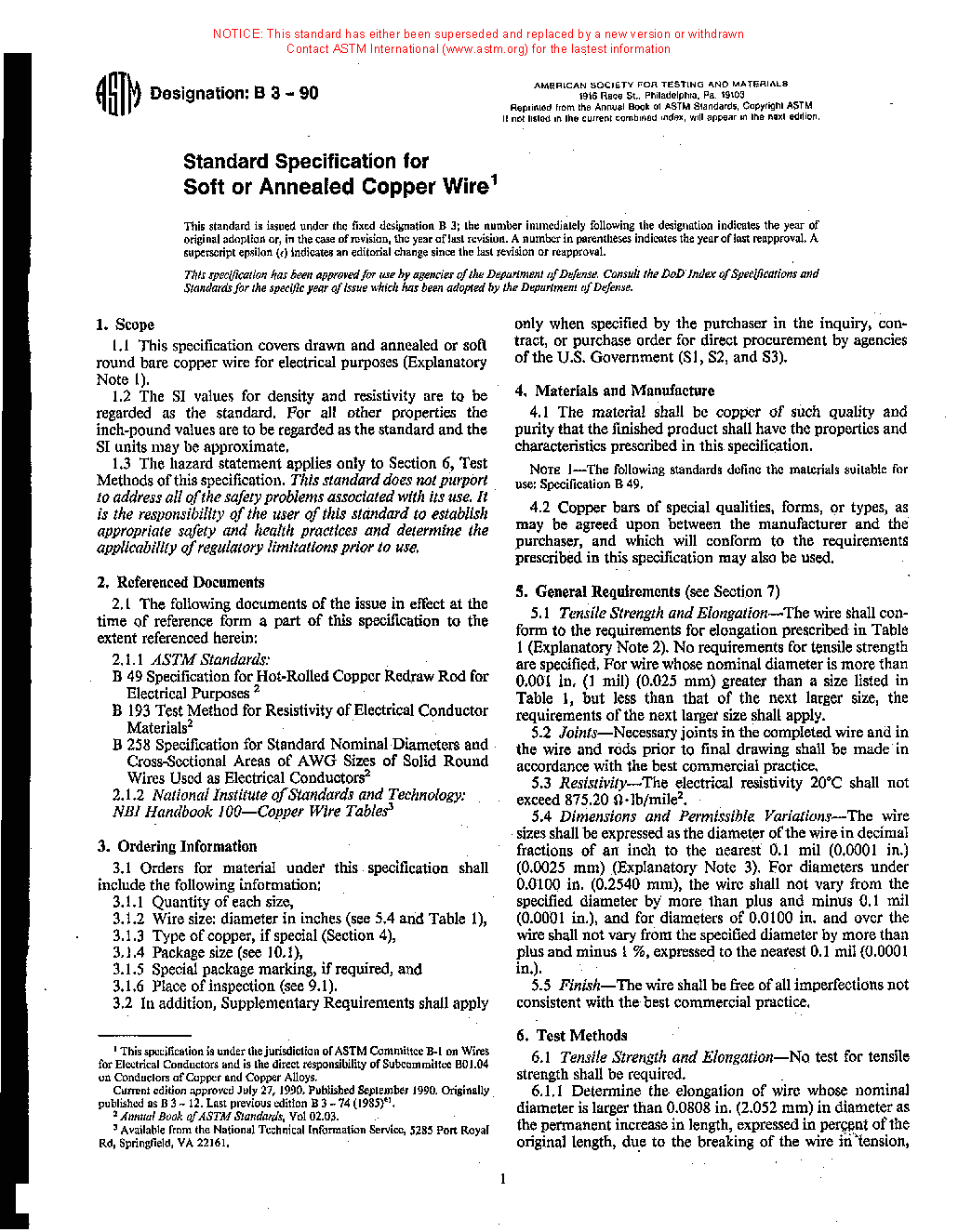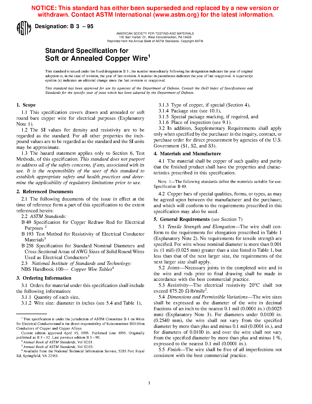 1.1 This specification covers drawn and annealed or soft round bare copper wire for electrical purposes (see Explanatory Note 1).