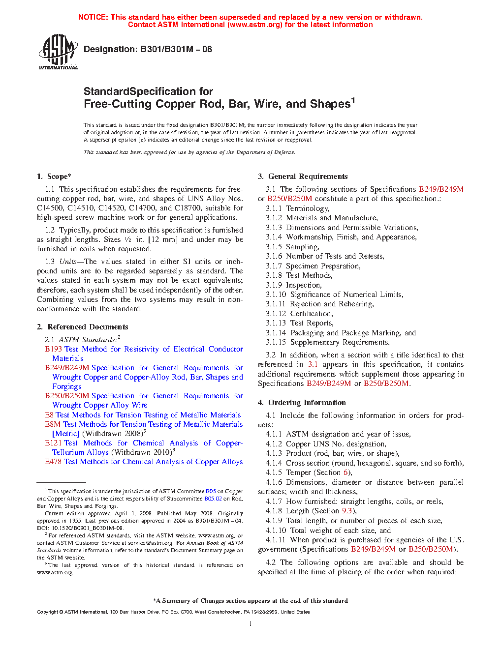 This specification establishes the requirements for free-cutting copper rod, bar, wire, and shapes of UNS Alloy Nos. C14500, C14510, C14520, C14700, and C18700, suitable for high-speed screw machine work or for general applications. The chemical composition, temper, electrical, tensile strength, and elongation requirements are detailed.