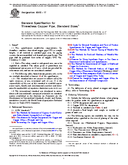 This specification establishes the requirements for threadless, seamless, and deoxidized copper pipes in straight lengths, in all nominal or standard pipe sizes, for piping systems that are assembled with brazed-joint pipe fittings. The pipe shall be produced from coppers with either UNS No. C10300 or C12200. The materials for manufacture shall be cast billets, bars, or tubes of such purity and soundness as to be suitable for processing by hot extrusion or piercing, and subsequent cold working to produce a uniform wrought structure in the finished product. Products shall be produced in the H58 (drawn general purpose) temper. Products shall be sampled and prepared, then tested accordingly to examine their conformance to dimensional (outer and inner diameters, wall thickness, cross-sectional area, theoretical weight, mass, length, and roundness or squareness), mechanical (tensile strength and Rockwell hardness), and chemical composition requirements. Products shall also meet performance requirements under microscopical examination, electromagnetic (eddy-current) test, hydrostatic test, and pneumatic test.