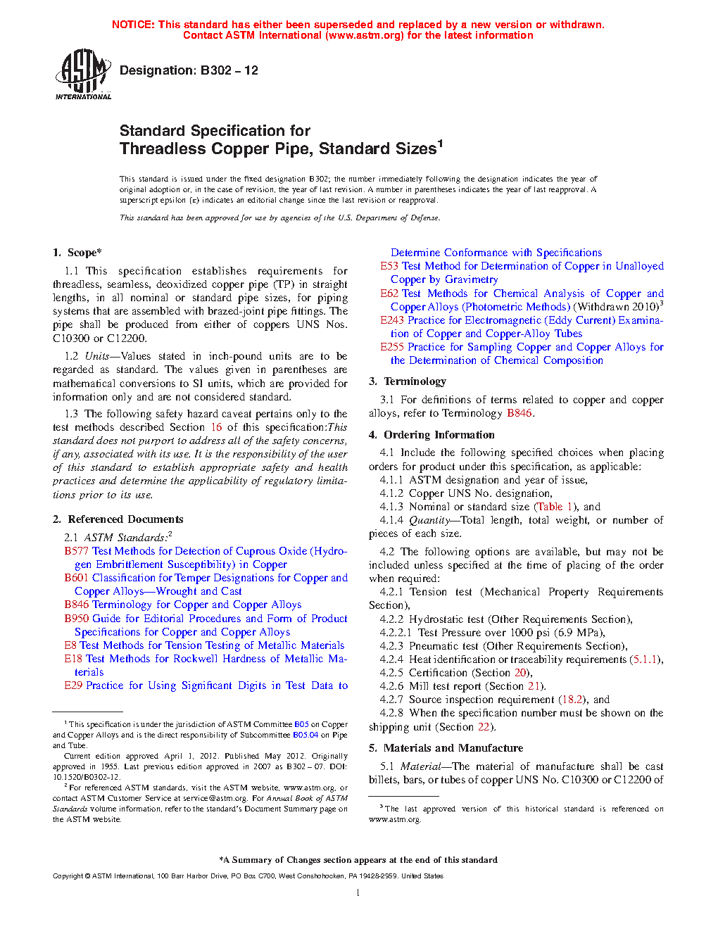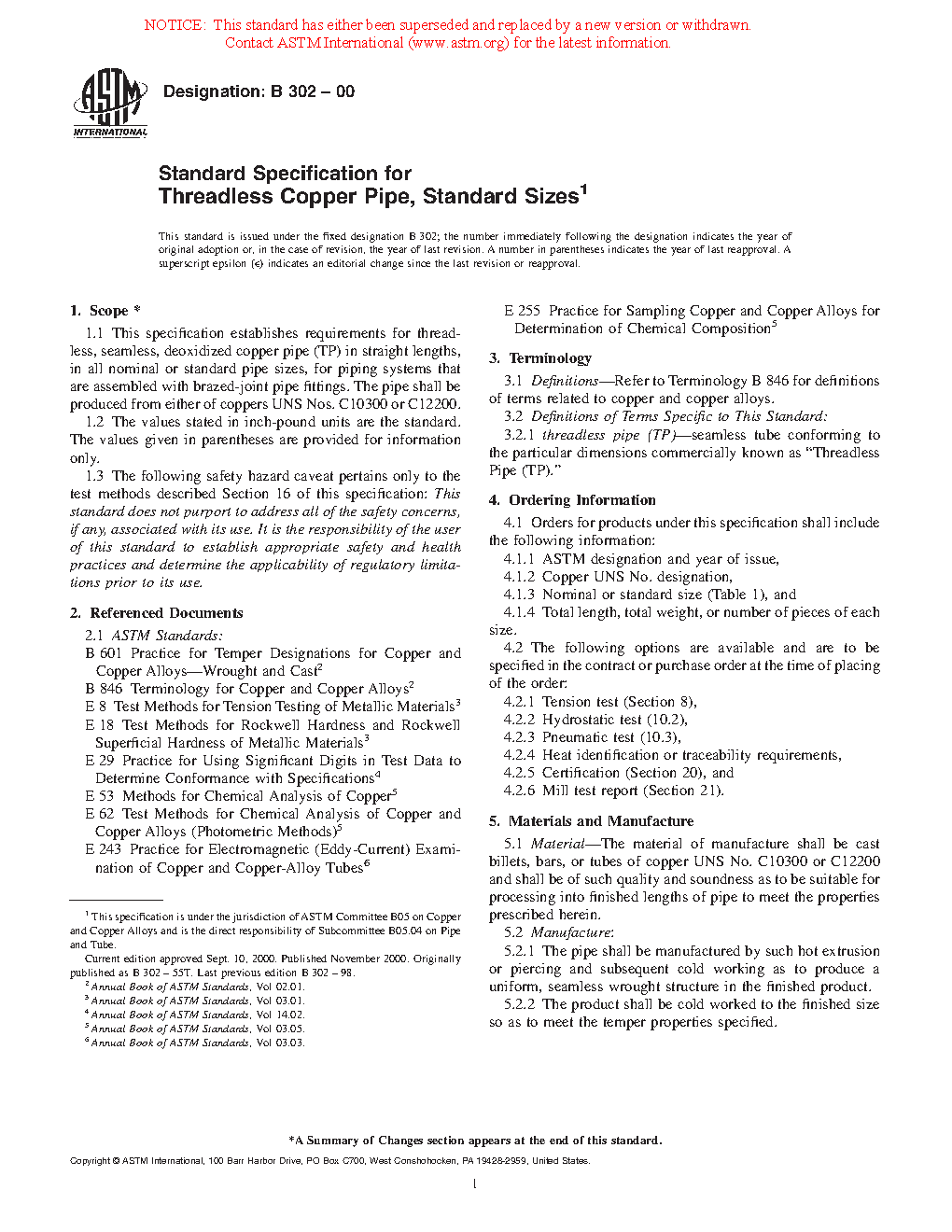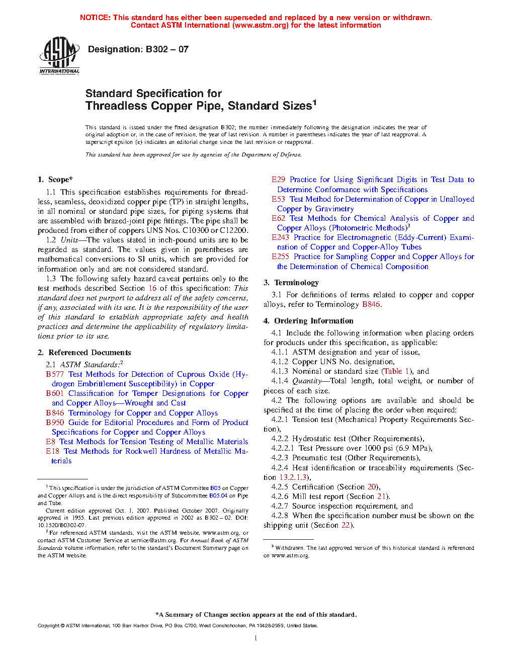 1.1 This specification establishes requirements for threadless, seamless, deoxidized copper pipe (TP) in straight lengths, in all nominal or standard pipe sizes, for piping systems that are assembled with brazed-joint pipe fittings. The pipe shall be produced from either of copper UNS Nos. C10300 or C12200.