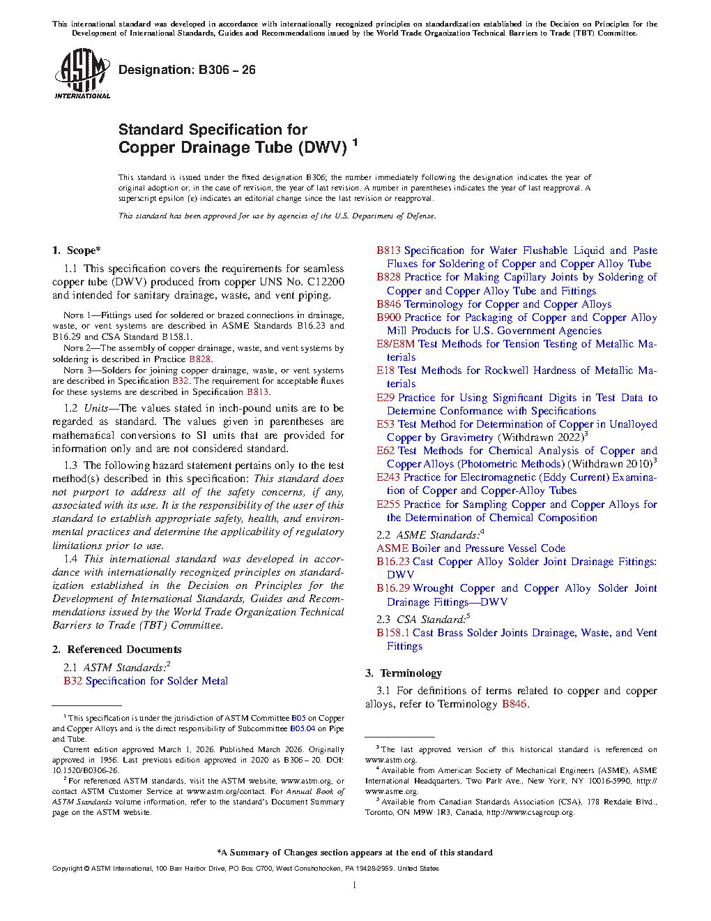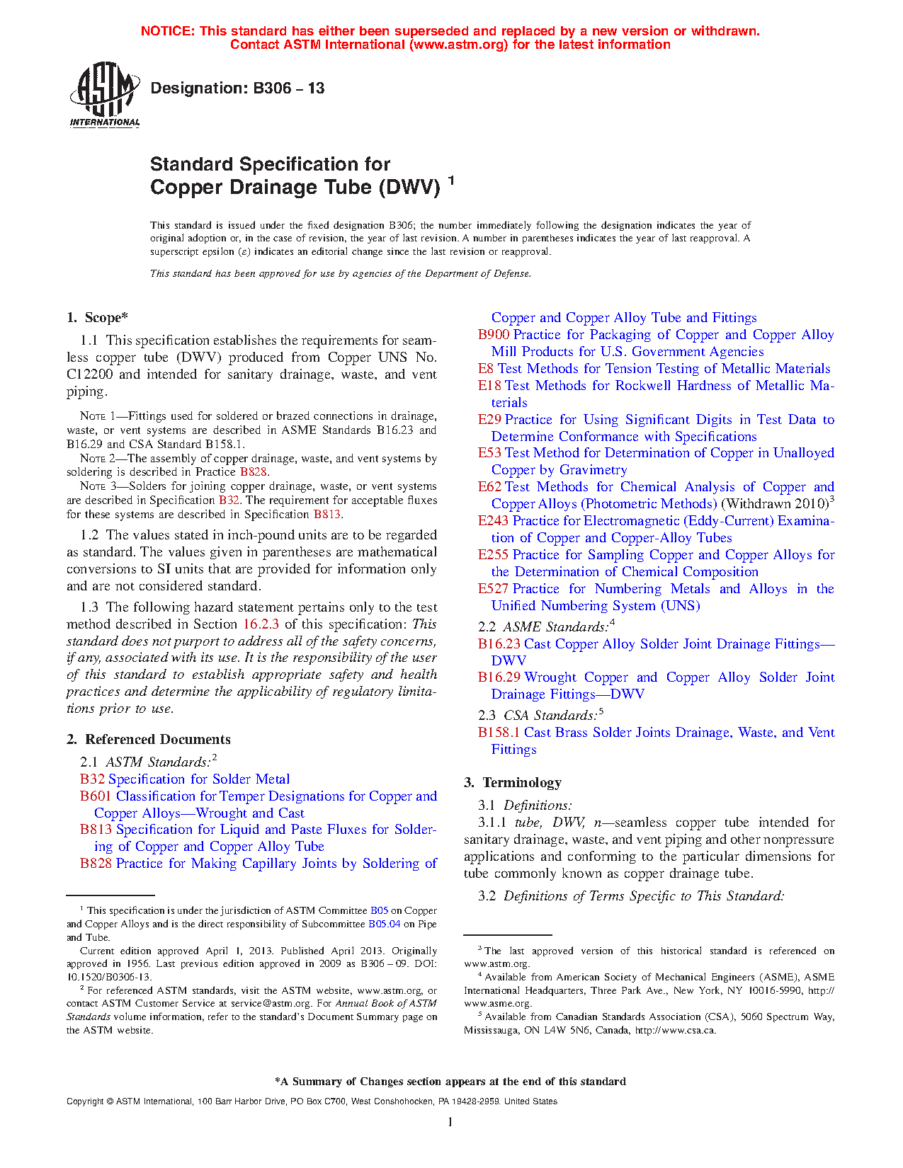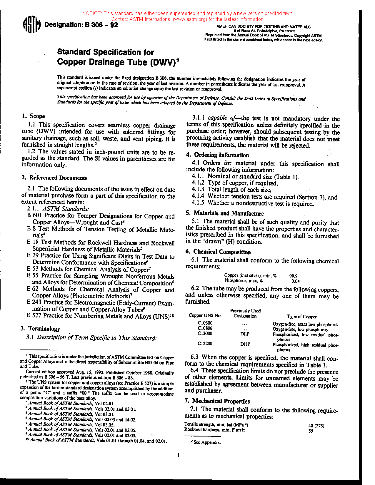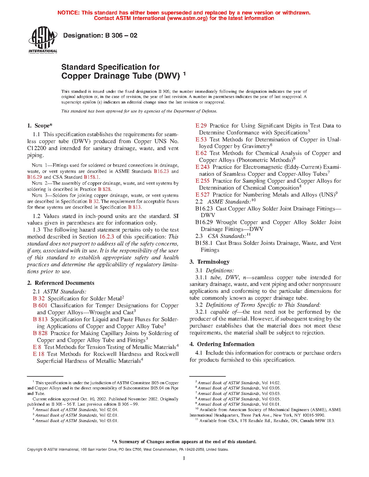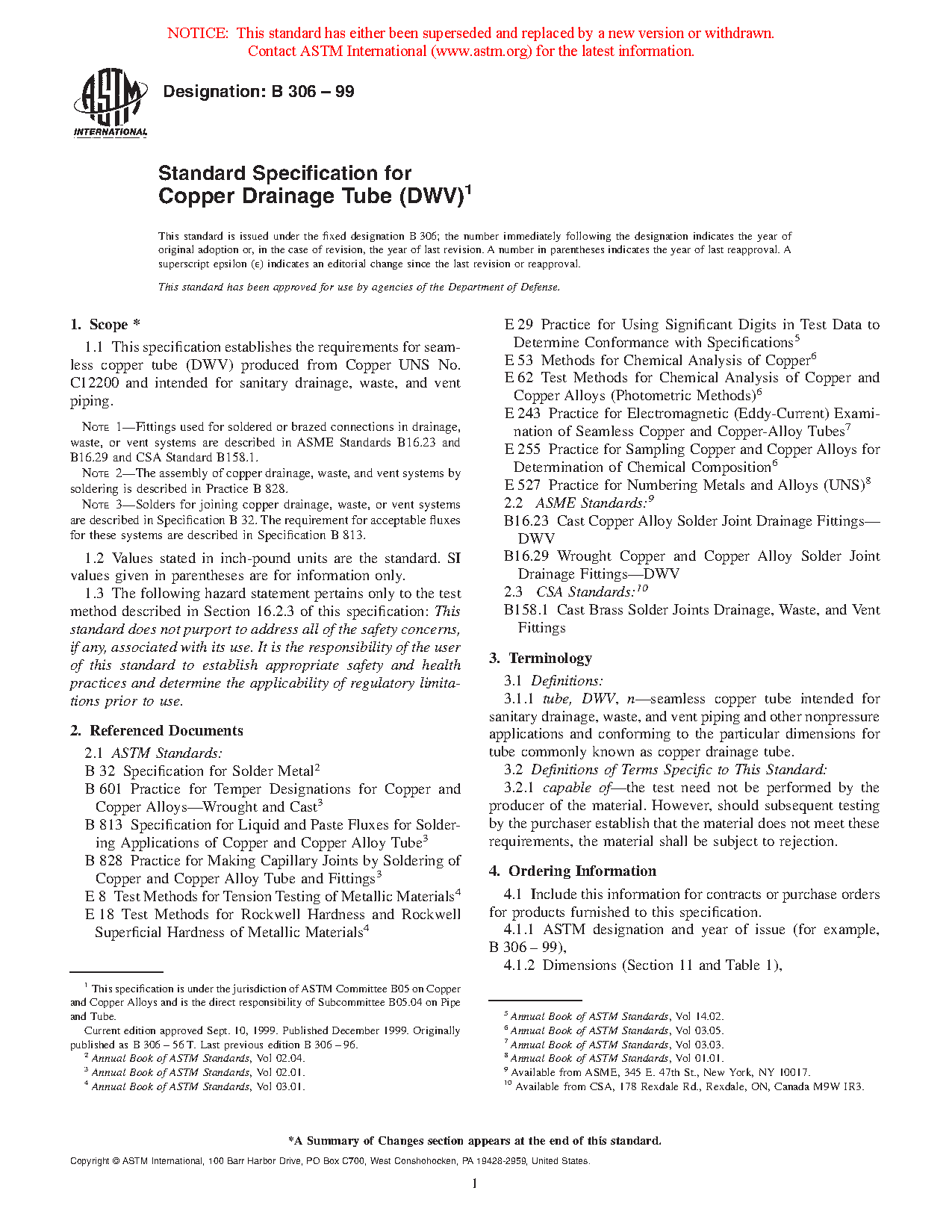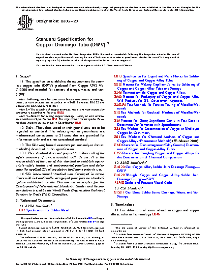 1.1 This specification establishes the requirements for seamless copper tube (DWV) produced from Copper UNS No. C12200 and intended for sanitary drainage, waste, and vent piping.