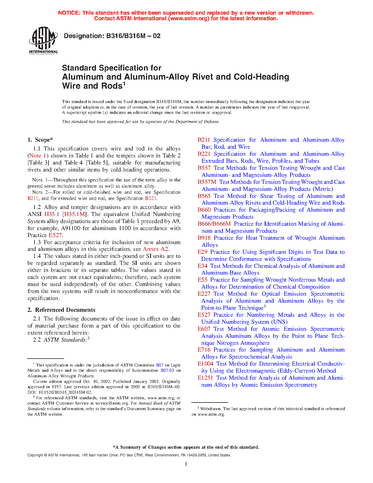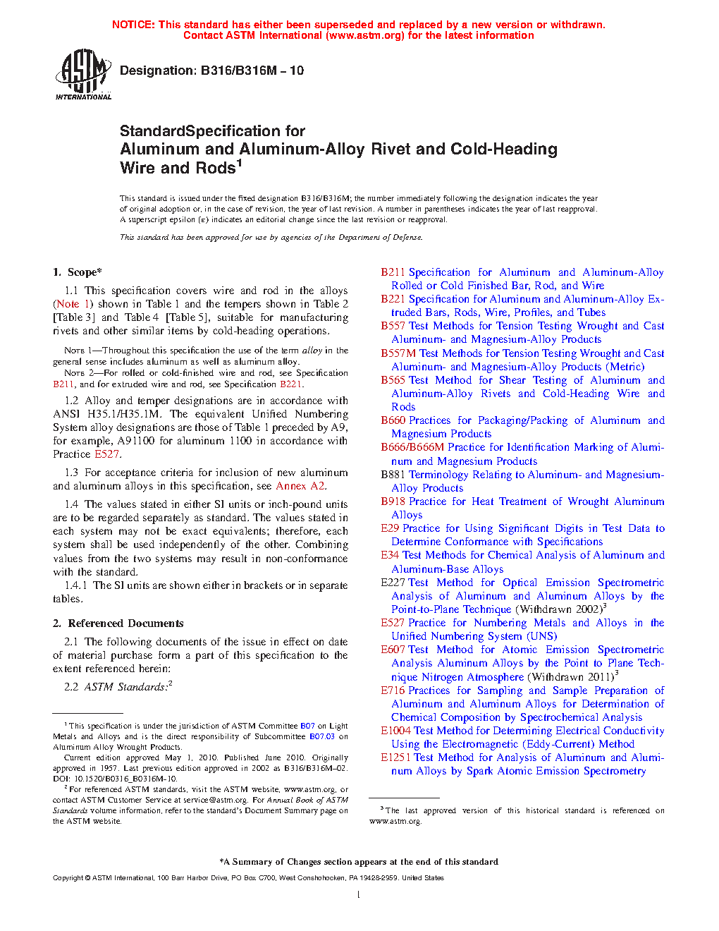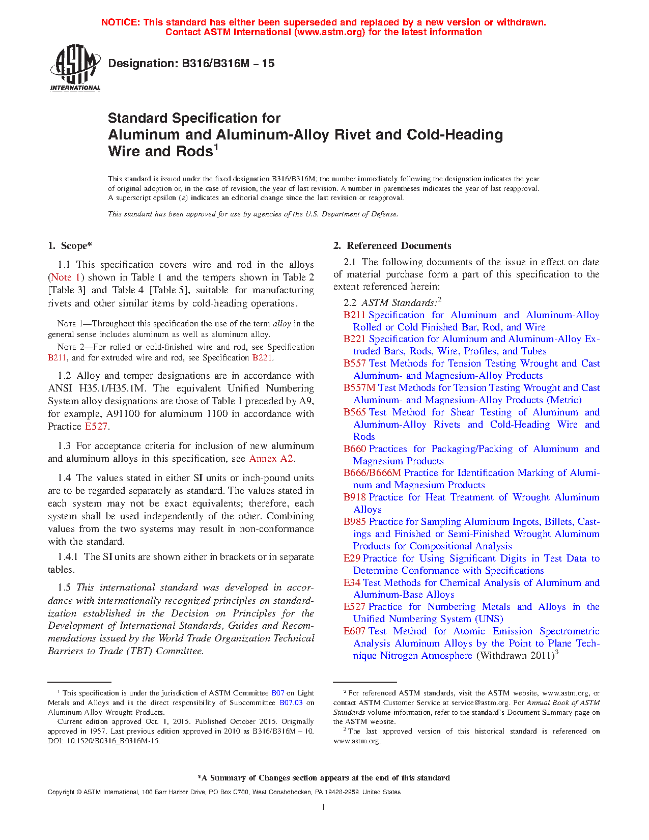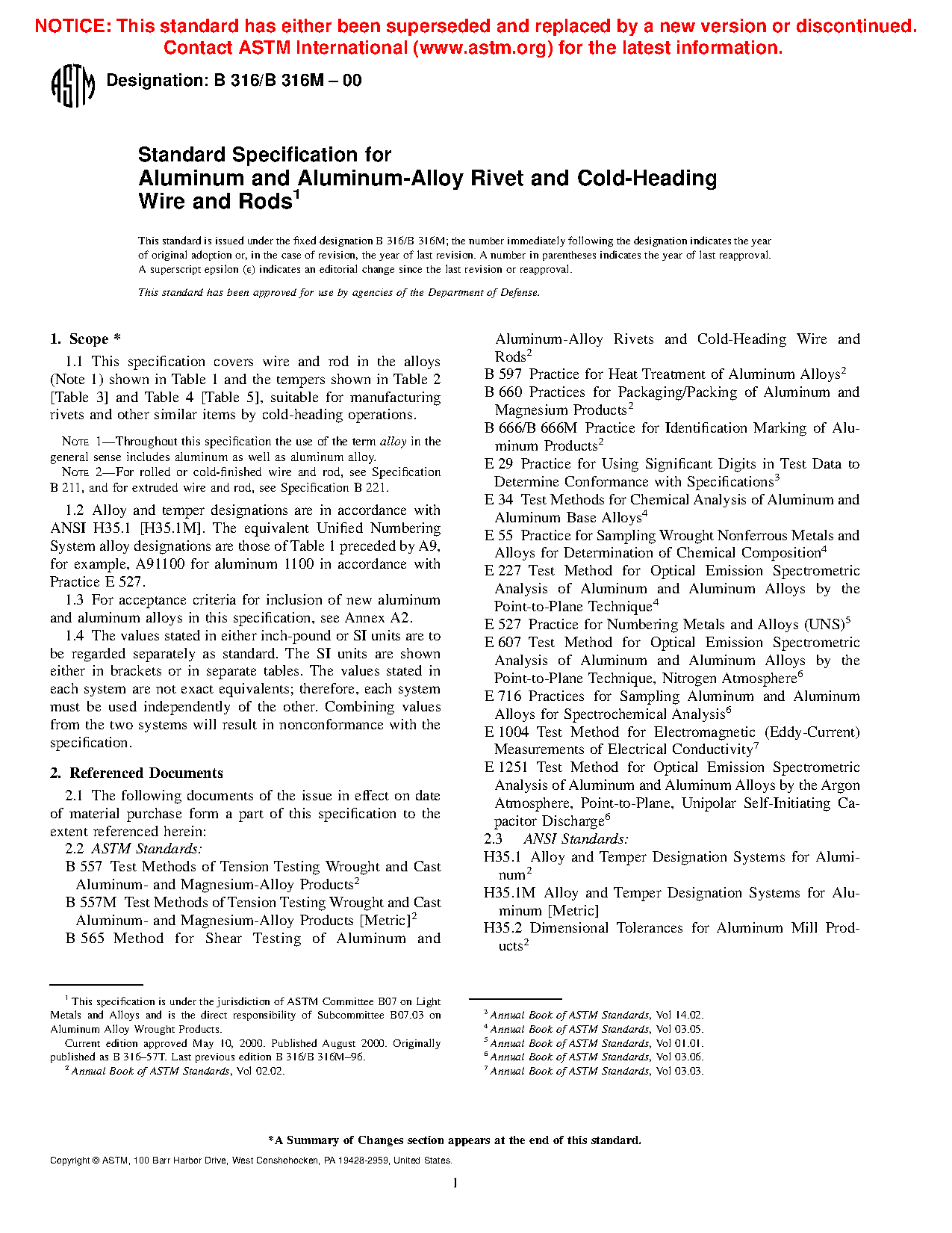 Note 2: For rolled or cold-finished wire and rod, see Specification B211/B211M, and for extruded wire and rod, see Specification B221.