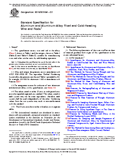 1.1 This specification covers wire and rod in the alloys (Note 1) shown in Table 1 and the tempers shown in Table 2 [Table 3] and Table 4 [Table 5], suitable for manufacturing rivets and other similar items by cold-heading operations.