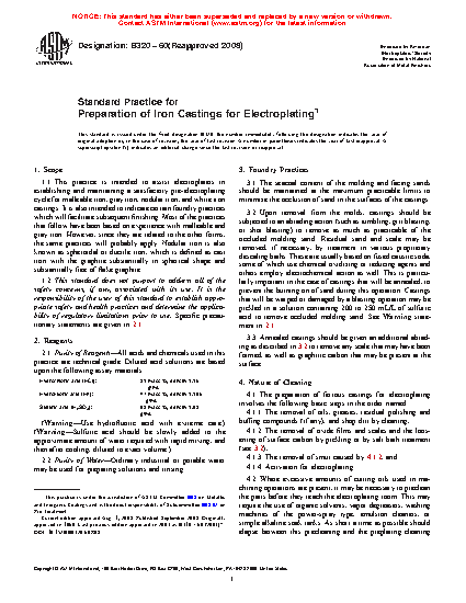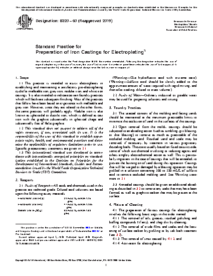 1.1 This practice is intended to assist electroplaters in establishing and maintaining a satisfactory pre-electroplating cycle for malleable iron, gray iron, nodular iron, and white iron castings. It is also intended to indicate certain foundry practices which will facilitate subsequent finishing. Most of the practices that follow have been based on experience with malleable and gray iron. However, since they are related to the other forms, the same practices will probably apply. Nodular iron is also known as spheroidal or ductile iron, which is defined as cast iron with the graphite substantially in spherical shape and substantially free of flake graphite.