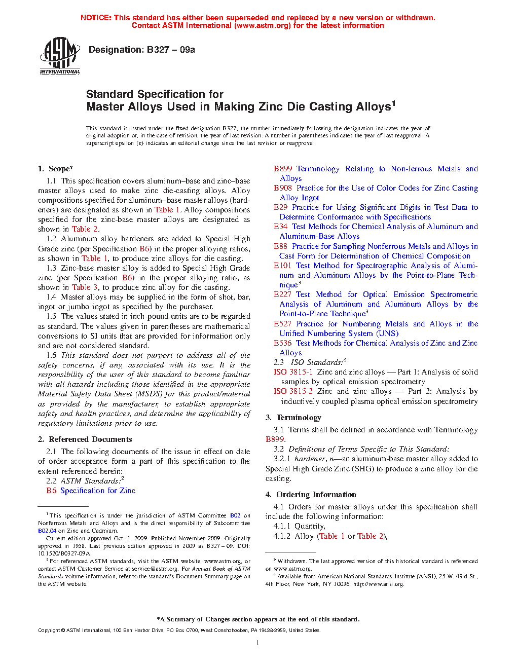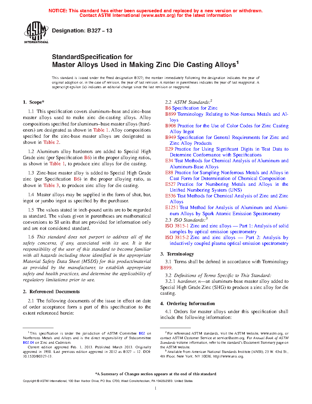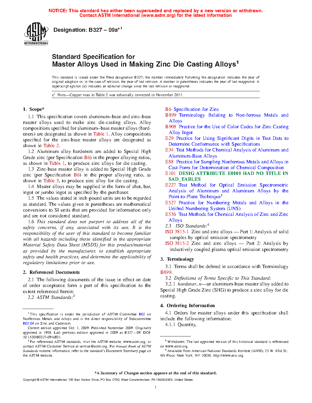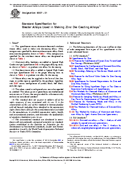 1.3 Zinc-base master alloy is added to Special High Grade zinc (per Specification B6) in the proper alloying ratio, as shown in Table 3, to produce zinc alloy for die casting.