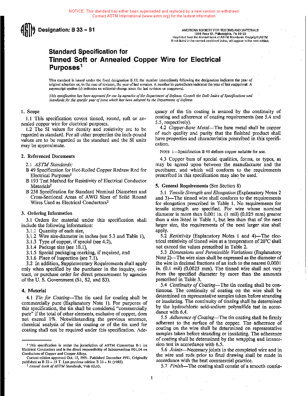 1.1 This specification covers tin-coated, round, soft, or annealed copper wire for electrical purposes.