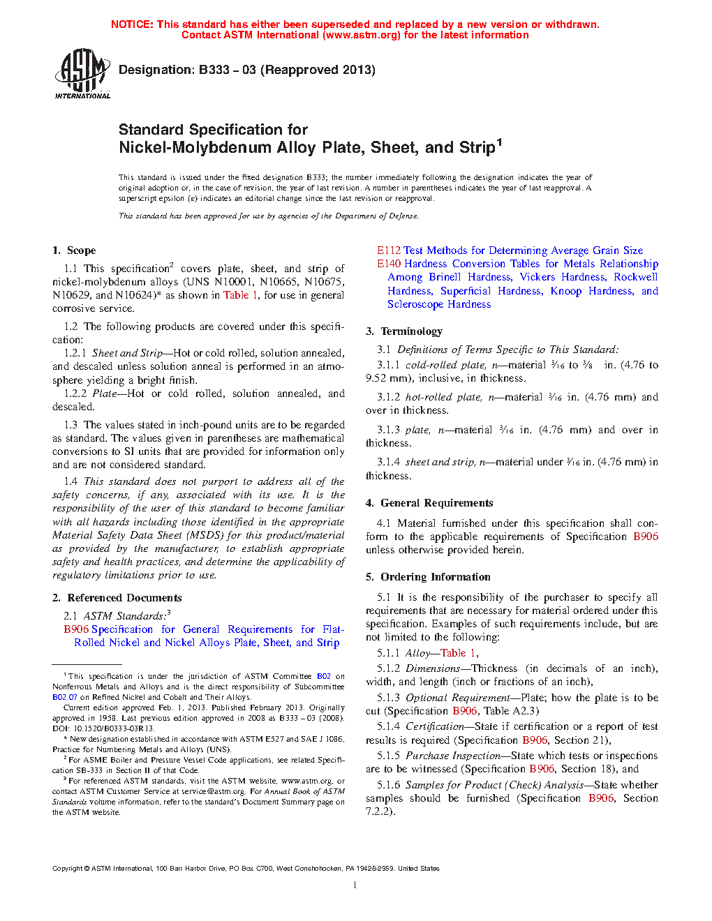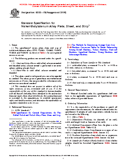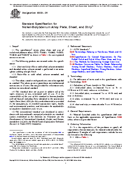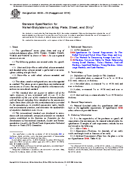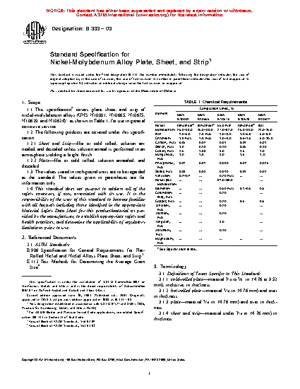 1.1 This specification2 covers plate, sheet, and strip of nickel-molybdenum alloys (UNS N10001, N10665, N10675, N10629, and N10624)3 as shown in Table 1, for use in general corrosive service.