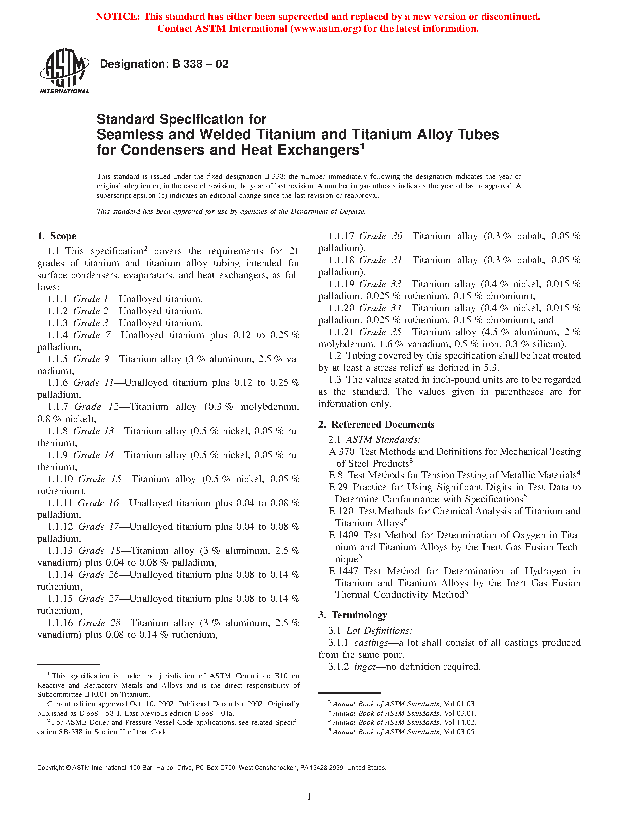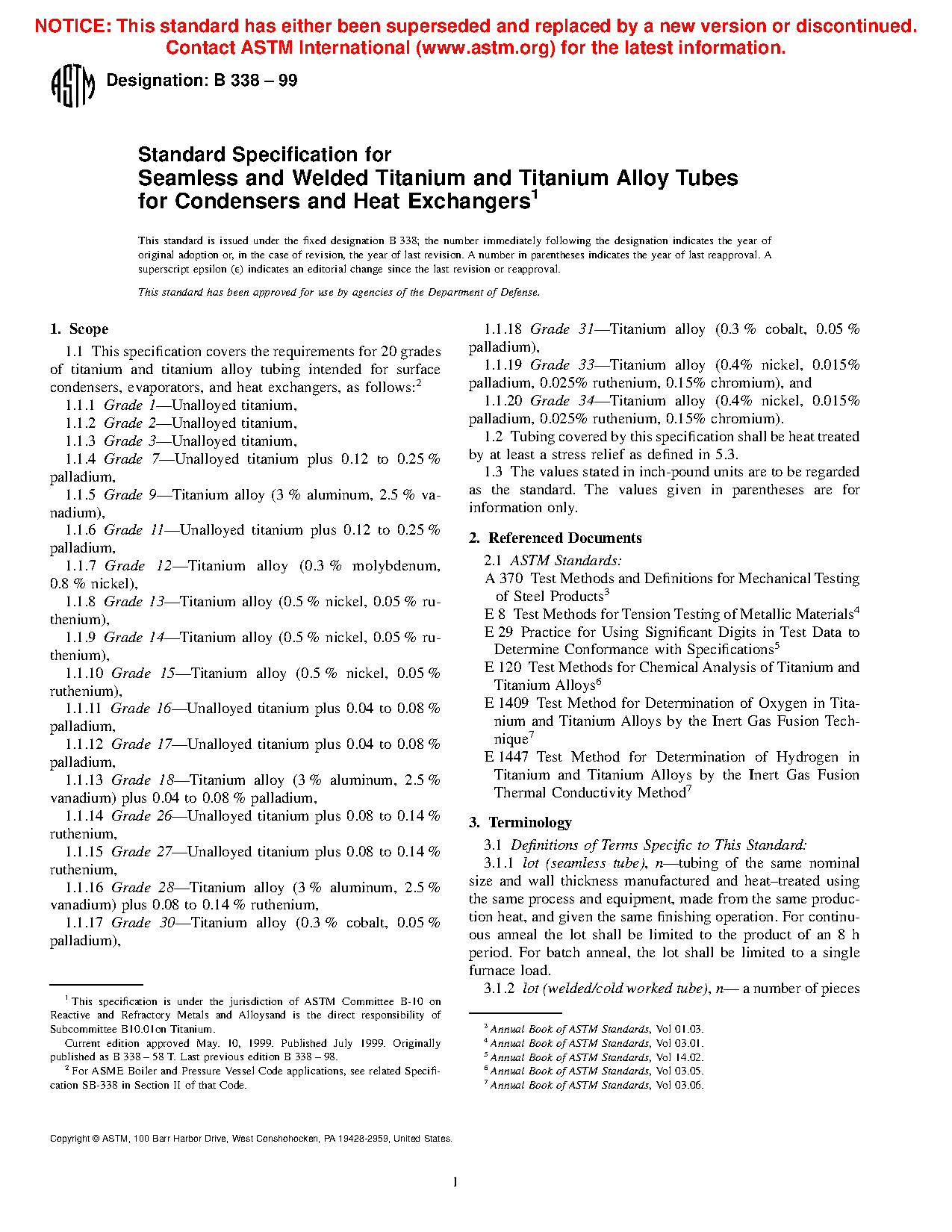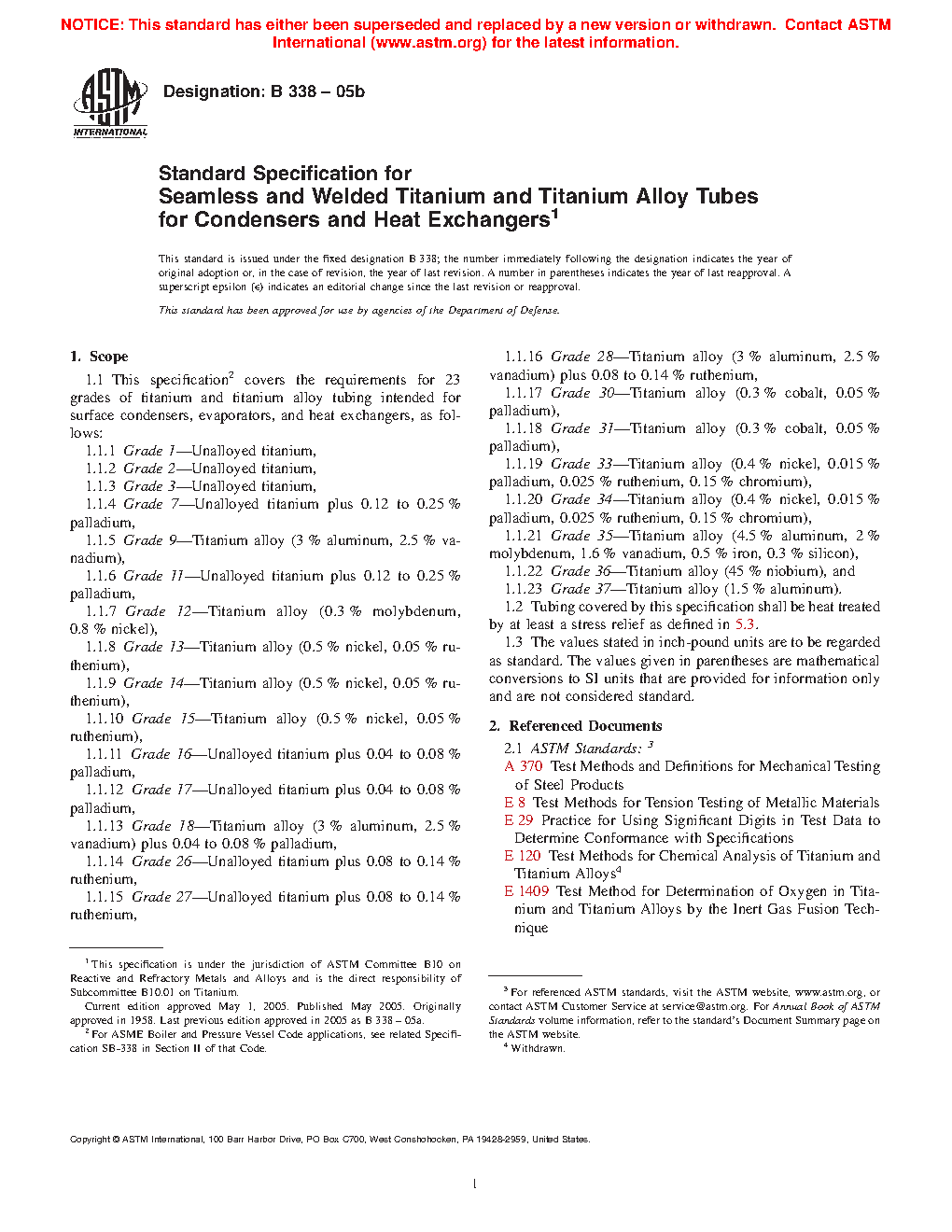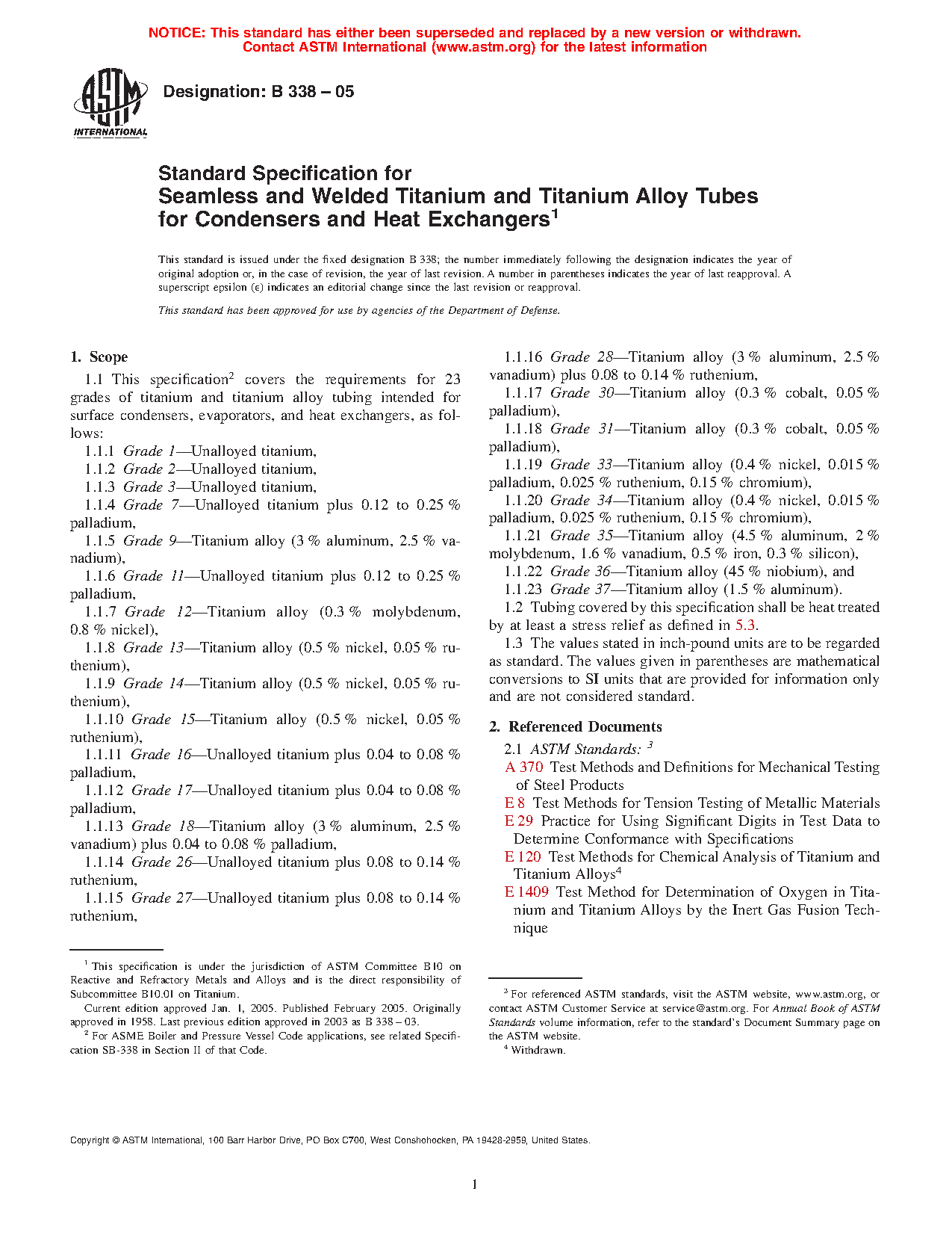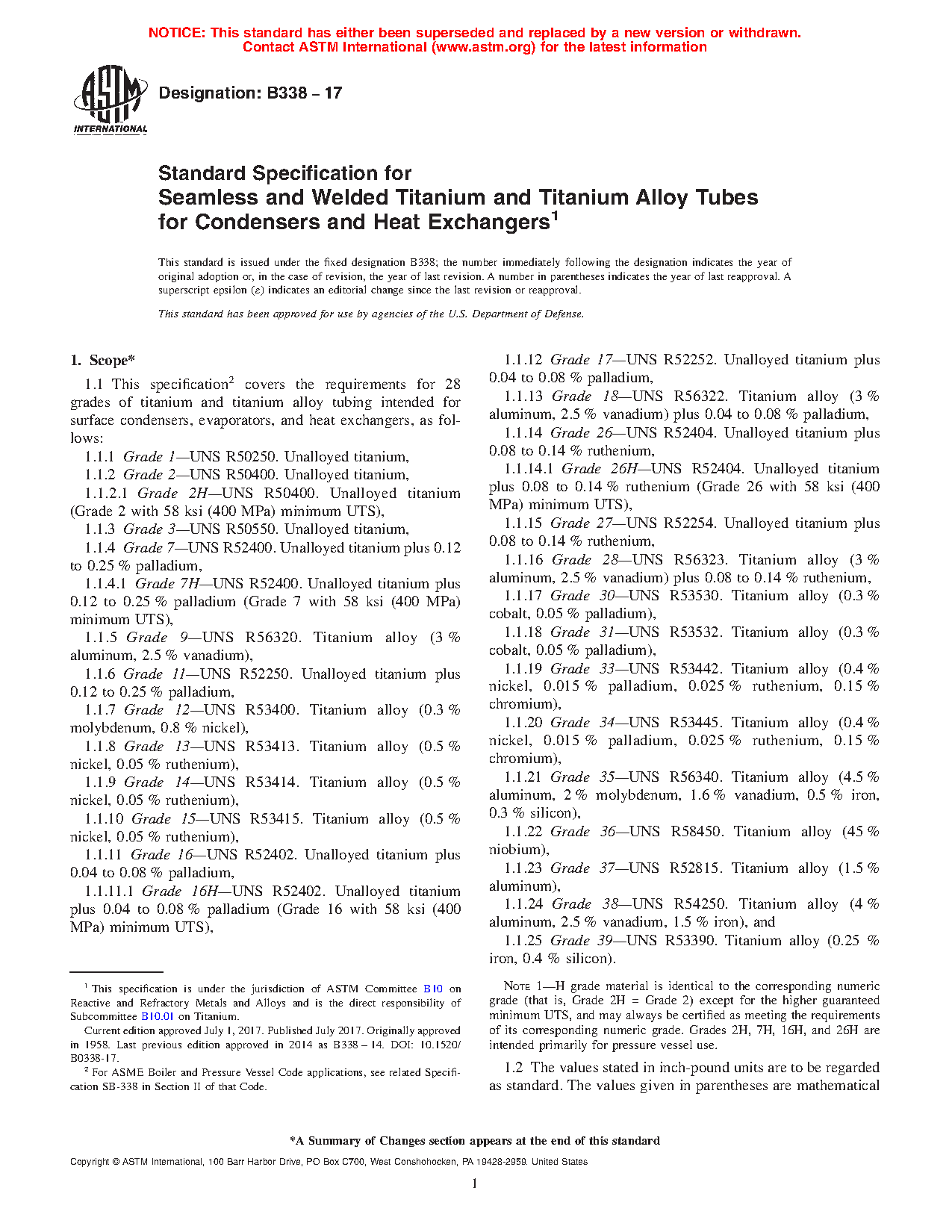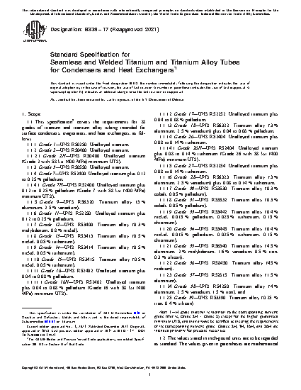 1.1 This specification covers the requirements for 20 grades of titanium and titanium alloy tubing intended for surface condensers, evaporators, and heat exchangers, as follows:
