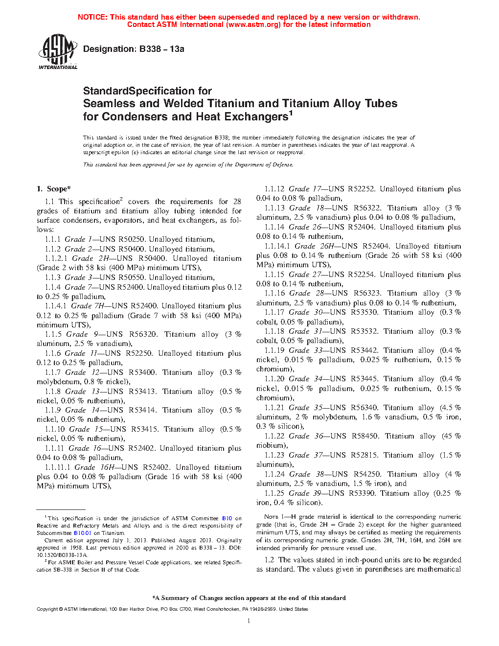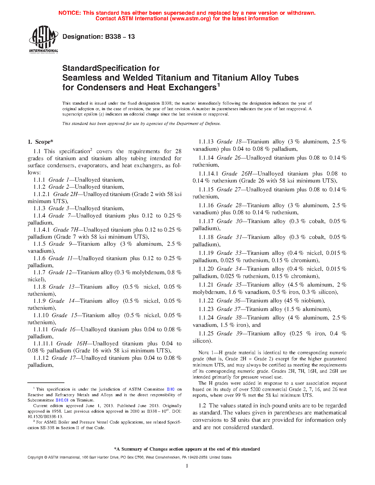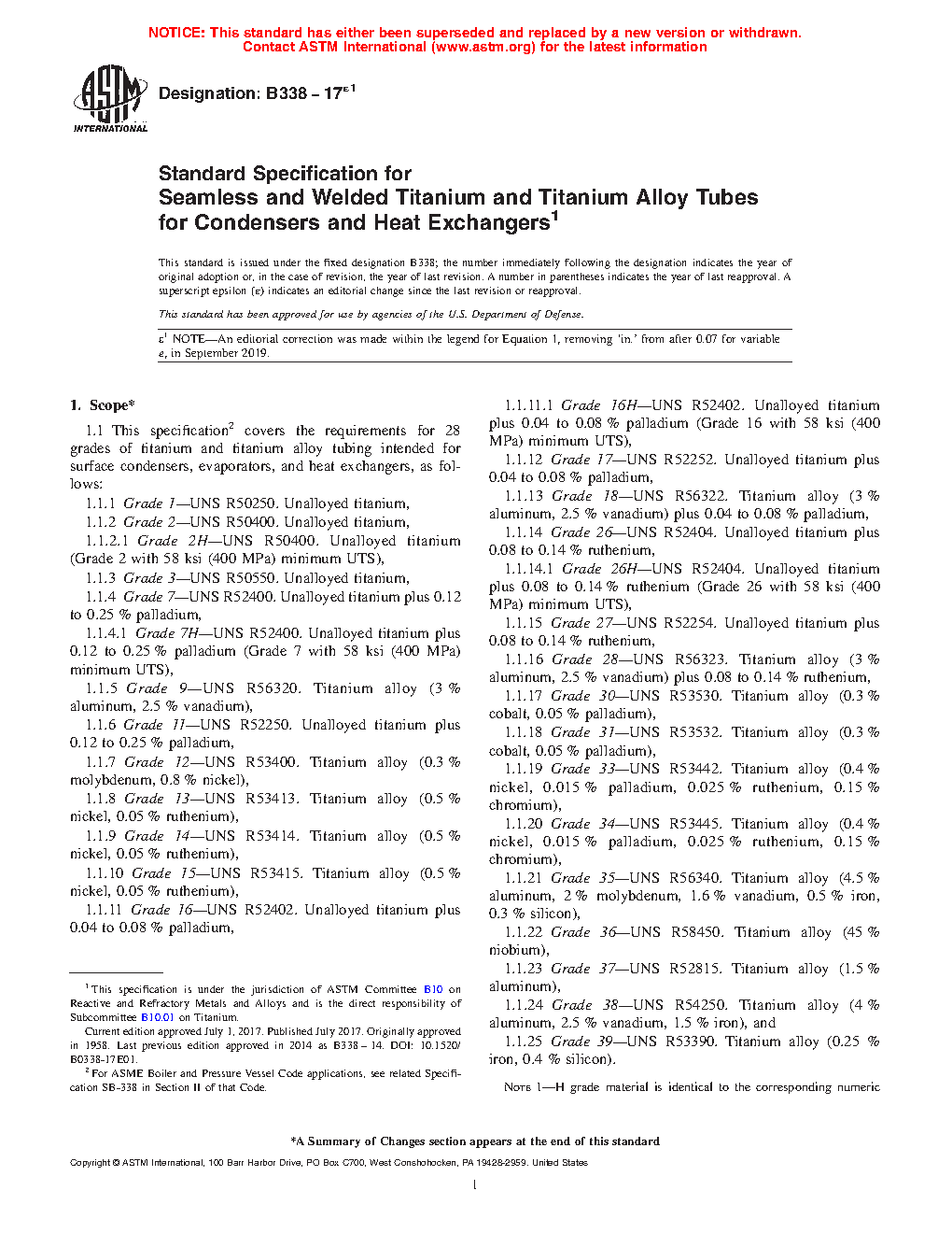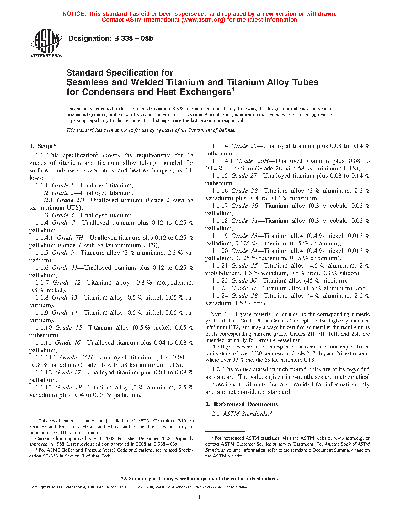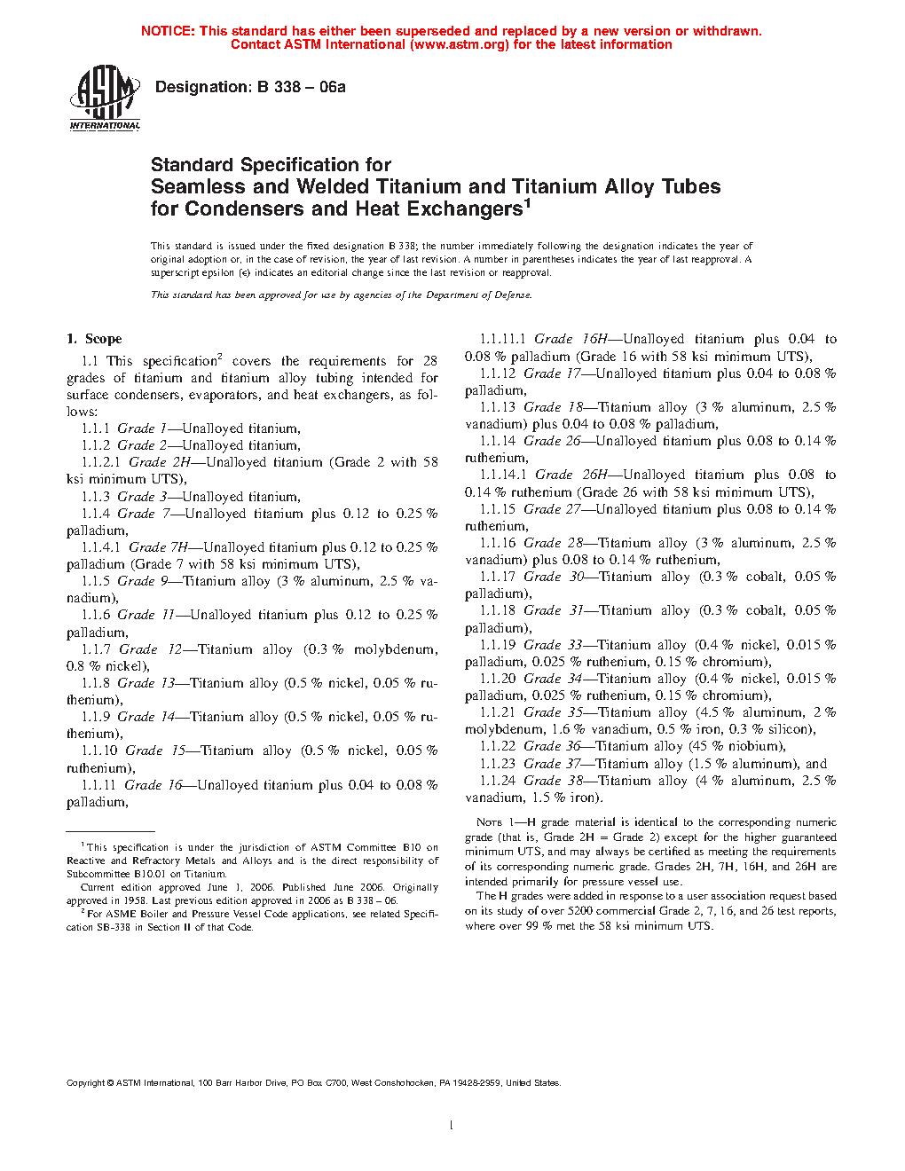 1.1 This specification covers the requirements for 20 grades of titanium and titanium alloy tubing intended for surface condensers, evaporators, and heat exchangers, as follows: