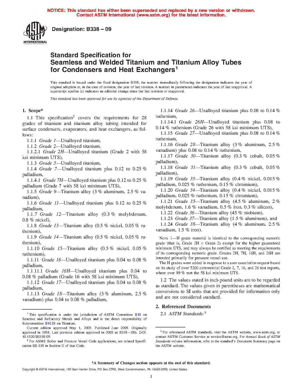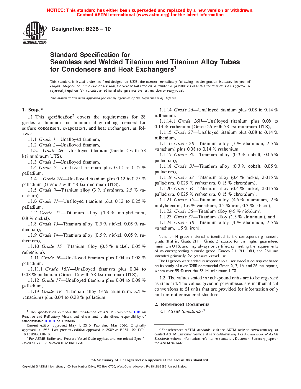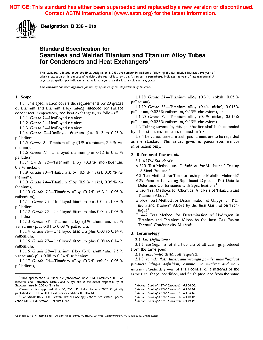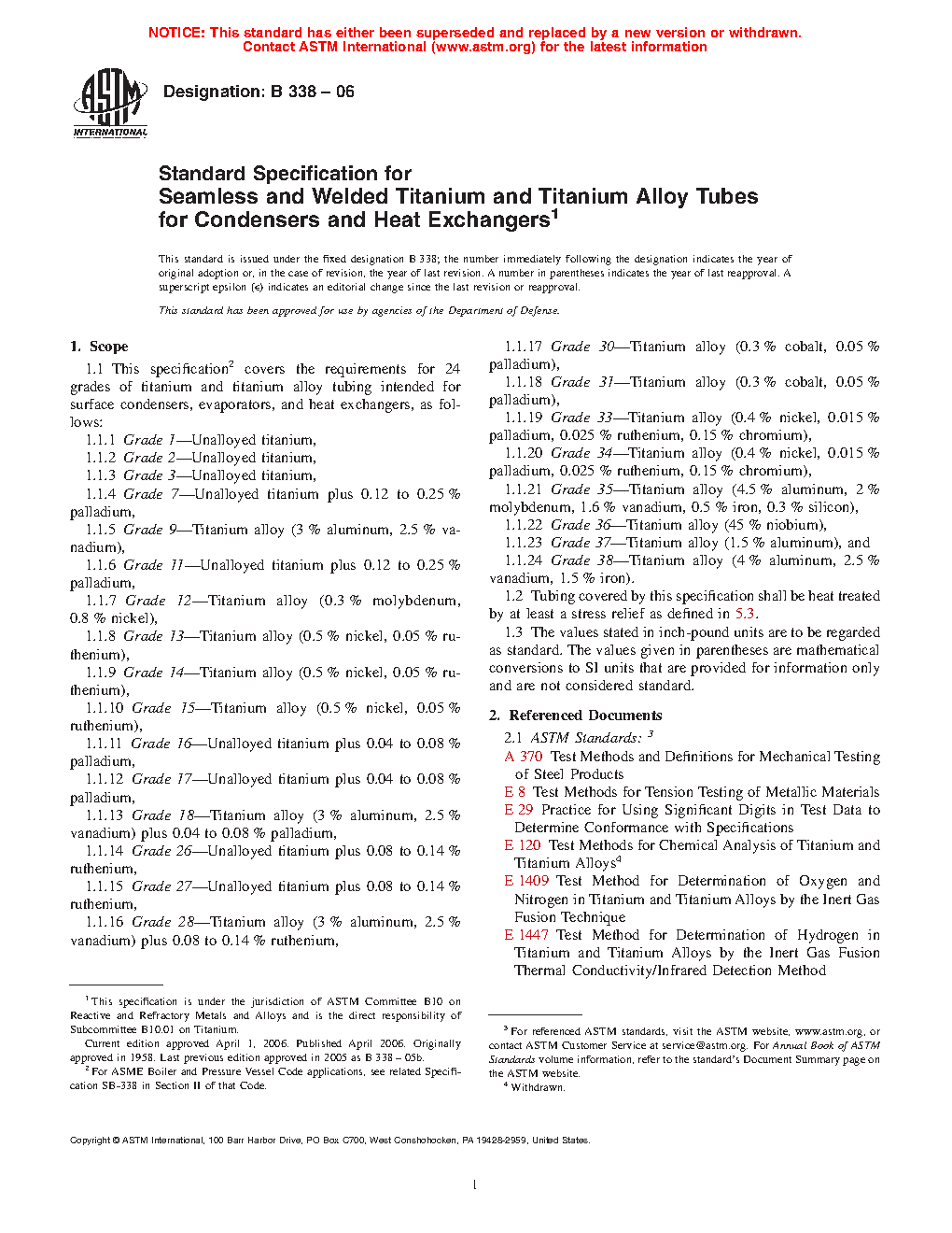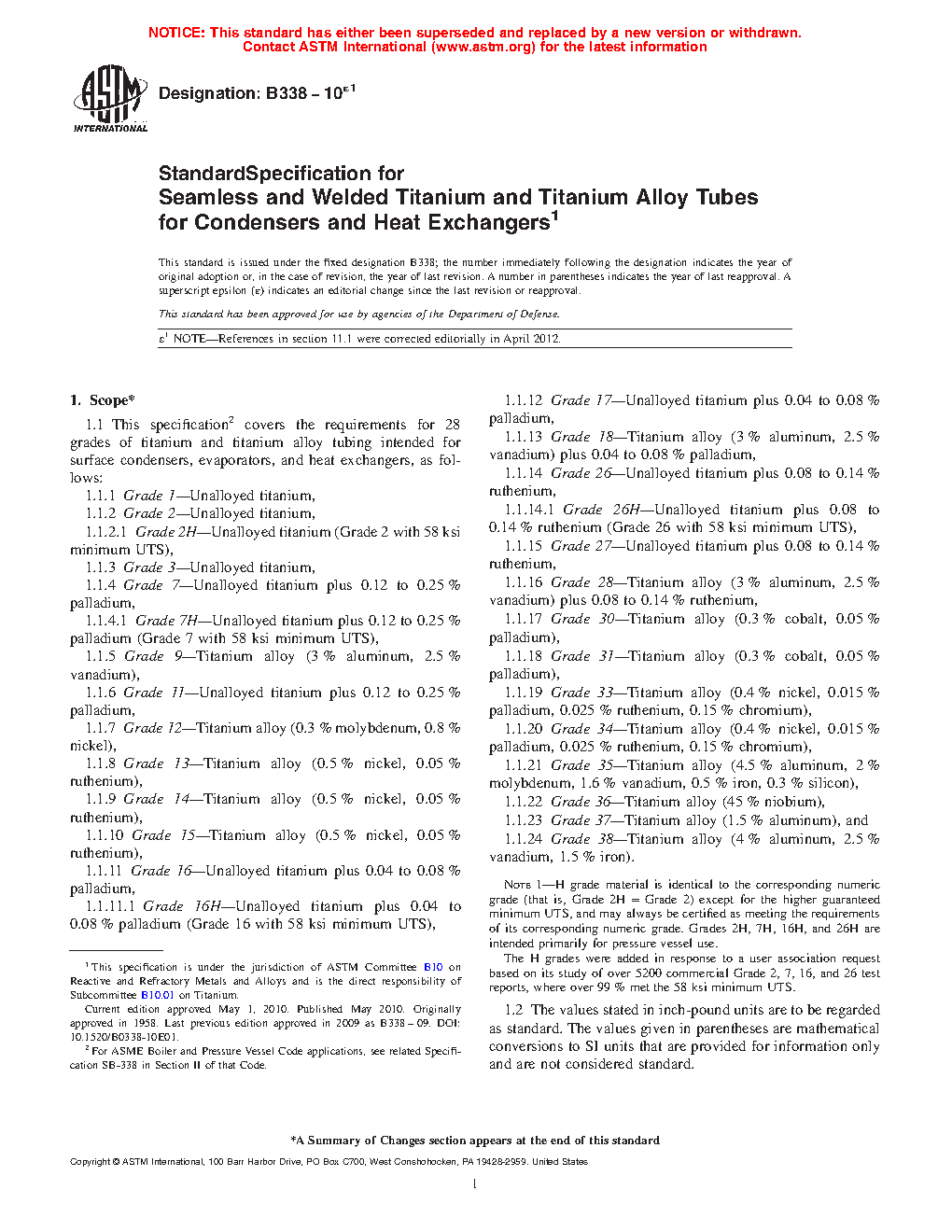 1.1 This specification covers the requirements for 20 grades of titanium and titanium alloy tubing intended for surface condensers, evaporators, and heat exchangers, as follows: