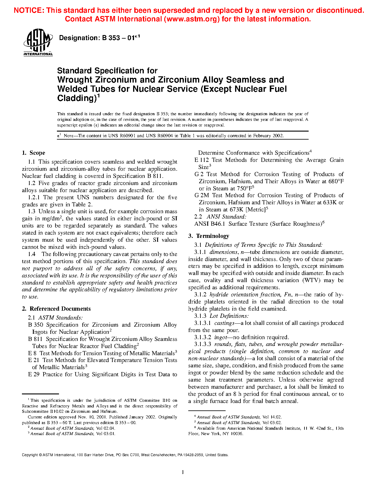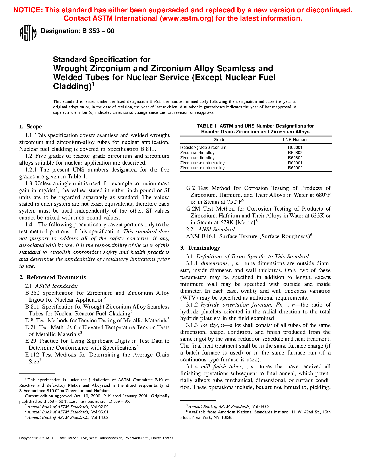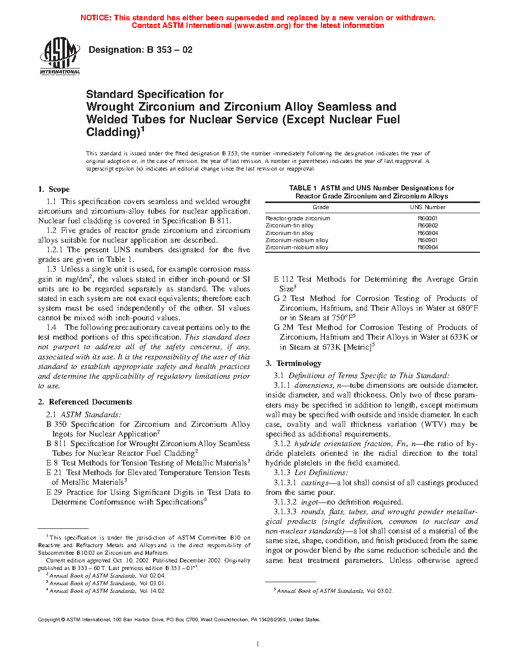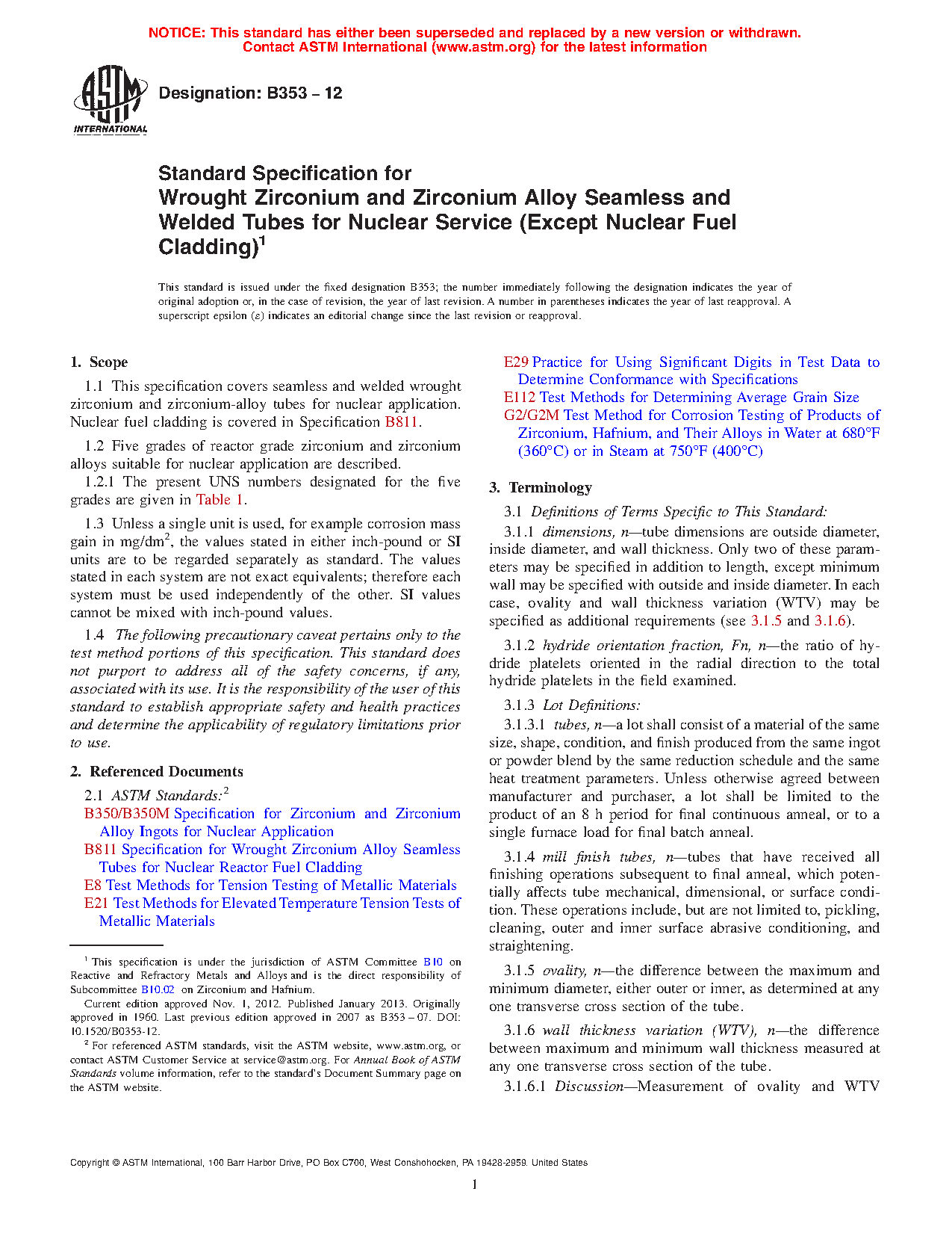 1.1 This specification covers seamless and welded wrought zirconium and zirconium-alloy tubes for nuclear application. Nuclear fuel cladding is covered in Specification B811.