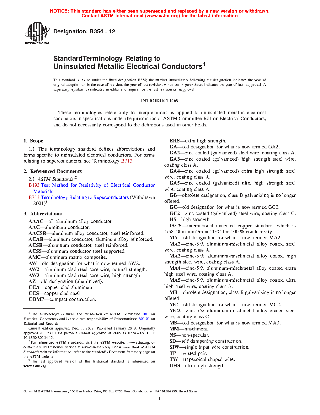 1.1 This terminology standard defines abbreviations and terms specific to uninsulated electrical conductors. For terms relating to superconductors, see Definitions B713.