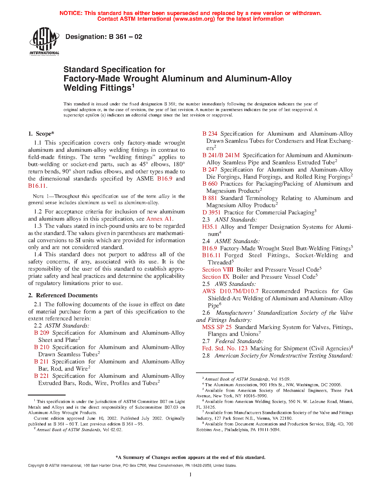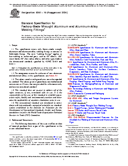 1.1 This specification covers only factory-made wrought aluminum and aluminum-alloy welding fittings in contrast to field-made fittings. The term “welding fittings” applies to butt-welding or socket-end parts, such as 45° elbows, 180° return bends, 90° short radius elbows, and other types made to the dimensional standards specified by ASME B16.9 and B16.11.