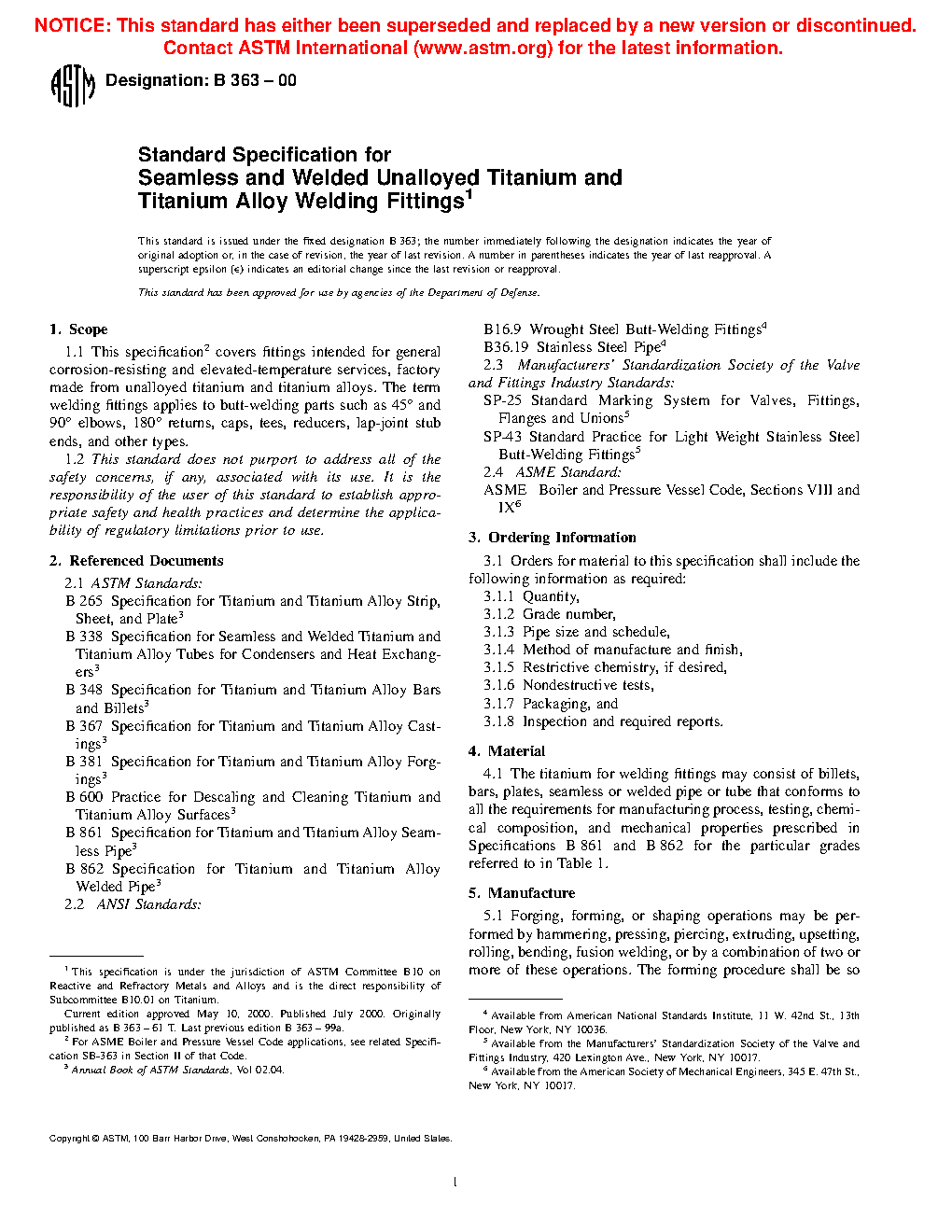 This specification covers fittings intended for general corrosion-resisting and elevated-temperature services, factory made from unalloyed titanium and titanium alloys. The titanium for welding fittings may consist of billets, bars, plates, seamless or welded pipe or tube that conforms to all the requirements for manufacturing process, testing, chemical composition, and mechanical properties. Forging, forming, or shaping operations may be performed by hammering, pressing, piercing, extruding, upsetting, rolling, bending, fusion welding, or by a combination of two or more of these operations. The titanium shall conform to the requirements as to prescribed chemical composition. Product analysis tolerances of aluminum, carbon, chromium, hydrogen, iron, molybdenum, nickel, niobium, nitrogen, oxygen, palladium, ruthenium, silicon, vanadium, zirconium, and some residuals shall be specified. The titanium shall conform to the requirements as to tensile properties prescribed in the specifications.