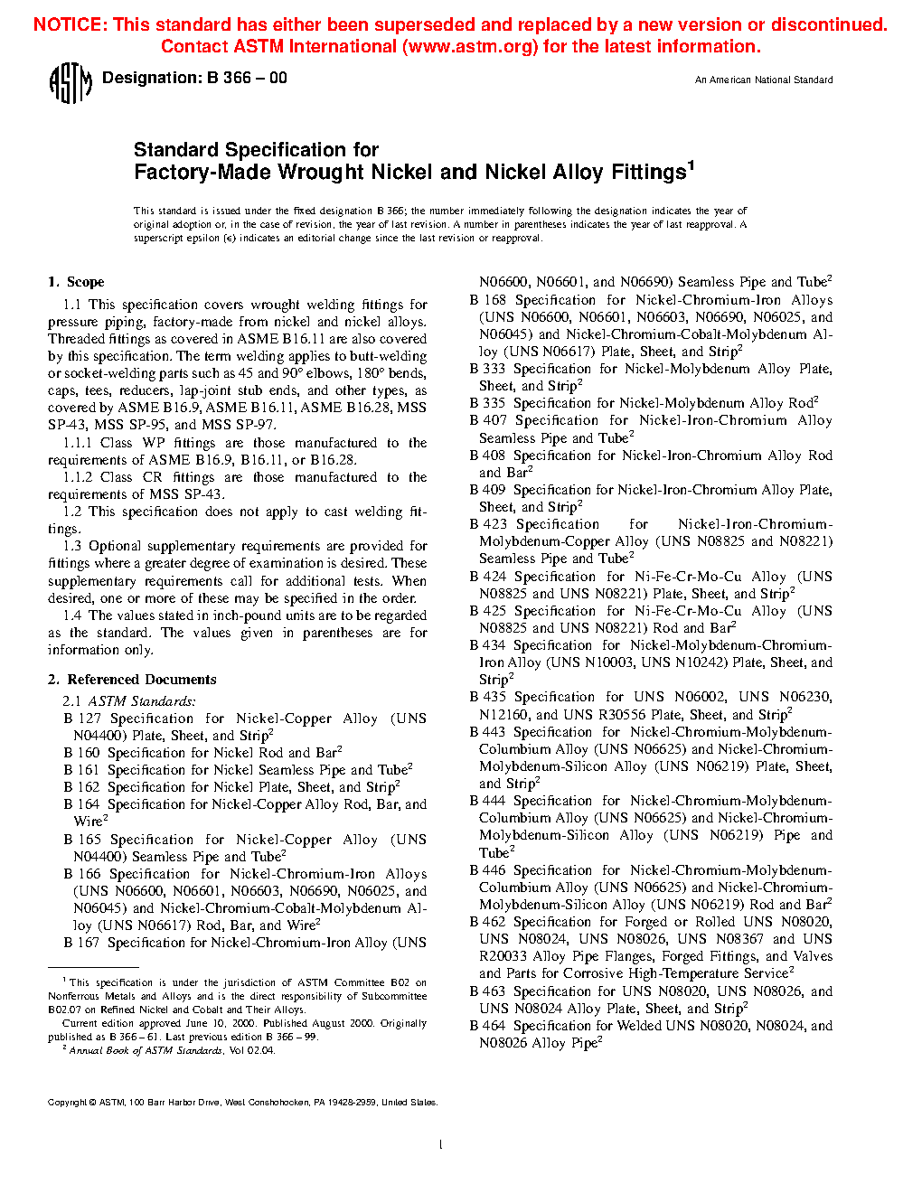 This specification covers wrought welding fittings, including threaded fittings, for pressure piping, factory-made from nickel and nickel alloys. The term welding applies to butt-welding or socket-welding parts such as elbows, bends, caps, tees, reducers, lap-joint, and stub ends. This specification does not apply to cast welding fittings. Grades of nickel and nickel alloys included in this specification are designated with a prefix, WP or CR, based on dimensional and rating standards. WP grades have class designations (Class S, Class W, Class WX, and Class WU) to indicate whether seamless or welded construction is utilized and to indicate the nondestructive test method and extent of nondestructive examination (such as radiography and/or ultrasonic test). The material for wrought welding fittings may consist of forgings, rods, bars, plates, sheets, and seamless or welded pipe that conform to all the specified requirements. Forging or shaping operations may be performed by hammering, pressing, piercing, extruding, upsetting, rolling, bending, or fusion welding, or by a combination of two or more of these operations. Chemical and product analyses shall conform to the chemical composition prescribed. Requirements for tensile properties, heat treatment, tension test, and dimensions are detailed. Hydrostatic testing of wrought fittings is not required by this specification.