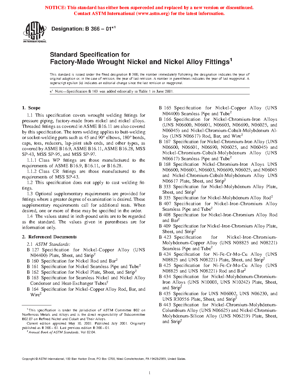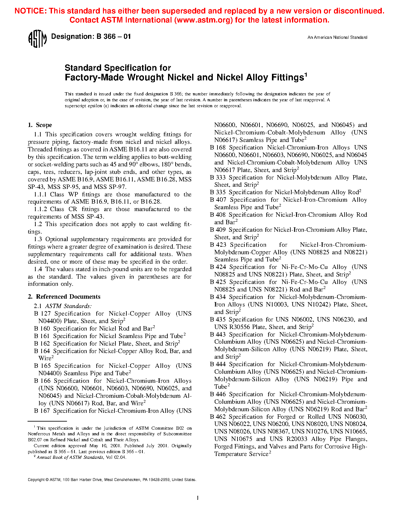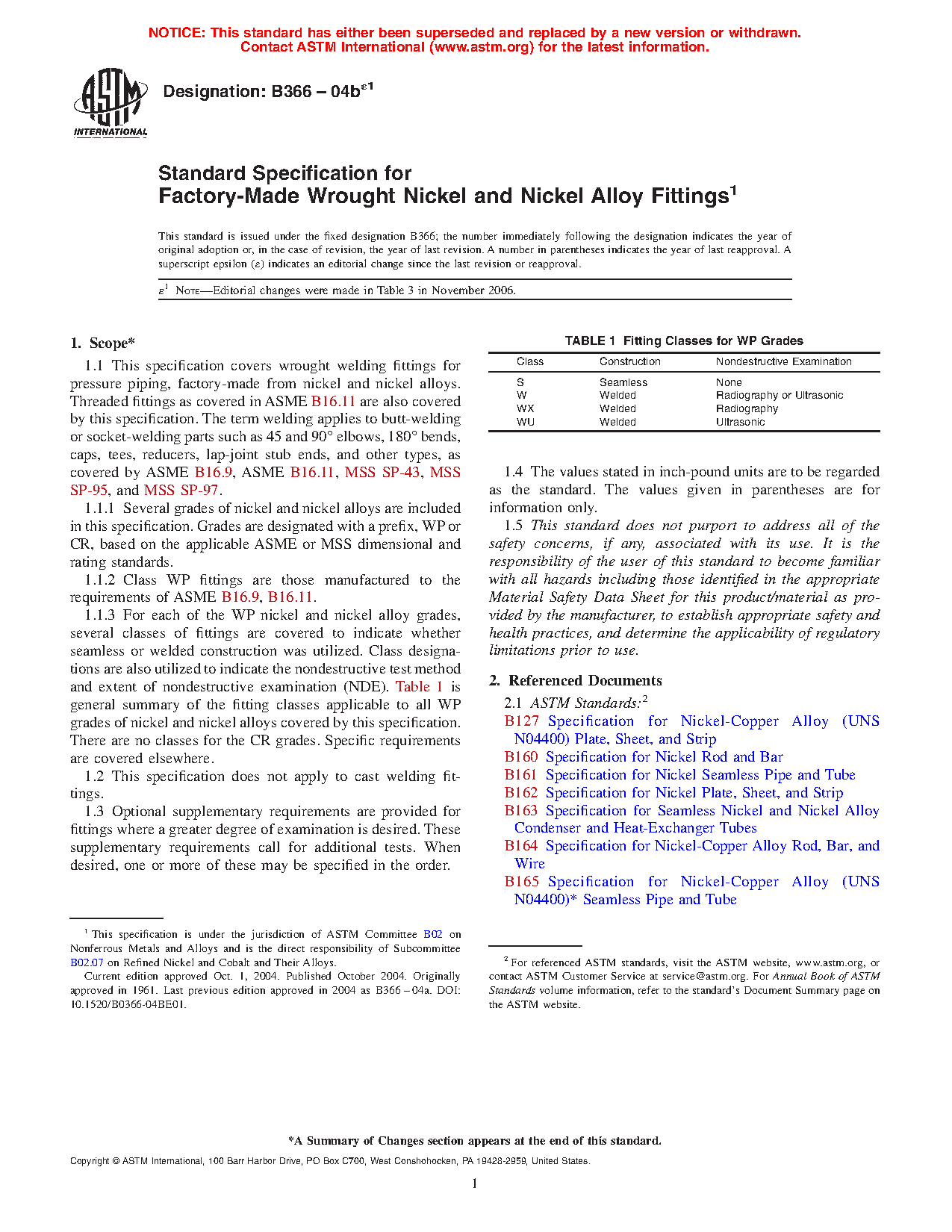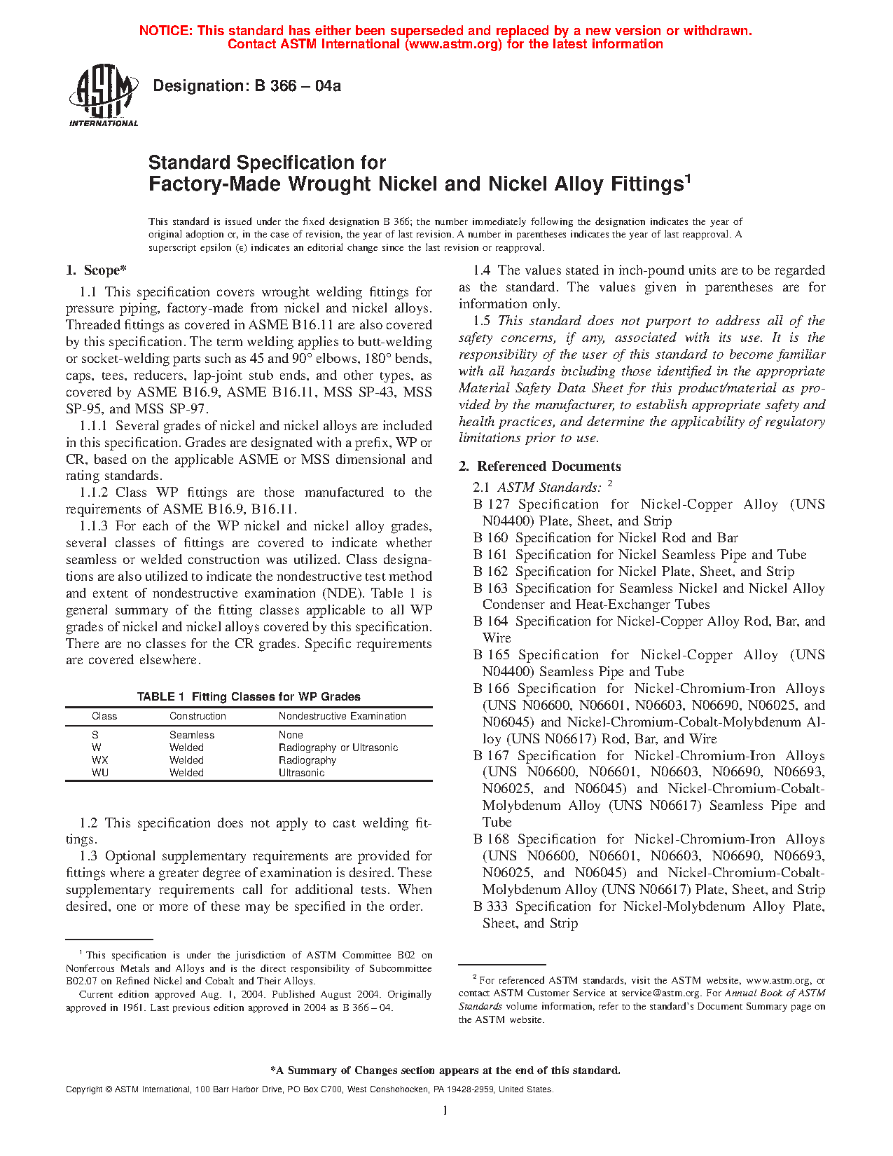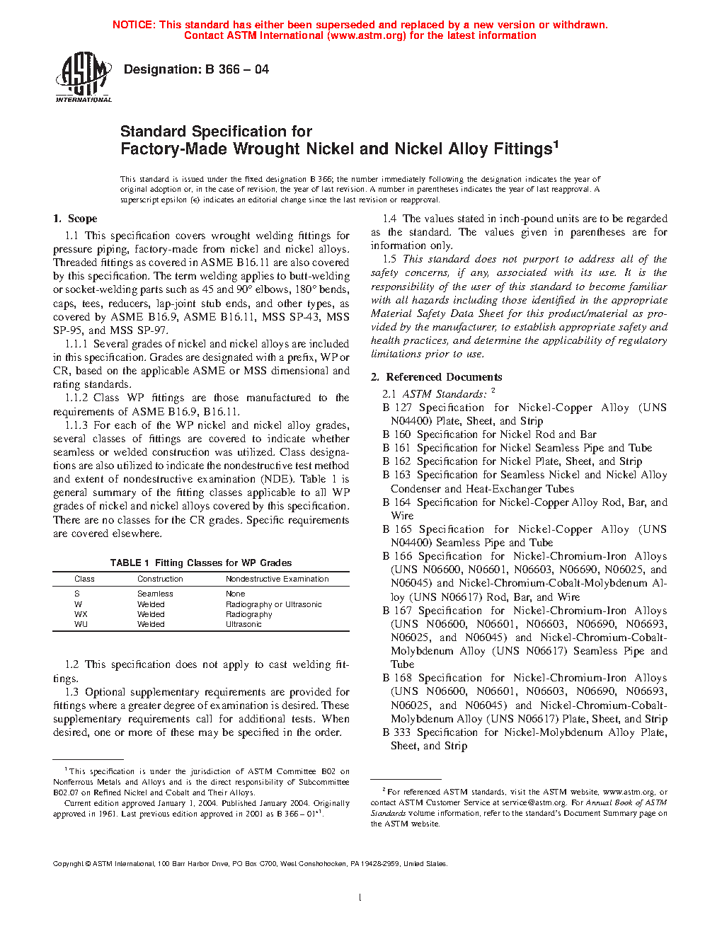 1.1.3 For each of the WP nickel and nickel alloy grades, several classes of fittings are covered to indicate whether seamless or welded construction was utilized. Class designations are also utilized to indicate the nondestructive test method and extent of nondestructive examination (NDE). Table 1 is general summary of the fitting classes applicable to all WP grades of nickel and nickel alloys covered by this specification. There are no classes for the CR grades. Specific requirements are covered elsewhere.