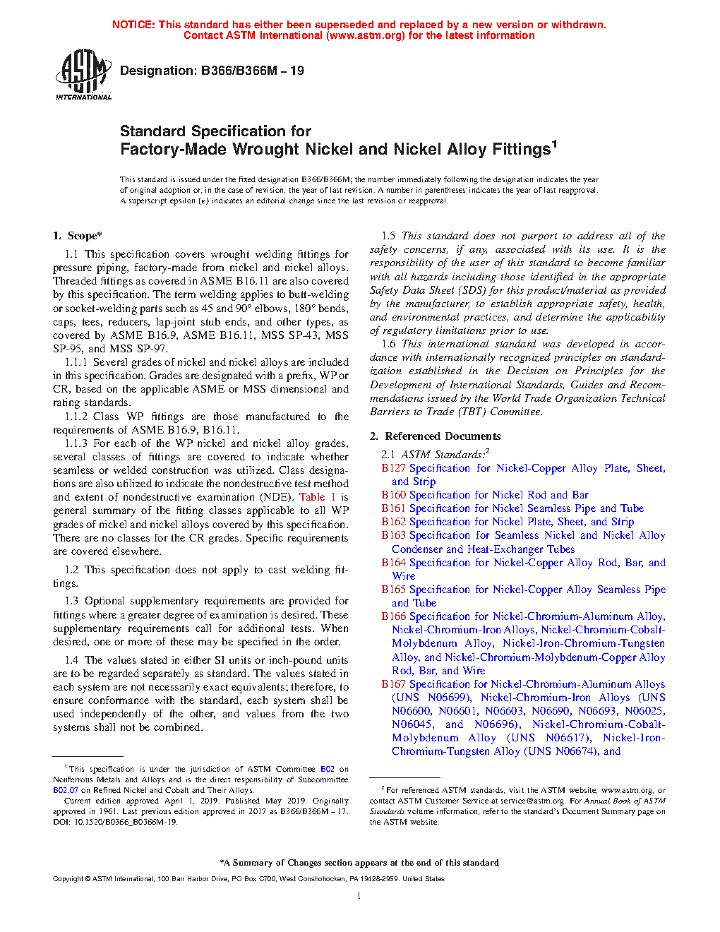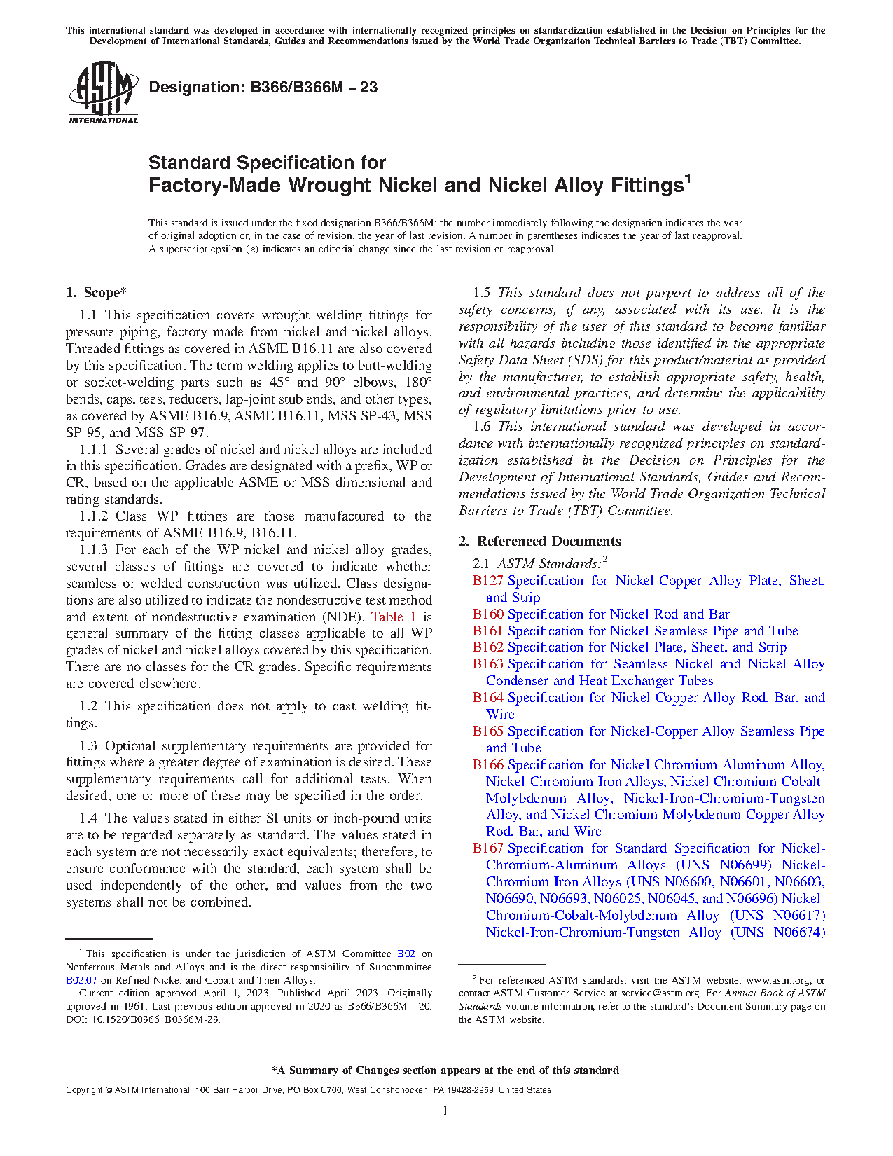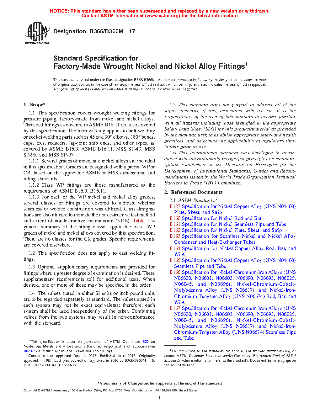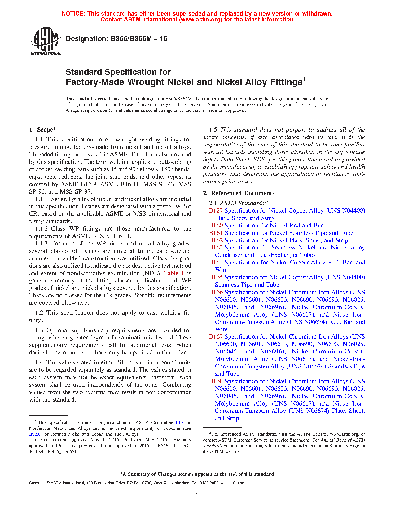 This specification covers wrought welding fittings, including threaded fittings, for pressure piping, factory-made from nickel and nickel alloys. The term welding applies to butt-welding or socket-welding parts such as elbows, bends, caps, tees, reducers, lap-joint, and stub ends. This specification does not apply to cast welding fittings. Grades of nickel and nickel alloys included in this specification are designated with a prefix, WP or CR, based on dimensional and rating standards. WP grades have class designations (Class S, Class W, Class WX, and Class WU) to indicate whether seamless or welded construction is utilized and to indicate the nondestructive test method and extent of nondestructive examination (such as radiography and/or ultrasonic test). The material for wrought welding fittings may consist of forgings, rods, bars, plates, sheets, and seamless or welded pipe that conform to all the specified requirements. Forging or shaping operations may be performed by hammering, pressing, piercing, extruding, upsetting, rolling, bending, or fusion welding, or by a combination of two or more of these operations. Chemical and product analyses shall conform to the chemical composition prescribed. Requirements for tensile properties, heat treatment, tension test, and dimensions are detailed. Hydrostatic testing of wrought fittings is not required by this specification.
