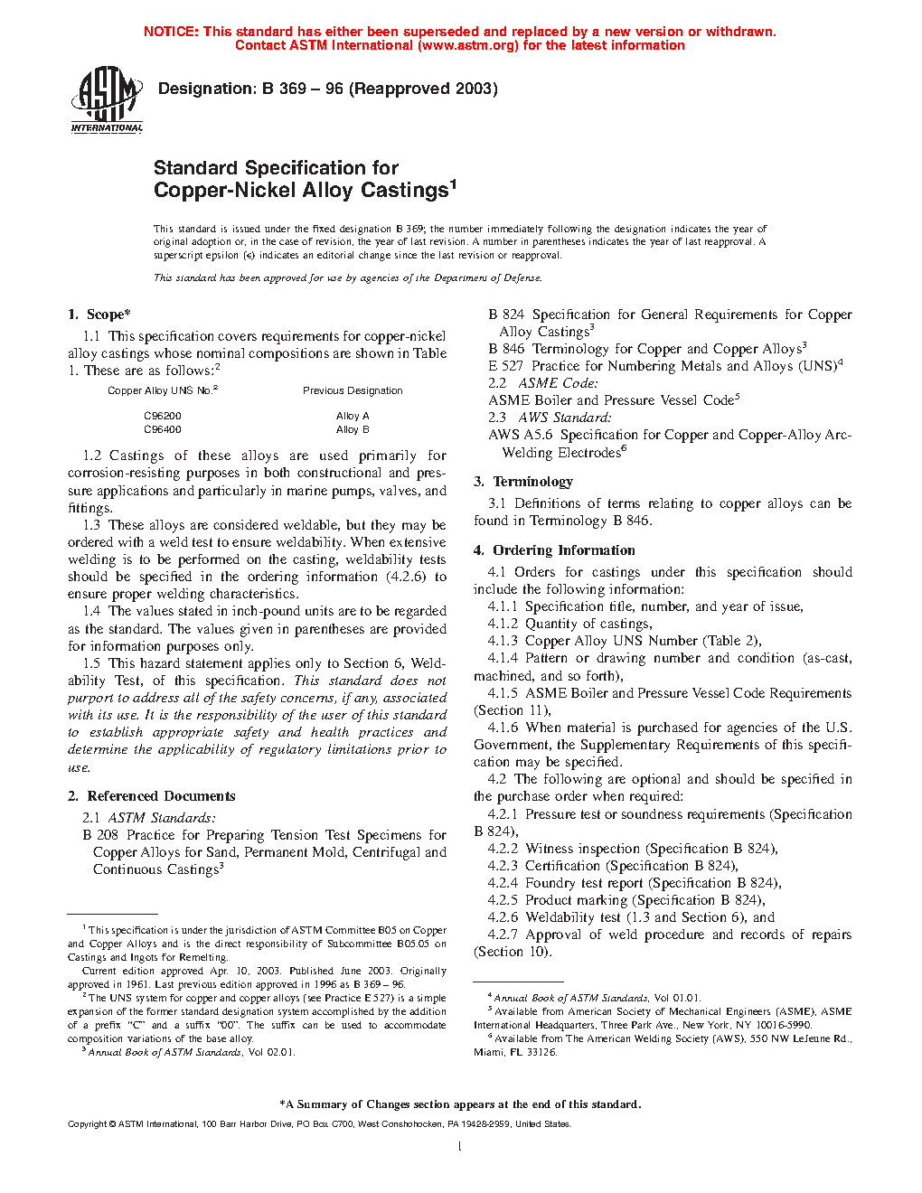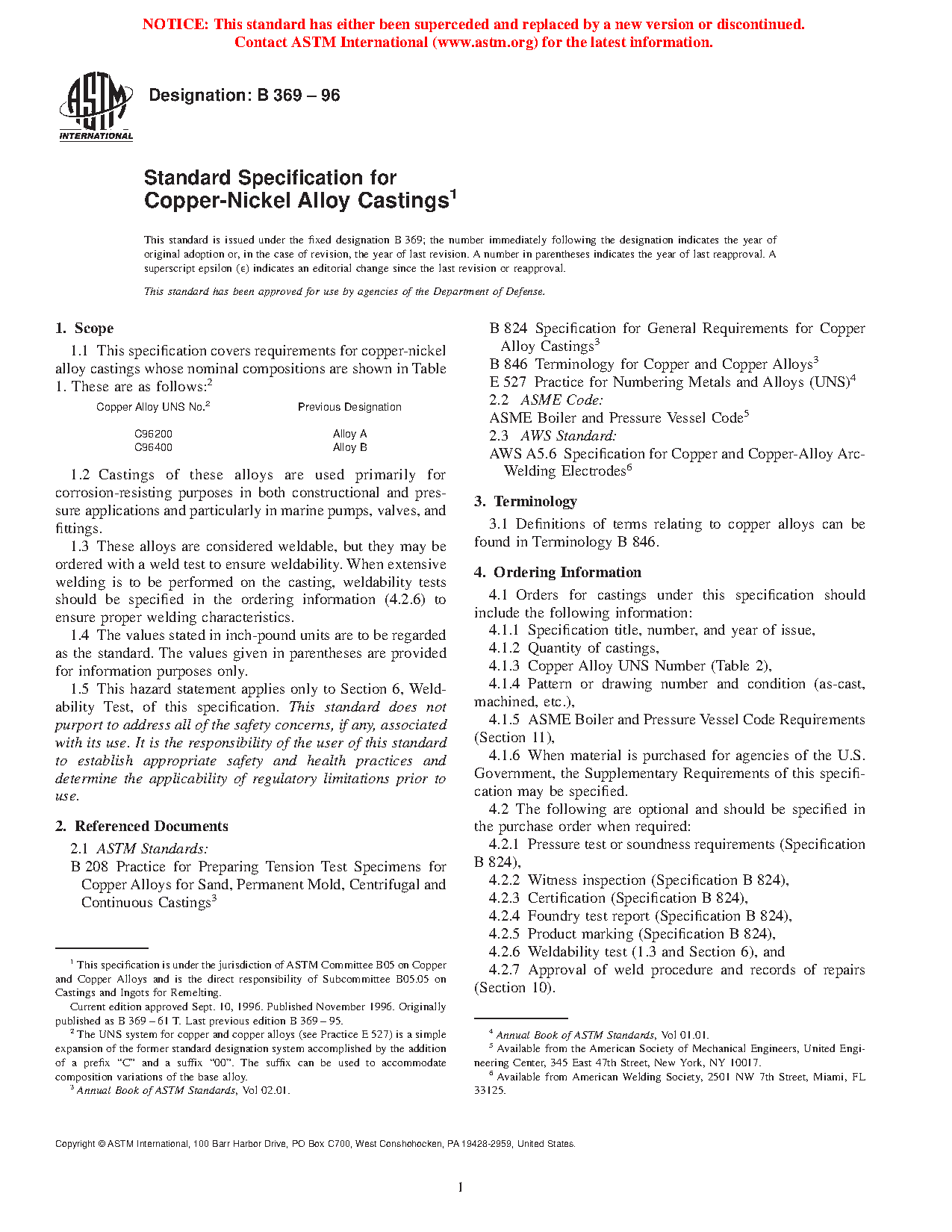 1.3 These alloys are considered weldable, but they may be ordered with a weld test to ensure weldability. When extensive welding is to be performed on the casting, weldability tests should be specified in the ordering information (5.2.6) to ensure proper welding characteristics.
