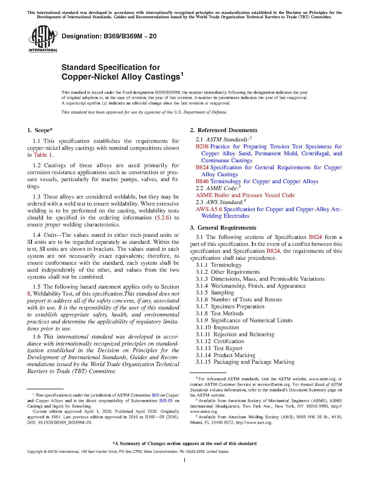 1.1 This specification establishes the requirements for copper-nickel alloy castings with nominal compositions shown in Table 1.