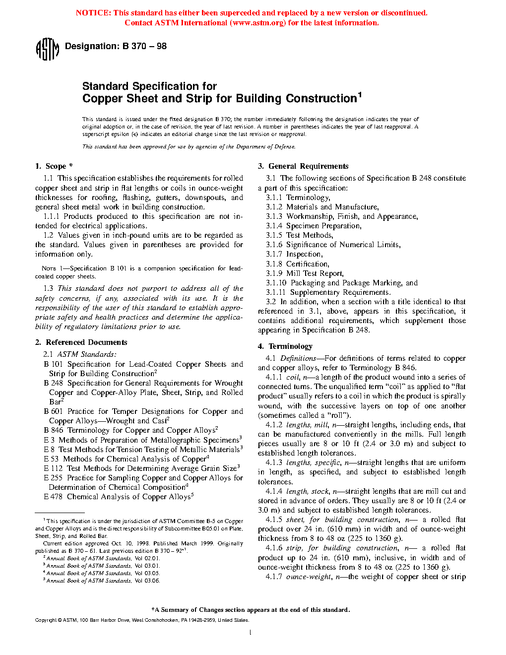 Note 1: Specification B101 is an associated specification for lead-coated copper sheets and strip for building construction.