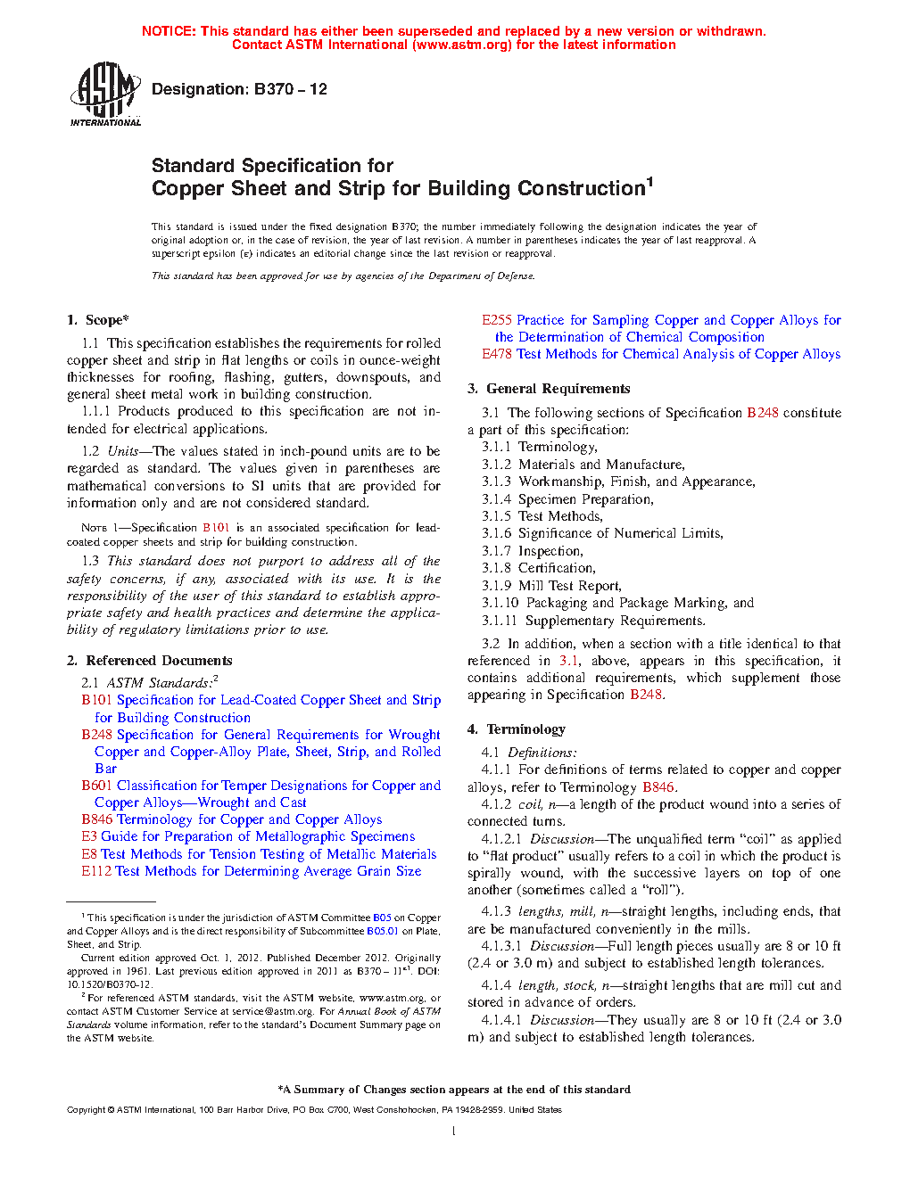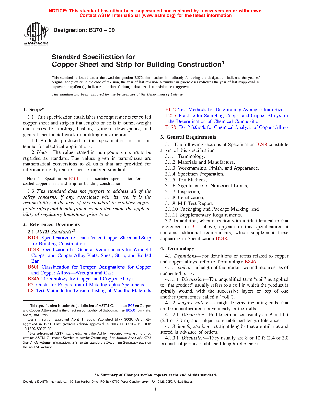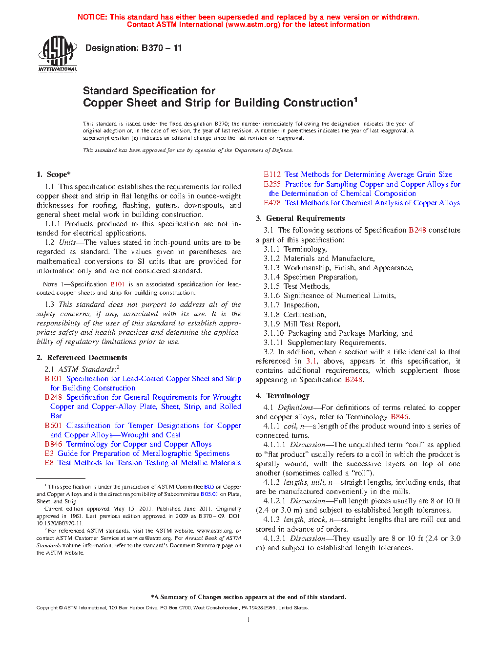 1.1 This specification establishes the requirements for rolled copper sheet and strip in flat lengths or coils in ounce-weight thicknesses for roofing, cladding, flashings, gutters, downspouts, and general sheet metal work for building construction.