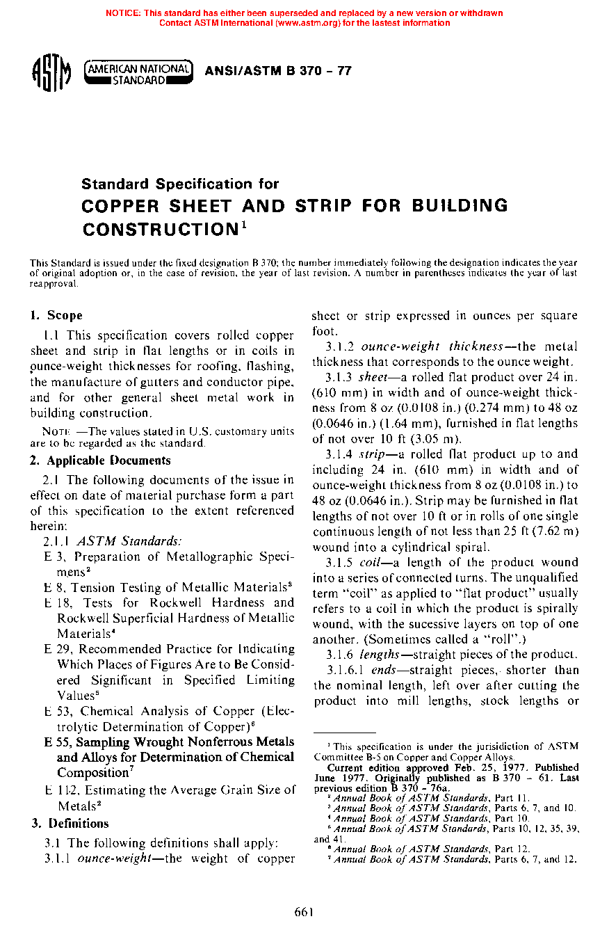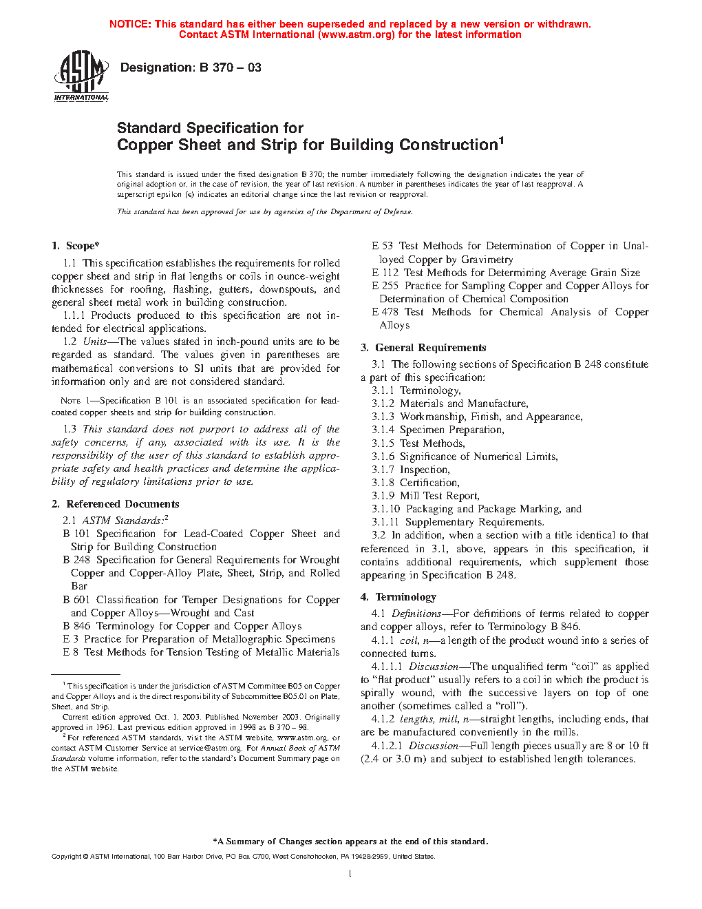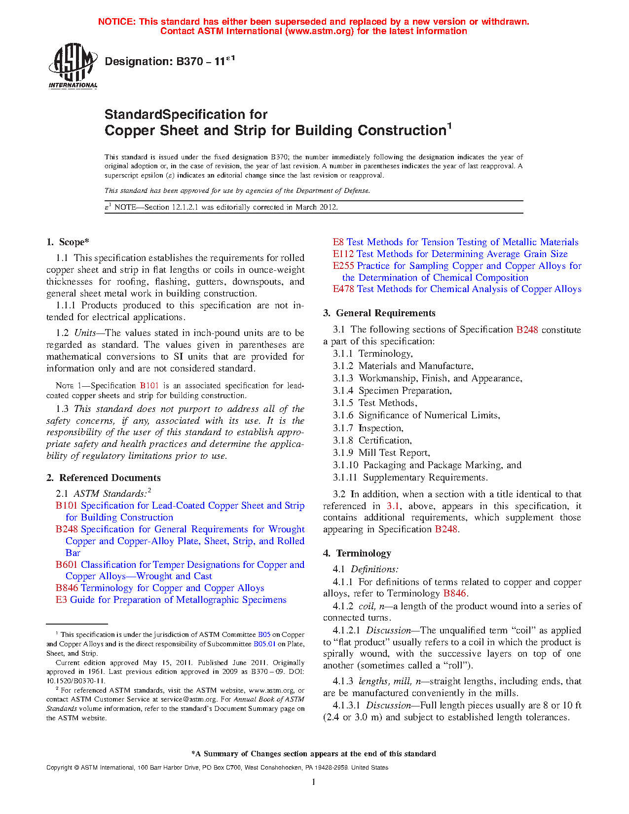 1.1 This specification establishes the requirements for rolled copper sheet and strip in flat lengths or coils in ounce-weight thicknesses for roofing, cladding, flashings, gutters, downspouts, and general sheet metal work for building construction.