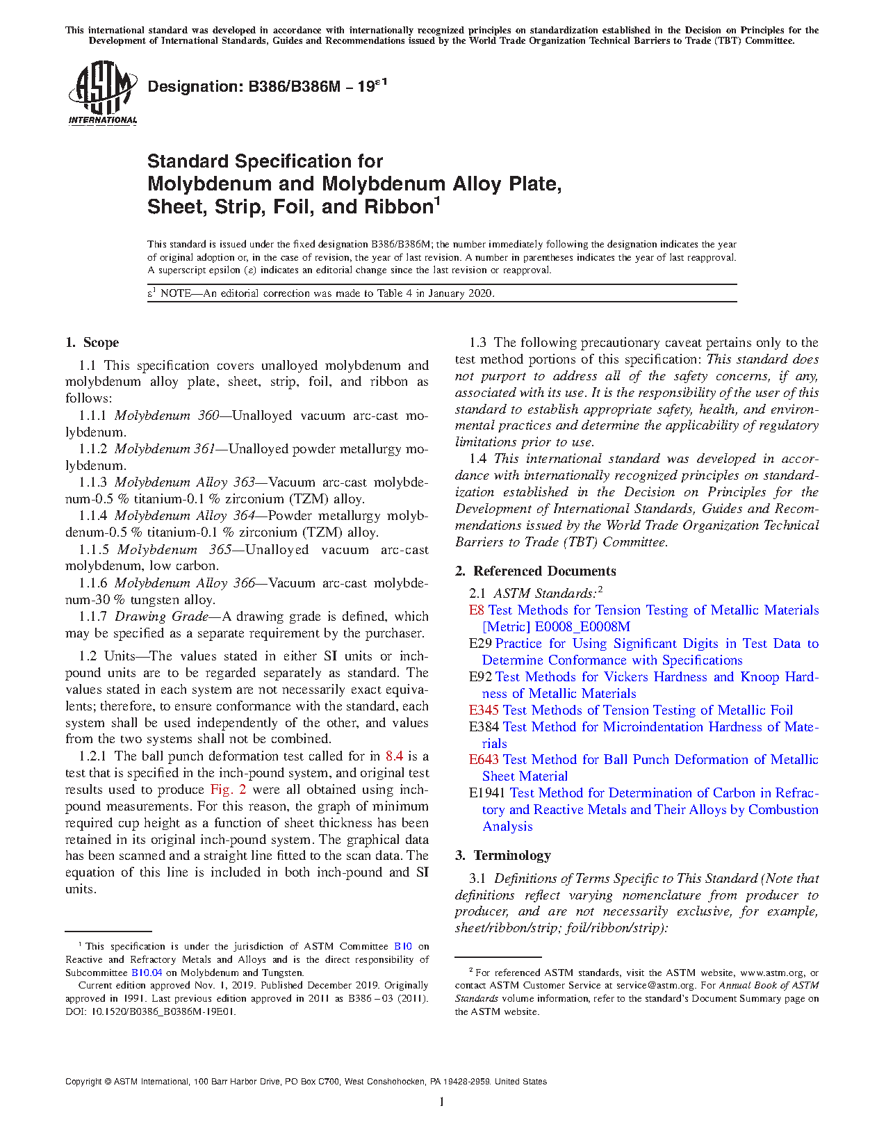This specification covers unalloyed molybdenum and molybdenum alloy plate, sheet, strip, and foil as follows: Molybdenum 360; Molybdenum 361; Molybdenum Alloy 363; Molybdenum Alloy 364; Molybdenum 365; and Molybdenum Alloy 366. The various molybdenum mill products covered by this specification shall be formed with the conventional extrusion, forging, or rolling equipment normally found in primary ferrous and nonferrous plants. The ingot metal for Molybdenum 360 and 365 and Molybdenum Alloys 363 and 366 is vacuum arc-melted in furnaces of a type suitable for reactive, refractory metals. For Molybdenum 361 and Molybdenum Alloy 364, the metal is consolidated by powder metallurgy methods. The molybdenum and molybdenum alloy ingots and billets for conversion to finished products covered by this specification shall conform to the chemical composition requirements for carbon, oxygen, nitrogen, iron, nickel, silicon, titanium, tungsten, zirconium, and molybdenum. The material shall conform to the mechanical property requirements for tensile strength, yield strength, elongation, and minimum bend radius.
