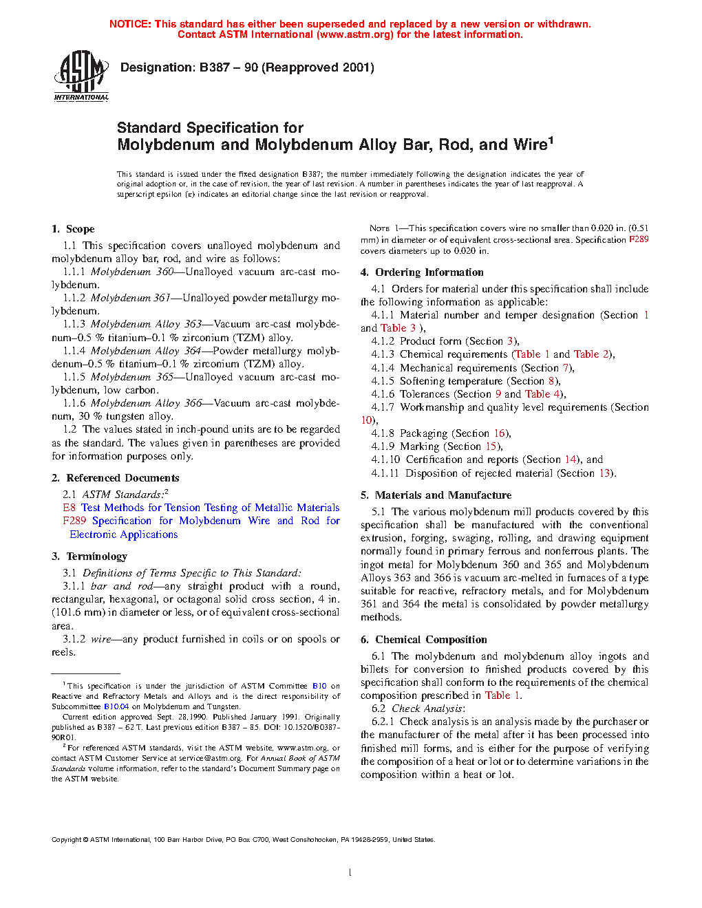 1.1 This specification covers unalloyed molybdenum and molybdenum alloy bar, rod, and wire as follows: