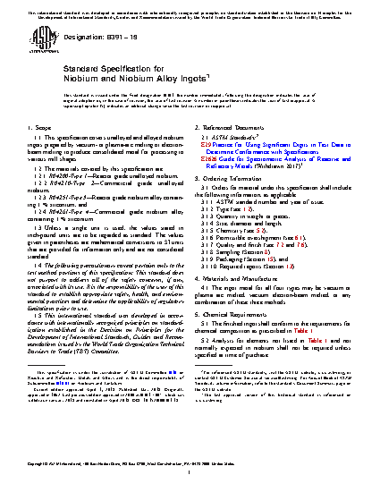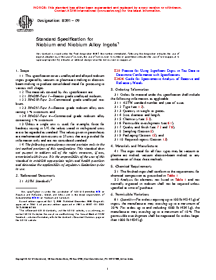 1.1 This specification covers unalloyed and alloyed niobium ingots prepared by vacuum- or plasma-arc melting or electron-beam melting to produce consolidated metal for processing to various mill shapes.