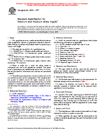 1.1 This specification covers unalloyed and alloyed niobium ingots prepared by vacuum- or plasma-arc melting or electron-beam melting to produce consolidated metal for processing to various mill shapes.