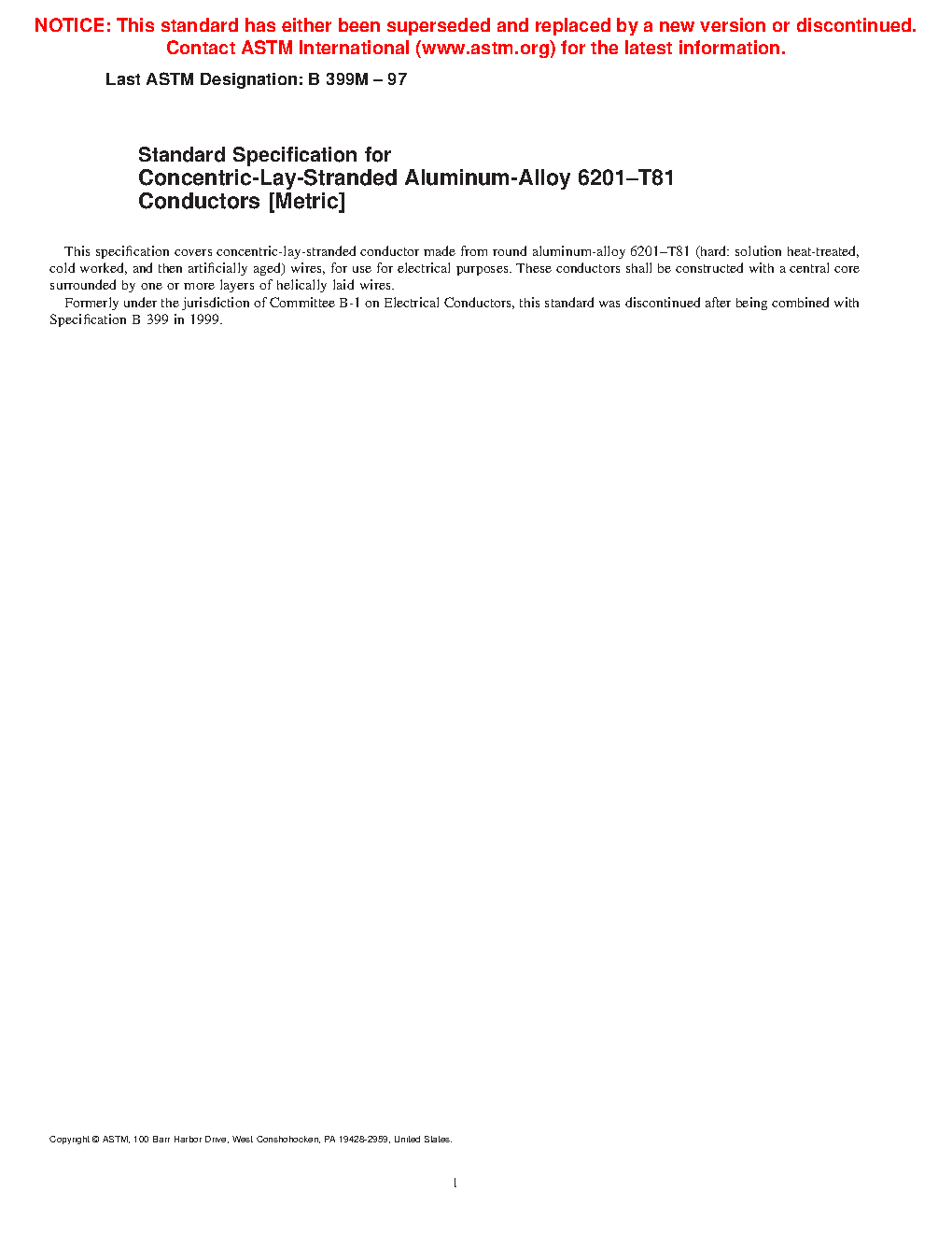 Standard Specification for Concentric-Lay-Stranded Aluminum-Alloy 6201-T81 Conductors [Metric] (Withdrawn 1999)